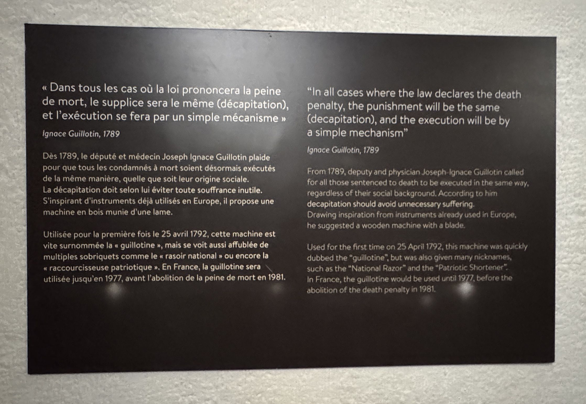 Впервые использованная 25 апреля 1792 года, эта машина быстро получила прозвище «гильотина», но также имела множество прозвищ, таких как «национальная бритва» или «патриотический укоротитель». Во Франции гильотина использовалась до 1977 года, до отмены смертной казни в 1981 году.