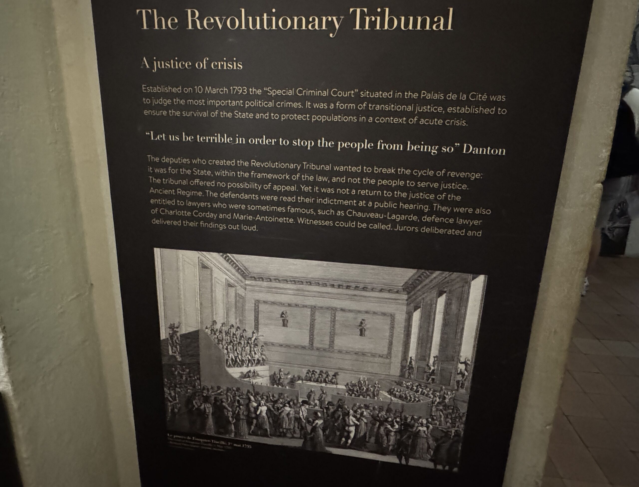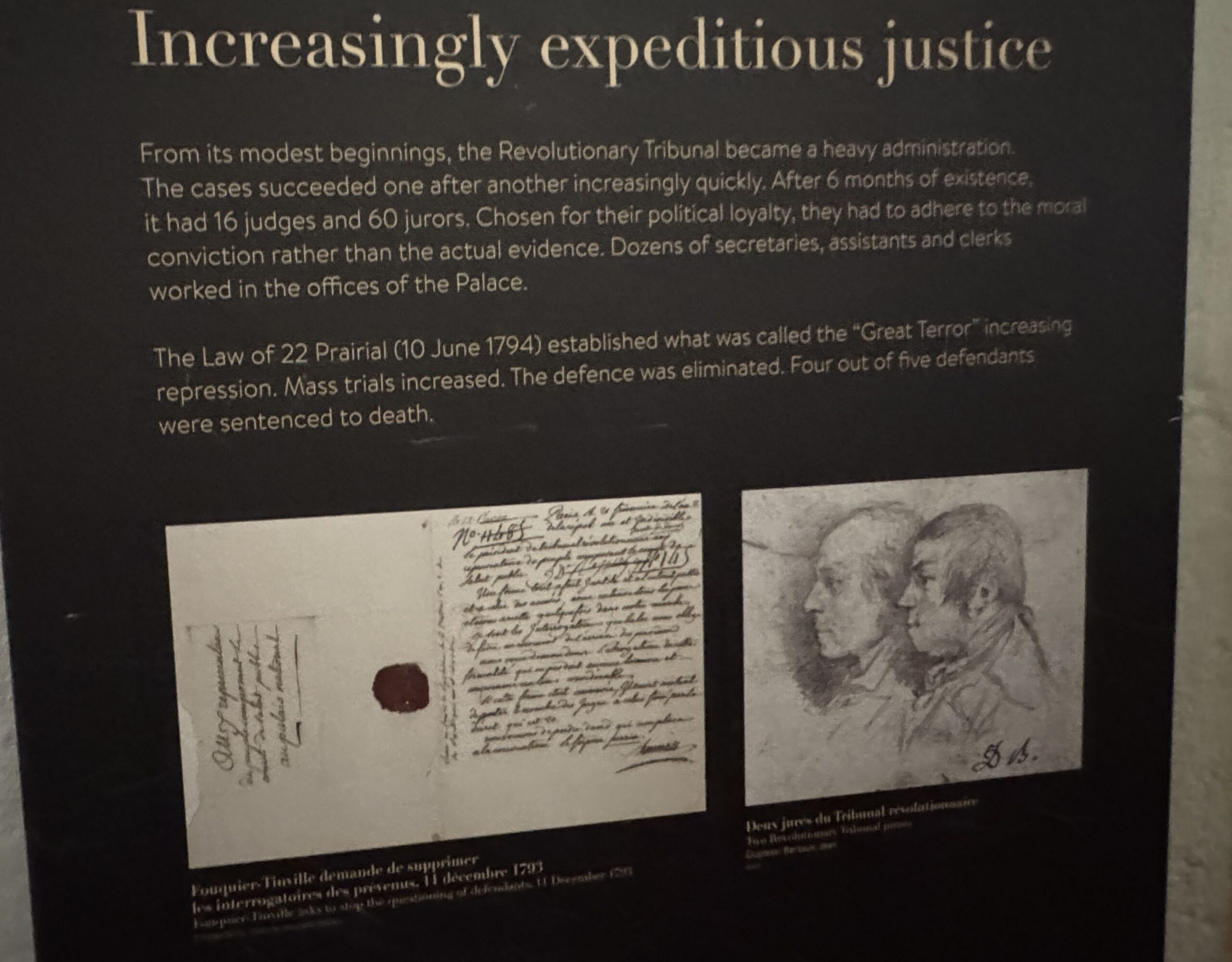 Консьержери, заключенные которой были убиты в сентябре 1792 года, весной 1793 года стала местом революционного правосудия. Здесь заседал Революционный трибунал, созданный для рассмотрения политических преступлений. Когда во Франции разразилась гражданская война, тюрьма быстро заполнилась многочисленными «подозреваемыми», обвиняемыми в угрозе Республике. Обвиняемых судили в бывшей Большой палате Парижского парламента, переименованной в Зал Свободы, или в Зал Равенства. На том же этаже многочисленные секретари и клерки отвечали за подготовку работы прокурора Фукье-Тенвиля, настоящего архитектора судебных процессов.