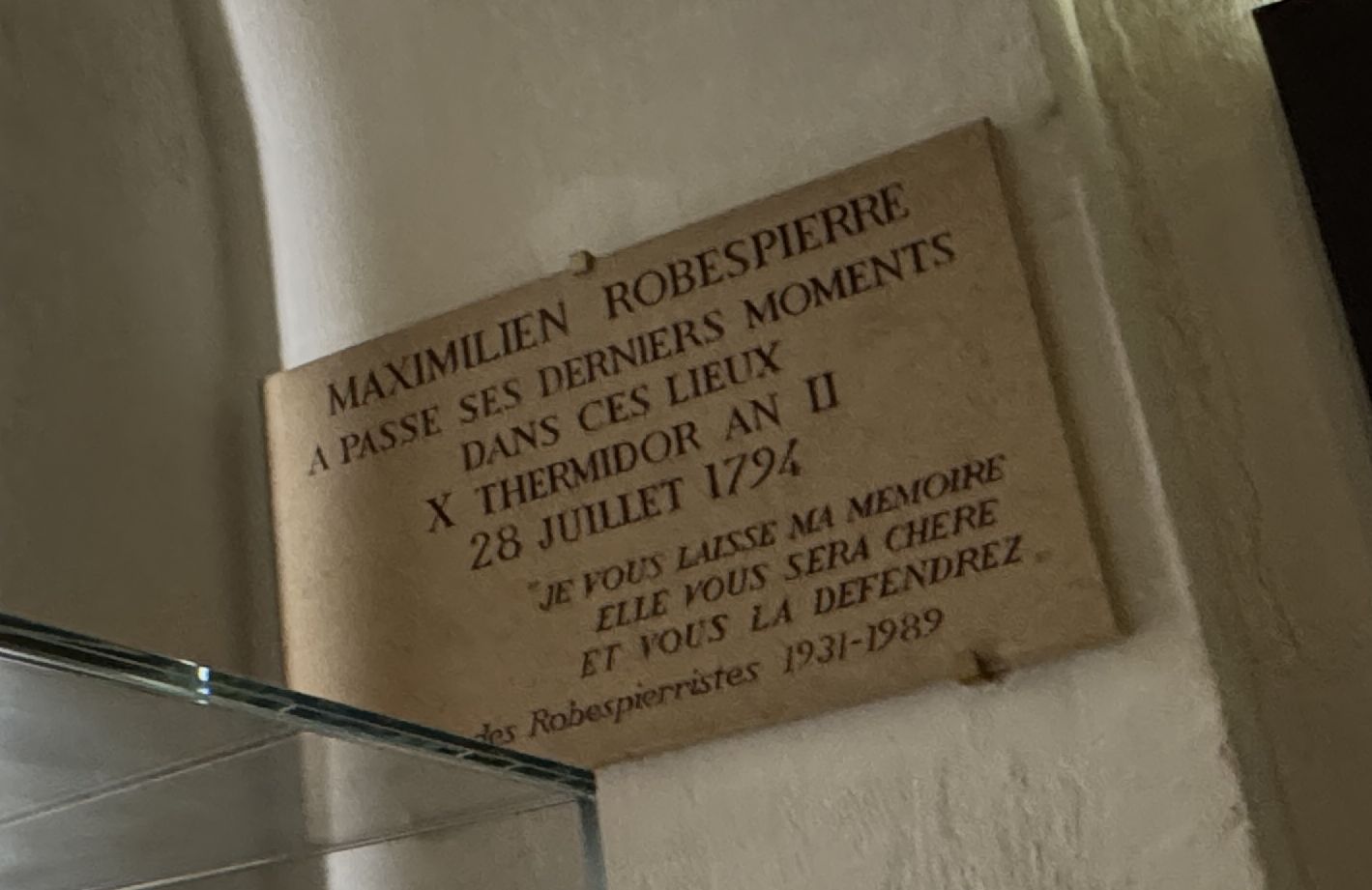 «ЗДЕСЬ МАКСИМИЛЬЕН РОБЕСПЬЕР ПРОВЕЛ СВОИ ПОСЛЕДНИЕ МГНОВЕНИЯ. X ТЕРМИДОР ГОД II 28 ИЮЛЯ 1794 ГОДА. «Я ОСТАВЛЯЮ ТЕБЕ СВОЮ ПАМЯТЬ. ОНА БУДЕТ ДОРОГА ДЛЯ ТЕБЯ, И ТЫ БУДЕШЬ ЕЕ ЗАЩИЩАТЬ.» Робеспьеристы 1931-1989″