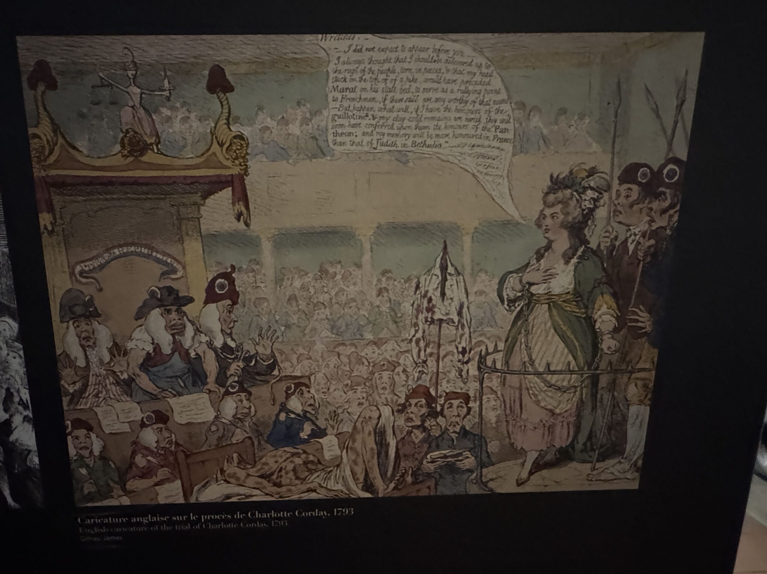 Шарлотта Корде удивляет нас. Монтаньяры очерняют её образ, изображая дегенеративной и высокомерной, и делают Марата мучеником Революции. Её трансгрессивный поступок, совершённый в домашней обстановке, — это повод криминализировать политическую деятельность женщин. «Я отомстила за множество невинных жертв. Я предотвратила множество других бедствий. Люди, однажды разочаровавшись, возрадуются избавлению от тирана.» Из письма отцу, написанного Шарлоттой в Консьержери 16 июля 1793 года.
