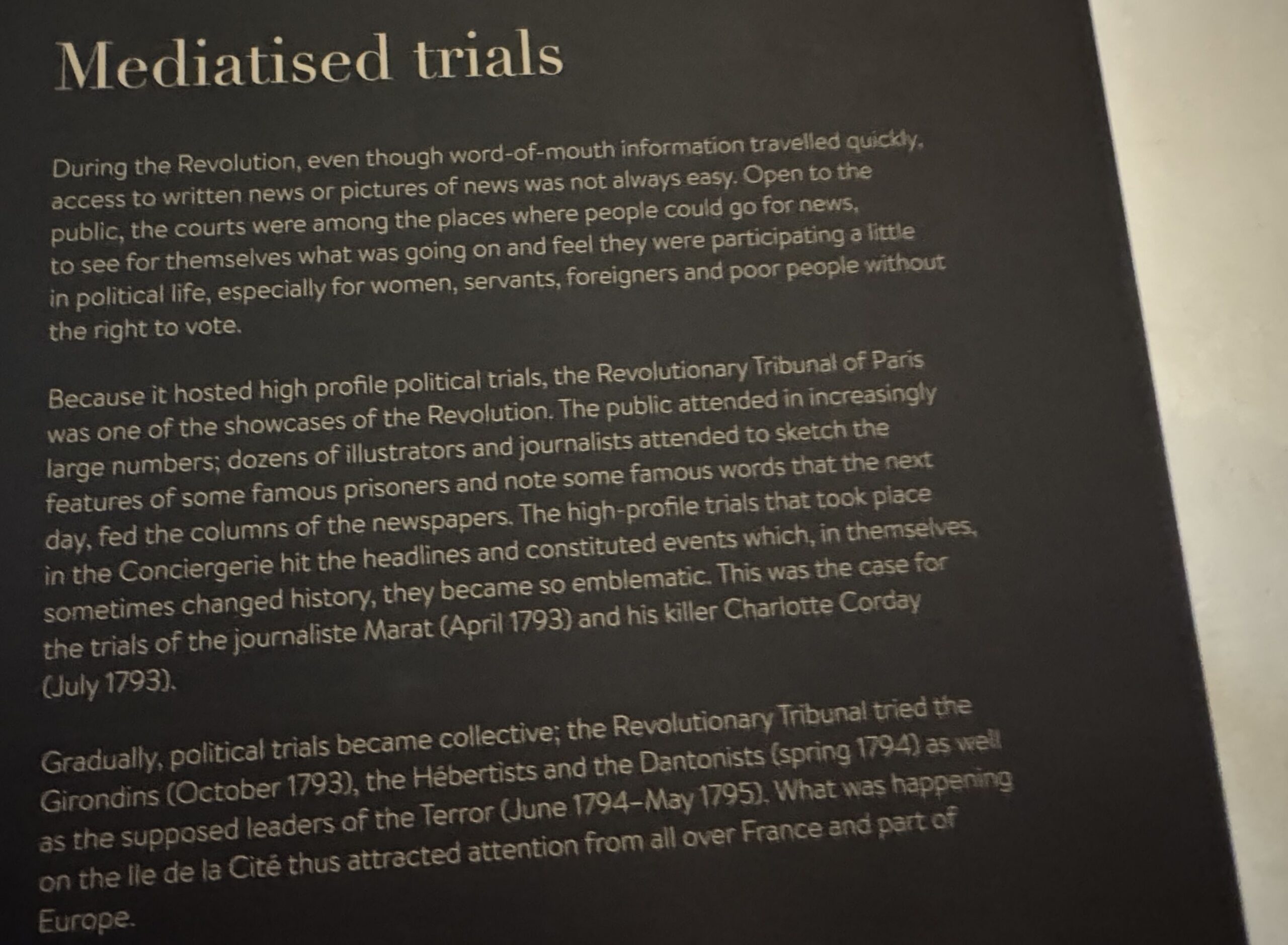Парижский Революционный трибунал, где проходили громкие политические процессы, стал одним из ярких примеров Революции. Публика приходила всё чаще; десятки художников и журналистов приходили, чтобы зарисовать лица известных заключённых и записать знаменитые слова, которые на следующий день мелькали на страницах газет. Громкие судебные процессы, проходившие в Консьержери, попадали в заголовки газет и становились событиями, которые сами по себе порой меняли ход истории – настолько они были символичны. Таковы были судебные процессы над журналистом Маратом (апрель 1793 года) и его убийцей Шарлоттой Корде (июль 1793 года).