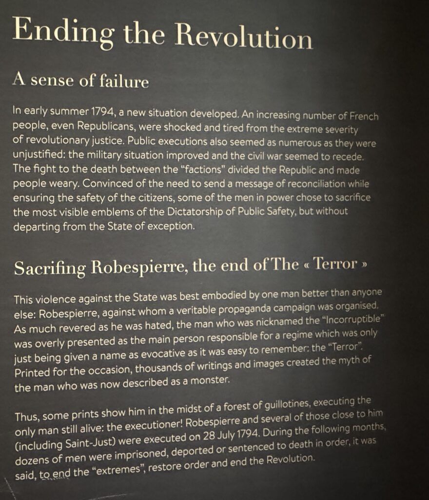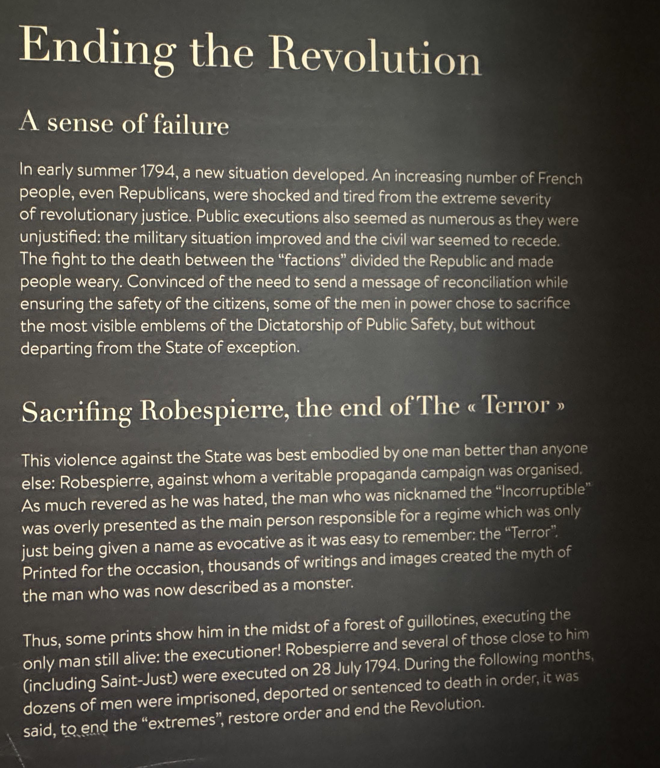 Окончание революции. Чувство неудачи. В начале лета 1794 года сложилась новая ситуация. Всё больше французов, даже республиканцев, были потрясены и утомлены крайней суровостью революционного правосудия. Публичные казни казались столь же многочисленными, сколь и неоправданными: военная ситуация улучшилась, а гражданская война, казалось, отступила. Смертельная борьба между «фракциями» расколола Республику и утомила людей. Убеждённые в необходимости послать сигнал о примирении, одновременно обеспечив безопасность граждан, некоторые из власть имущих решили пожертвовать наиболее заметными символами Диктатуры общественного спасения, не отступая при этом от режима чрезвычайного положения.