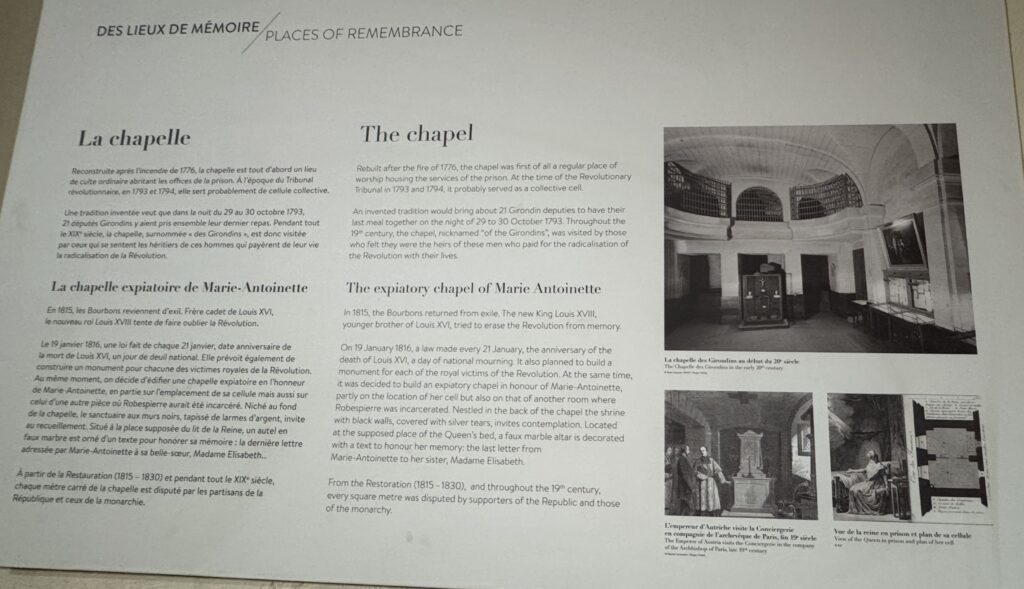 19 января 1816 года был принят закон, объявляющий каждое 21 января, годовщину смерти Людовика XVI, днём национального траура. Также было запланировано возведение памятника каждой королевской жертве Революции. В то же время было решено построить часовню в честь Марии-Антуанетты, частично на месте её камеры, а также в другой комнате, где был заключён Робеспьер. Расположенная в глубине часовни гробница с чёрными стенами, покрытыми серебряными слезами, располагает к размышлениям. На месте предполагаемого ложа королевы находится алтарь из искусственного мрамора, украшенный текстом в память о ней: последним письмом Марии-Антуанетты к её сестре, мадам Елизавете.