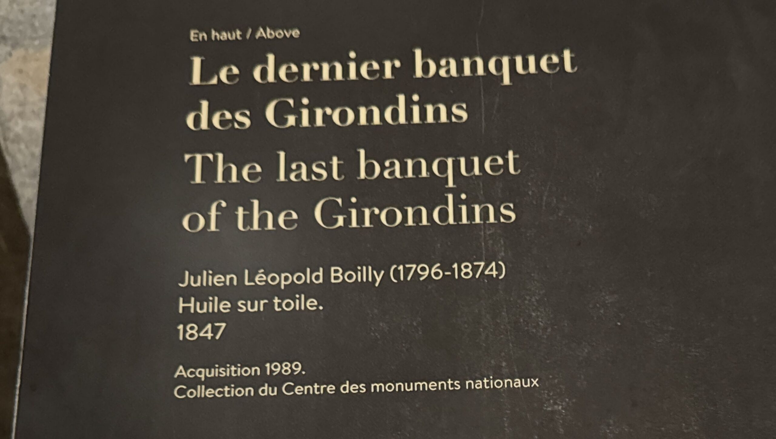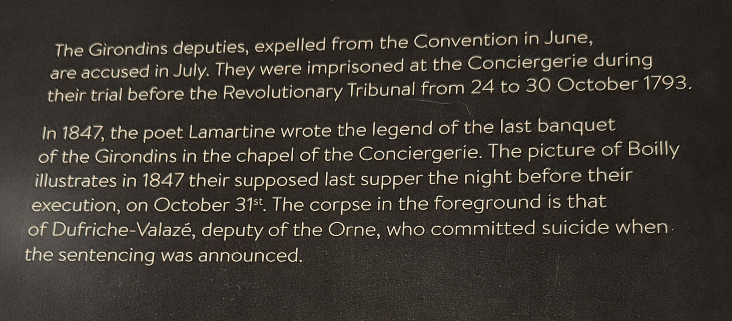 В 1847 году поэт Ламартин написал легенду о последнем пире жирондистов в часовне Консьержери. Картина Буальи, написанная в 1847 году, изображает их предполагаемый последний ужин накануне казни, 31 октября. Тело на переднем плане — Дюфриш-Валазе, депутат Орна, покончивший с собой после оглашения приговора.