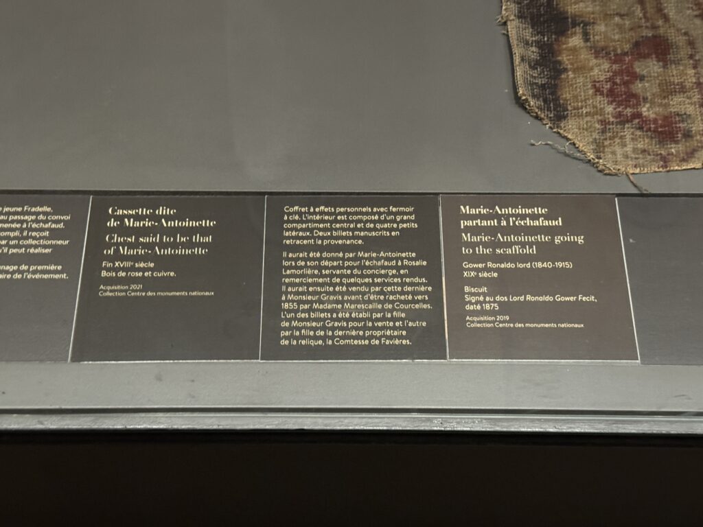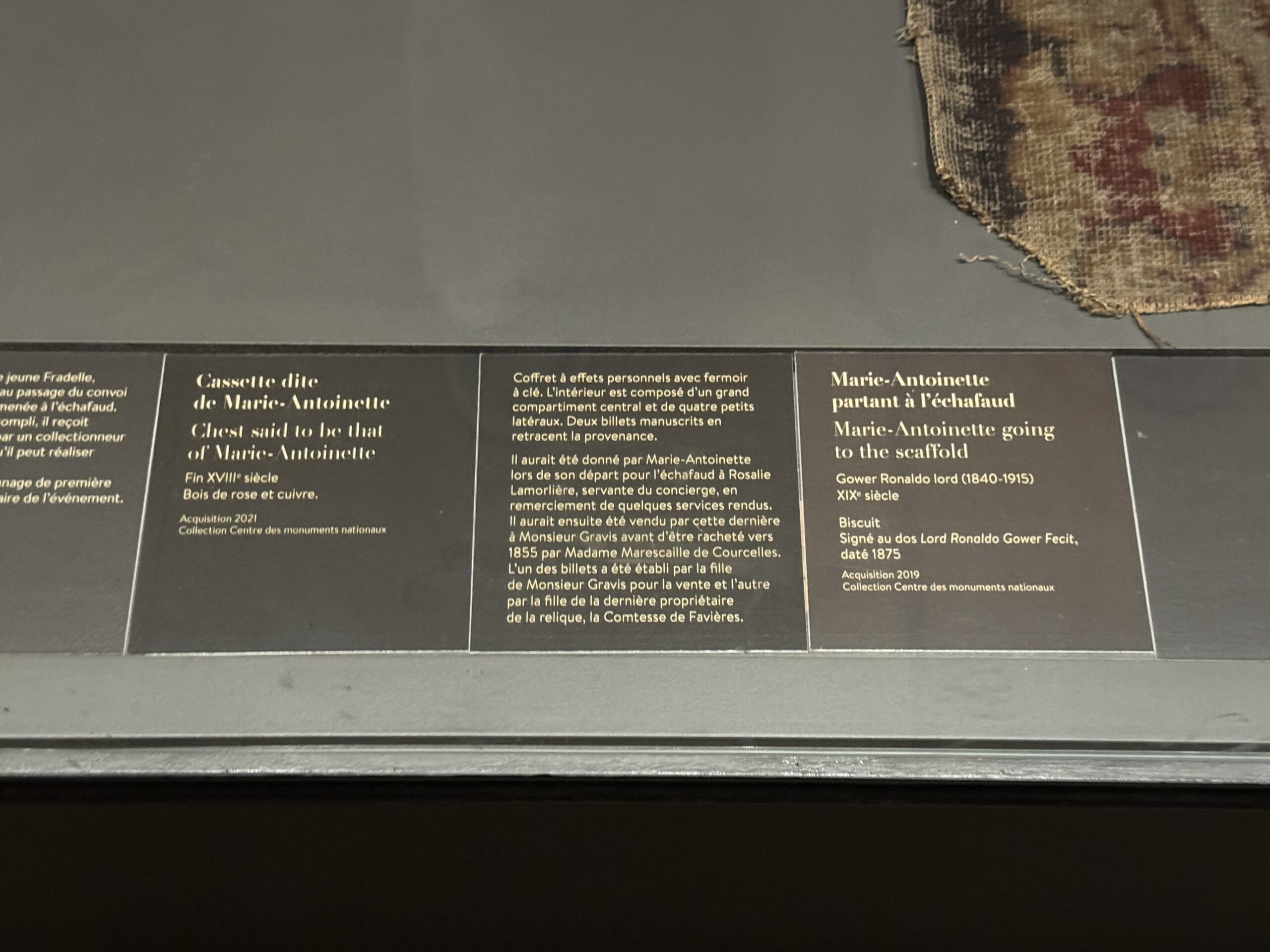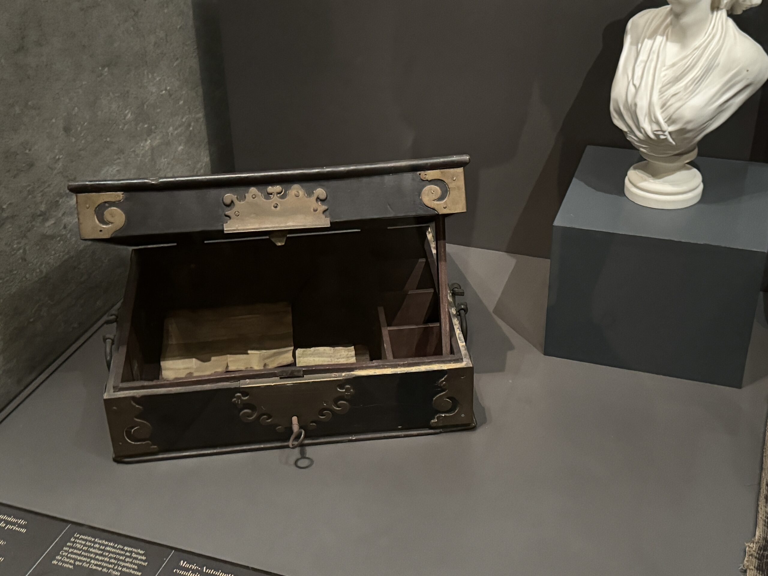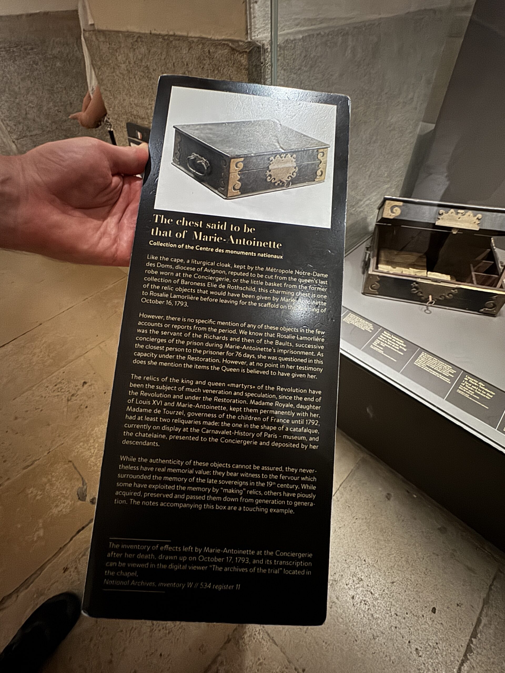 Как и накидка, литургический плащ, хранящийся в митрополии Нотр-Дам-де-Дом, епархии Авиньона, который, как говорят, был сшит из последнего одеяния королевы, которое она носила в Консьержери, или маленькая корзинка из бывшей коллекции баронессы Эли де Ротшильд, этот очаровательный сундук является одним из реликвий, которые Мария-Антуанетта передала Розали Ламорльер перед тем, как та отправилась на эшафот 16 октября 1793 года.