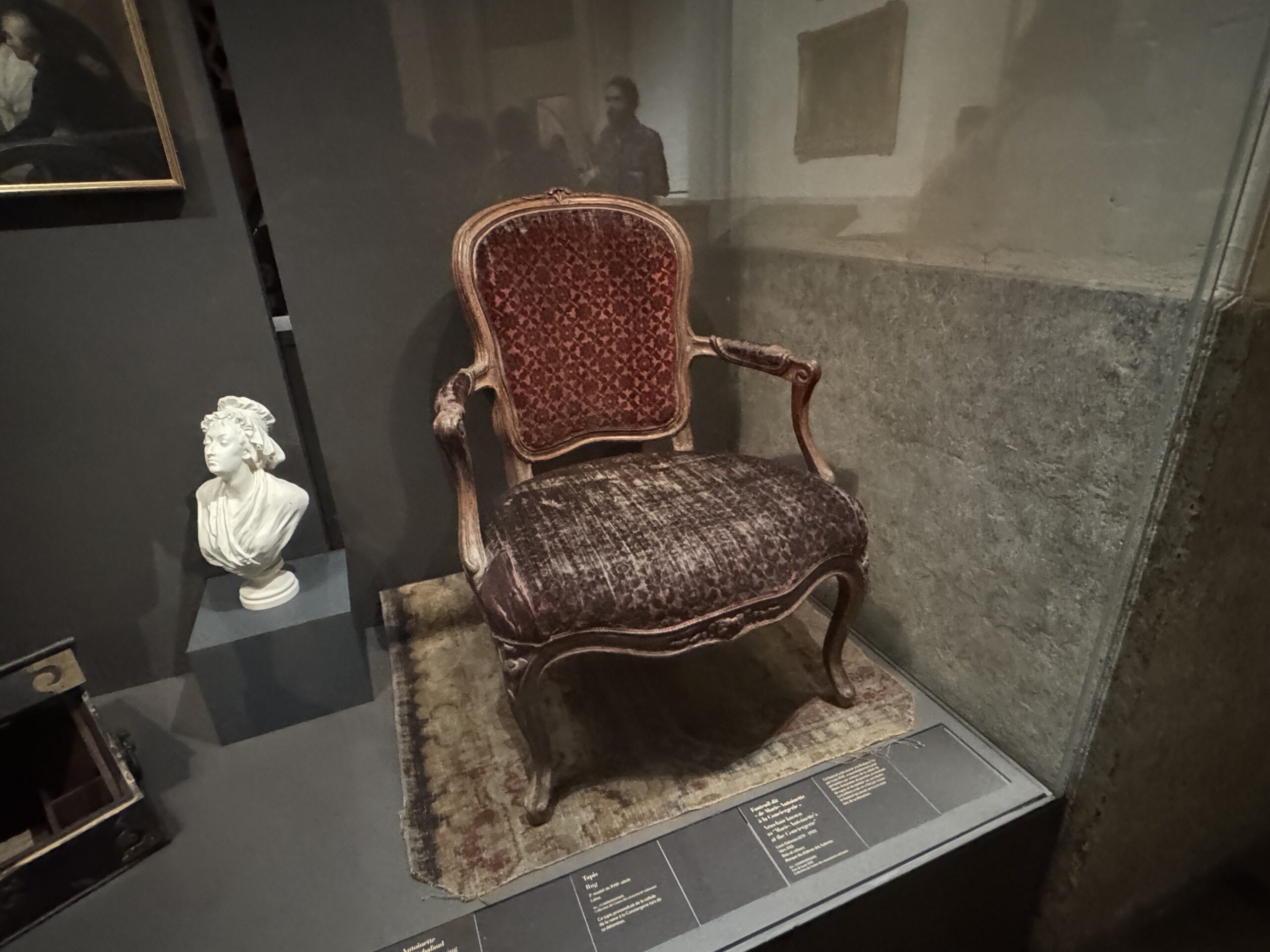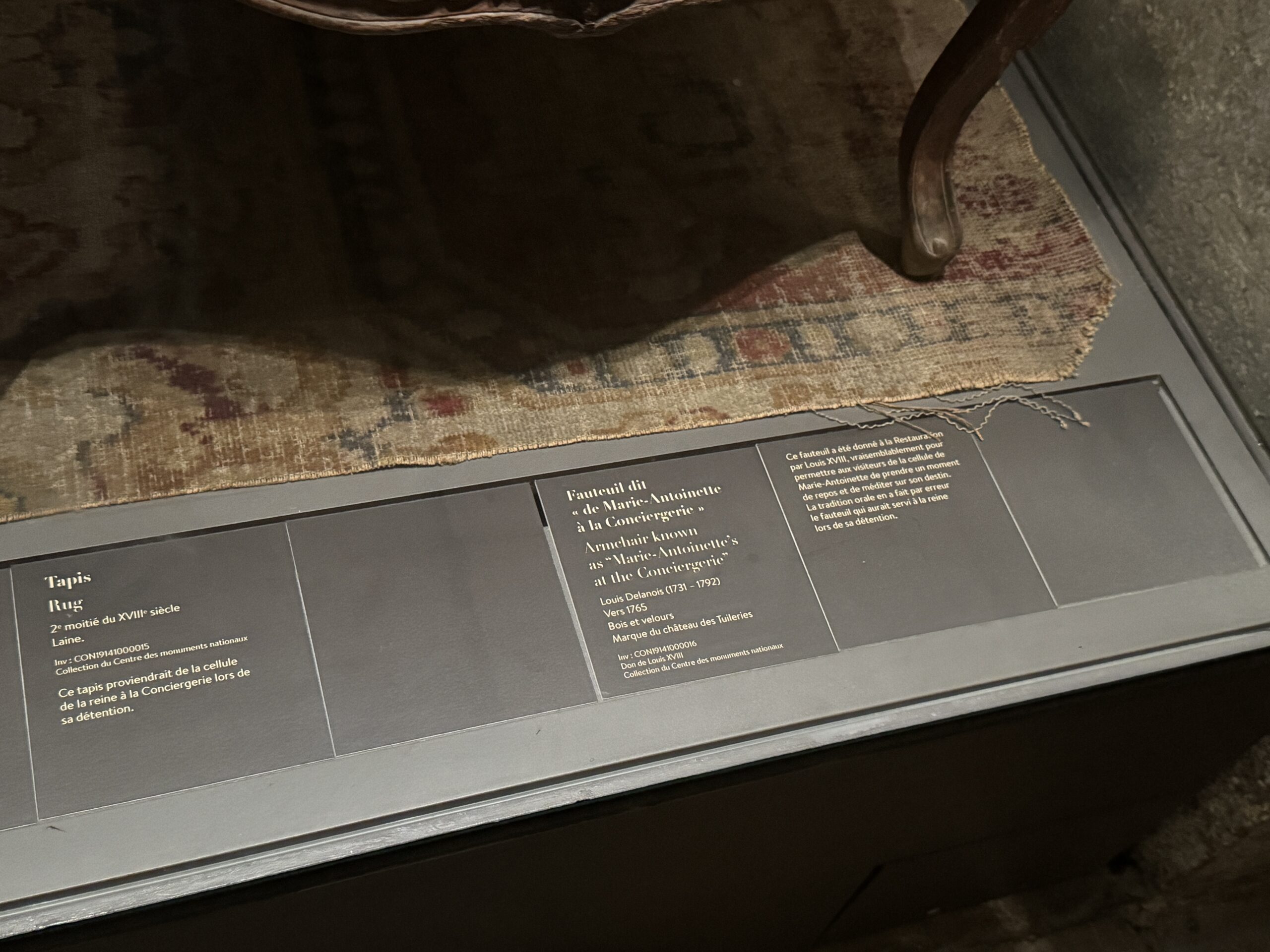 Это кресло было подарено Людовиком XVIII во время Реставрации, предположительно, для того, чтобы посетители кельи Марии-Антуанетты могли немного отдохнуть и поразмыслить о ее судьбе. Устная традиция ошибочно считает, что это кресло использовала королева во время своего заключения.