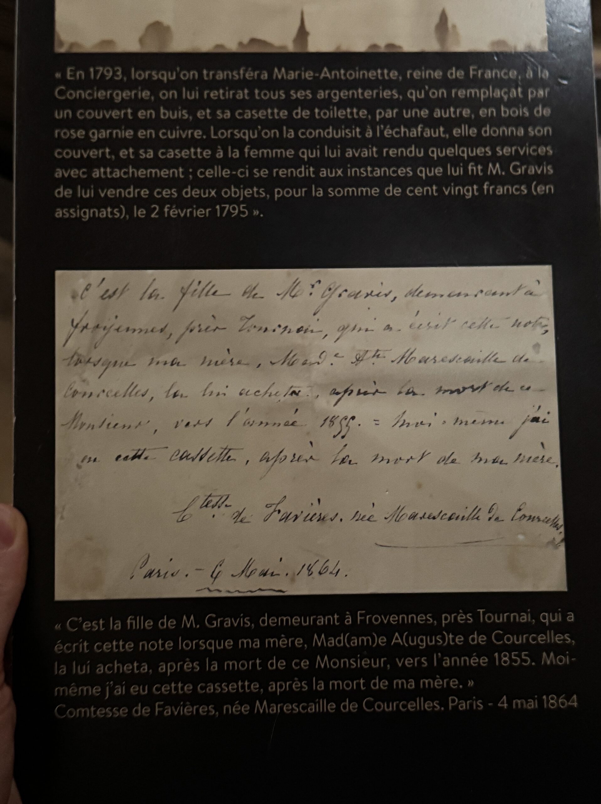 «В 1793 году, когда Мария-Антуанетта, королева Франции, была переведена в Консьержери, все её столовые приборы были изъяты и заменены набором столовых приборов из самшита, а несессер – другим, из розового дерева с медной отделкой. Когда её вели на эшафот, она отдала свои столовые приборы и несессер женщине, которая оказала ей некоторые любезные услуги. Последняя выполнила просьбу господина Грависа продать ей эти два предмета за сто двадцать франков (ассигнациями) 2 февраля 1795 года.»