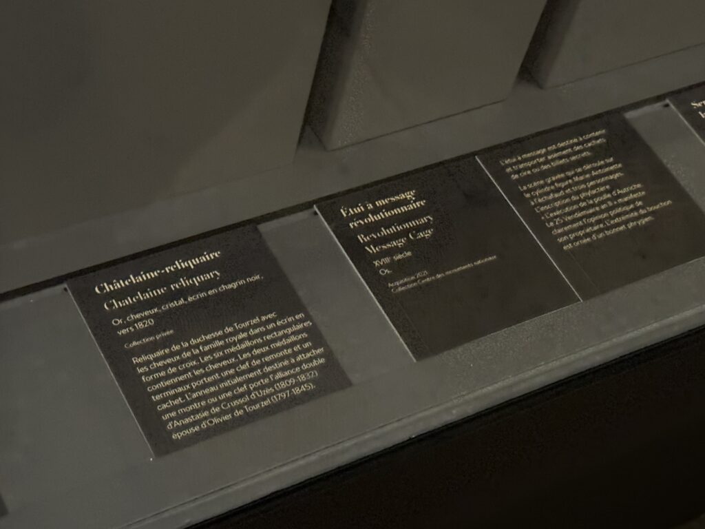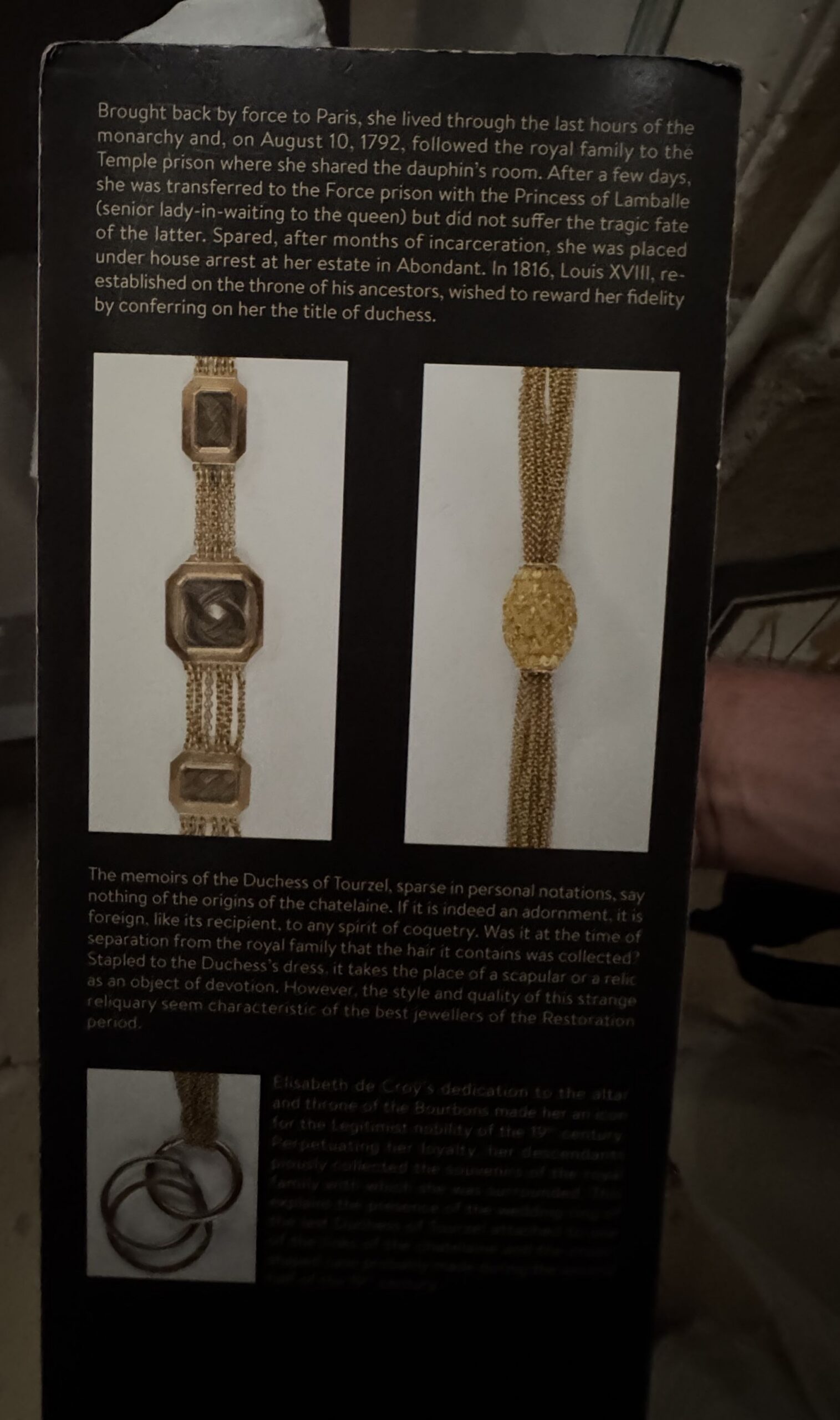 Реликварий герцогини де Турзель с волосами королевской семьи в крестообразном футляре. В шести прямоугольных медальонах хранятся волосы. На двух крайних медальонах изображены заводной ключ и печать. Кольцо, изначально предназначенное для крепления часов или ключа, украшено двойным обручальным кольцом Анастасии де Крюссоль д’Юзес (1809–1832), жены Оливье де Турзеля (1797–1845).