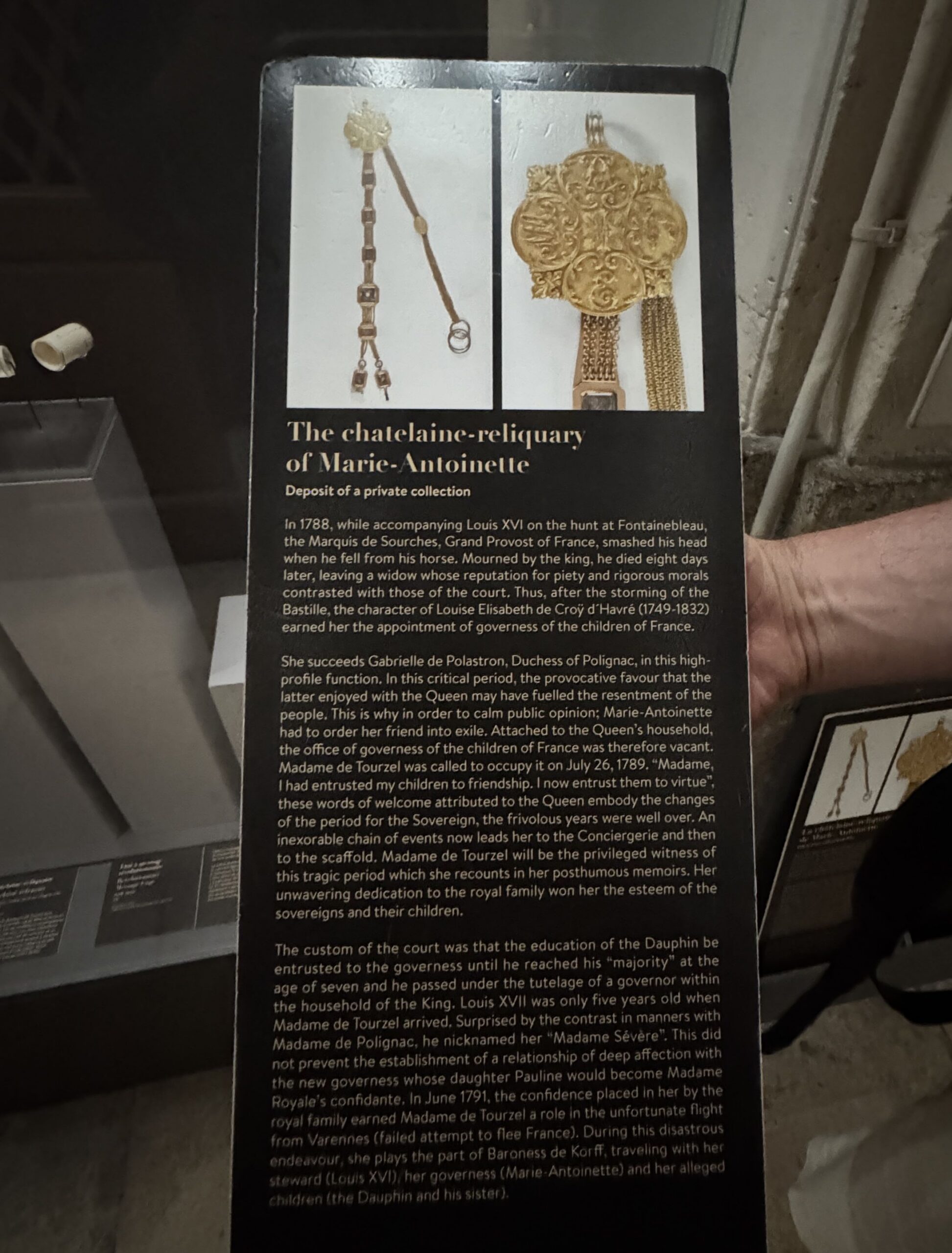 Реликварий Марии-Антуанетты. В 1788 году, сопровождая Людовика XVI на охоте в Фонтенбло, маркиз де Сурш, великий прево Франции, разбил себе голову, упав с лошади. Оплакиваемый королём, он скончался восемь дней спустя, оставив вдову, чья репутация набожности и строгих нравов резко контрастировала с придворными. Так, после взятия Бастилии, Луиза Элизабет де Круа д’Авре (1749–1832) благодаря своему характеру стала гувернанткой детей Франции.