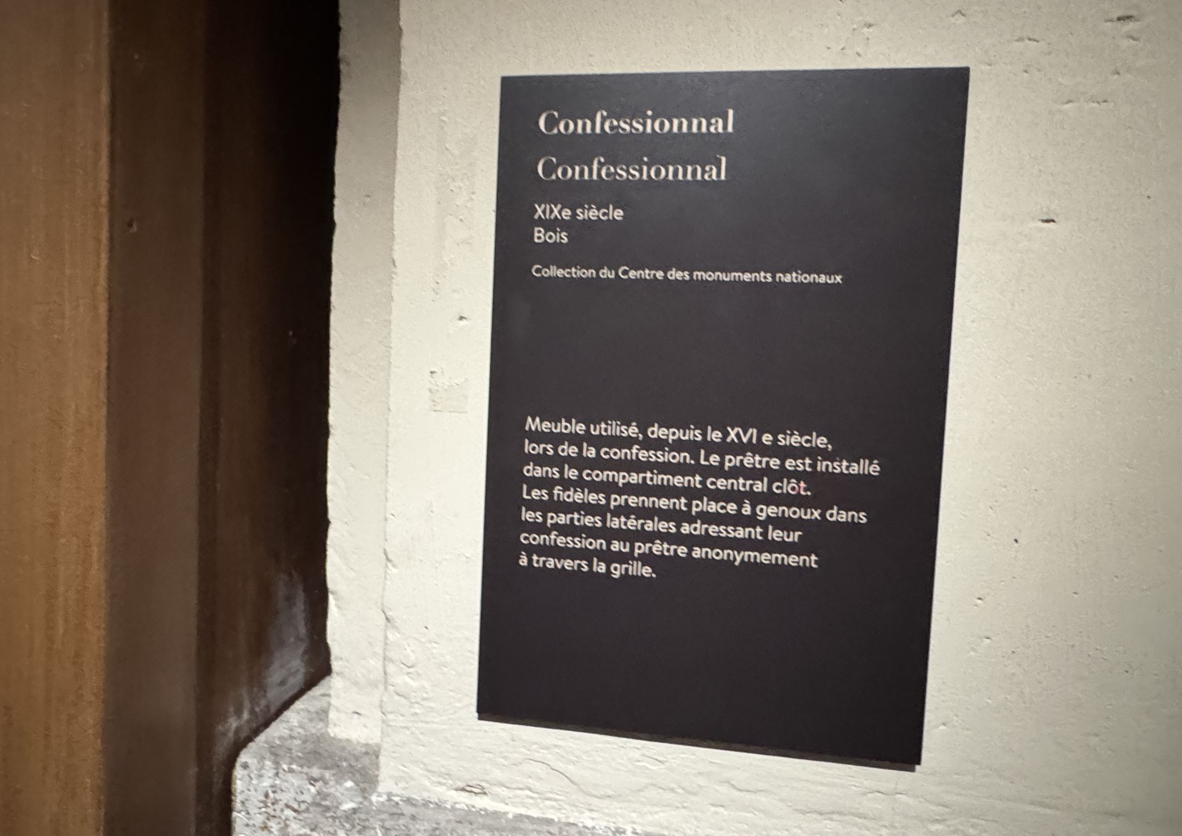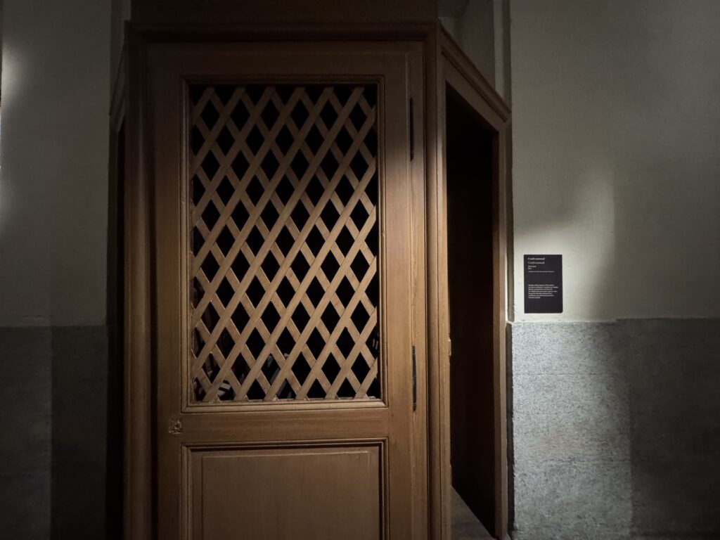 Исповедальня, 19 век. Предмет мебели, используемый с XVI века для исповеди. Священник сидит в центральном, закрытом отделении. Верующие преклоняют колени в боковых секциях, анонимно исповедуясь священнику через решётку.