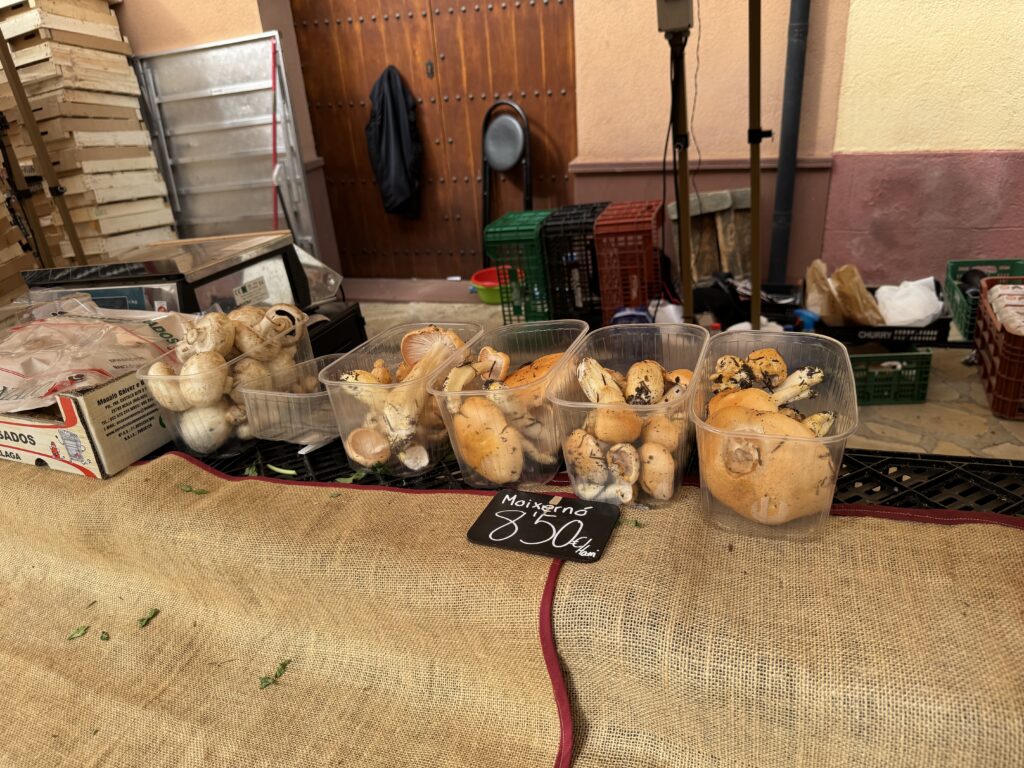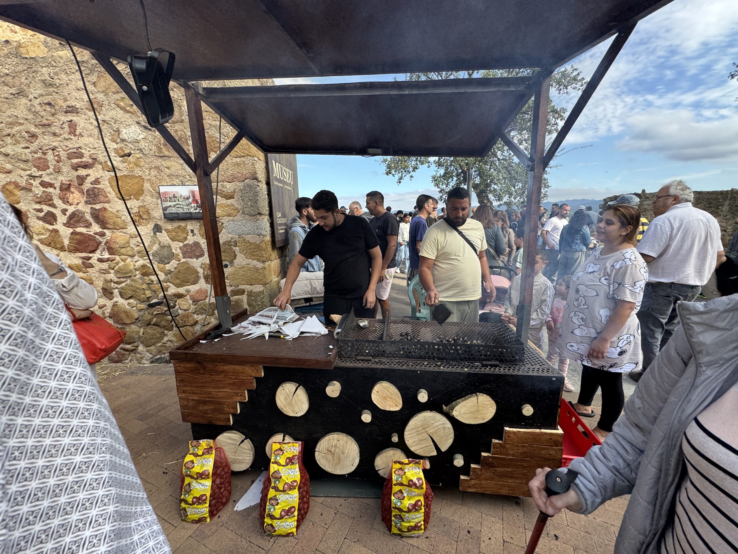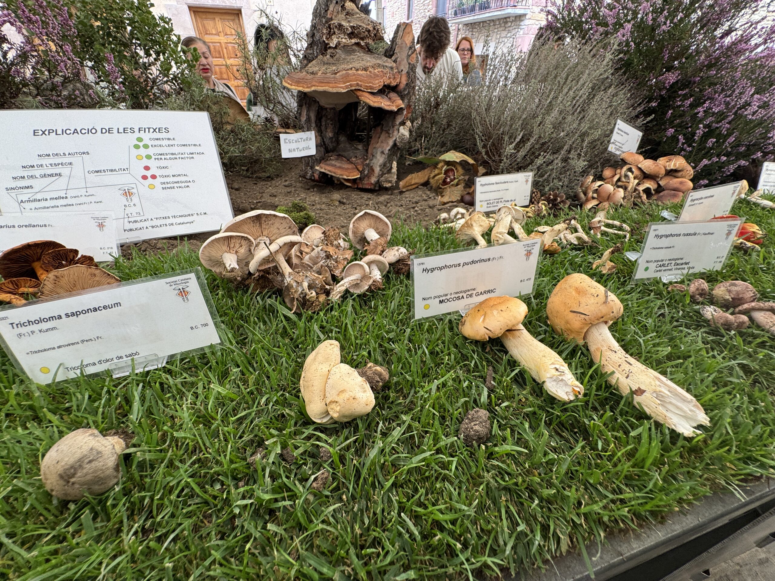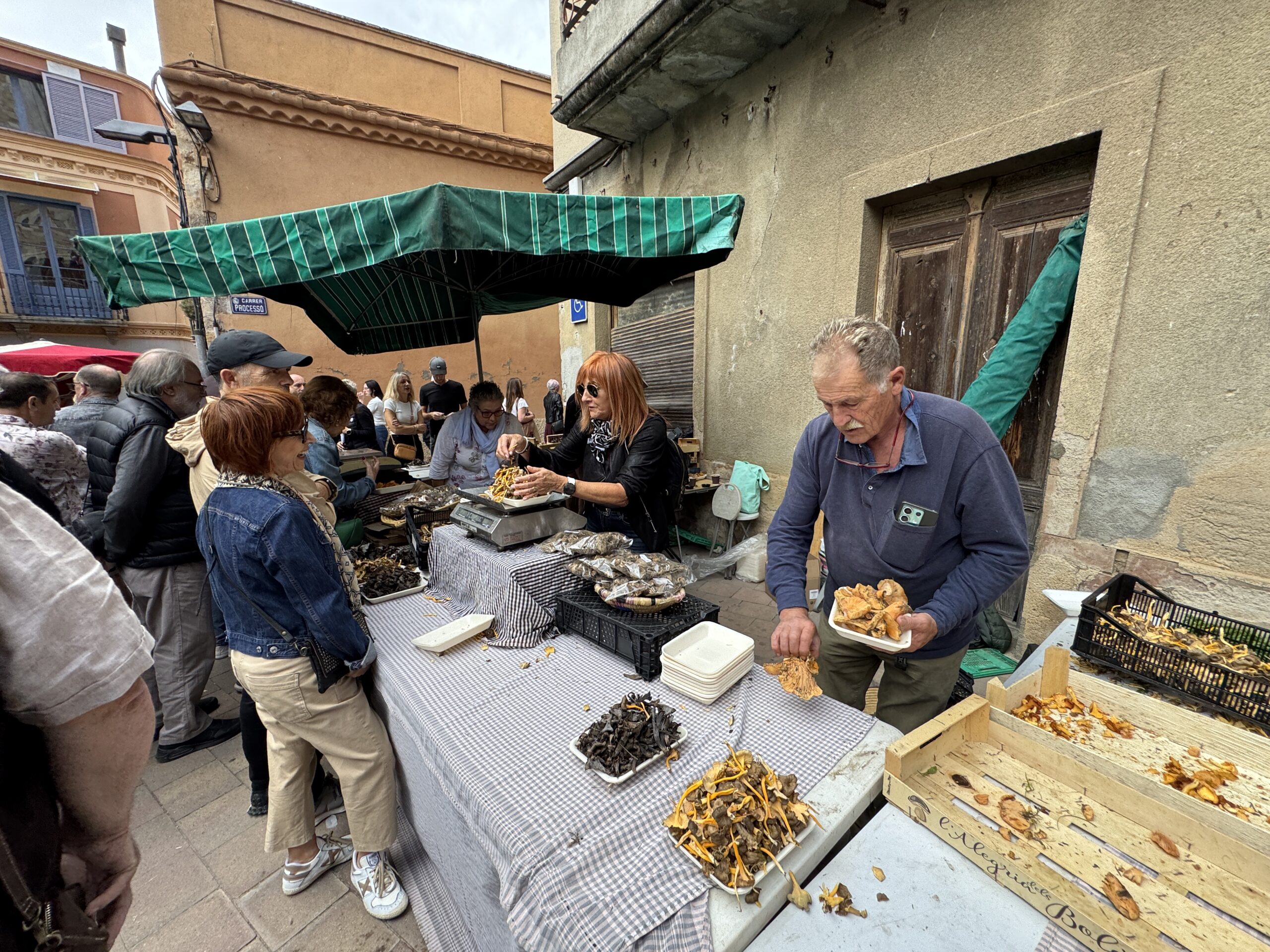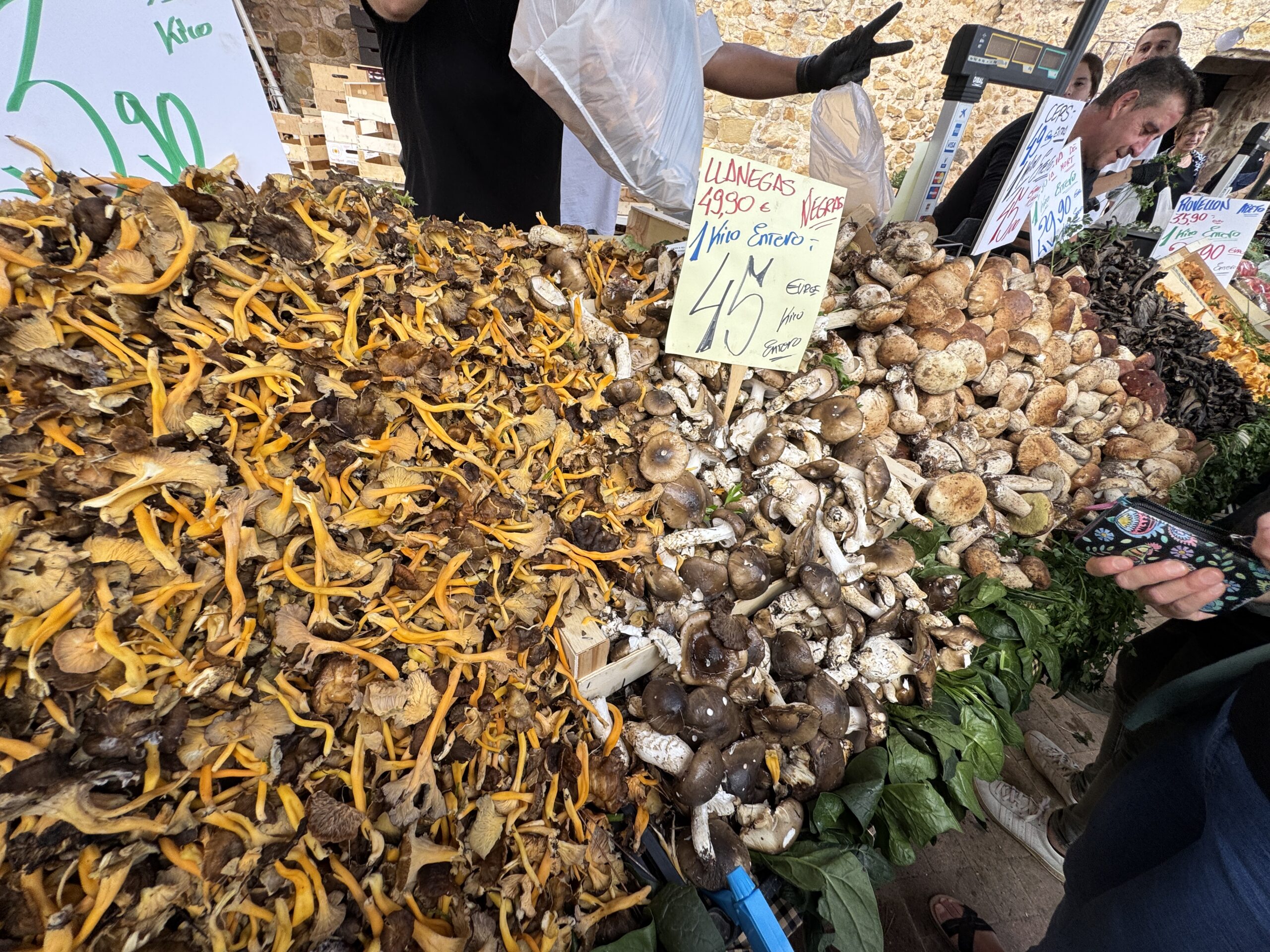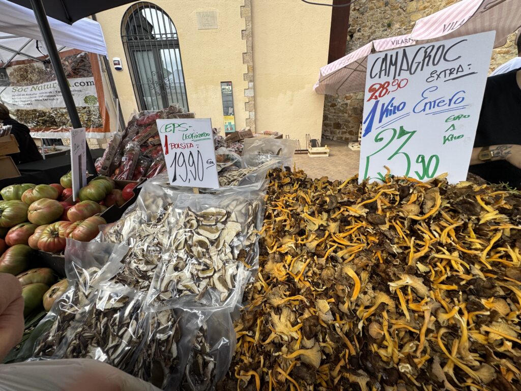 На грибной фестиваль в Сева мы едем каждый год, до остальных добираемся очень редко — нужна машина. И в этот раз мы решили начать с Fira del Bolet de Llagostera 2025. И нам не понравилось буквально с первых мгновений. Если в Сева продумана большая парковка и стоят регулировщики, то в Льягостера просто автомобильный кошмар. Огромное количество машин ездит по одной и той же траектории в надежде найти место для парковки. Мы нашли почти за городом и шли пешком. С толпами других людей. Это было вторым минусом. Потоки людей не организованы разумно, ярмарка распланирована абсурдно. Назвать это грибным мероприятием можно с трудом. Выставка в мэрии настолько скромна и так бездарно сделана, что я постаралась как можно скорее её покинуть. Грибы на продажу были совсем не лучшего качества. Другие продукты — помидоры, спаржа и цветы — не компенсировали дефицита хороших грибов и товаров, связанных с грибами. Мы залезли на башню-тюрьму, сделали круг по площади и начали протискиваться обратно к выходу из города, потому что всё это было страшно неприятно. Мы поспешили в Сева.