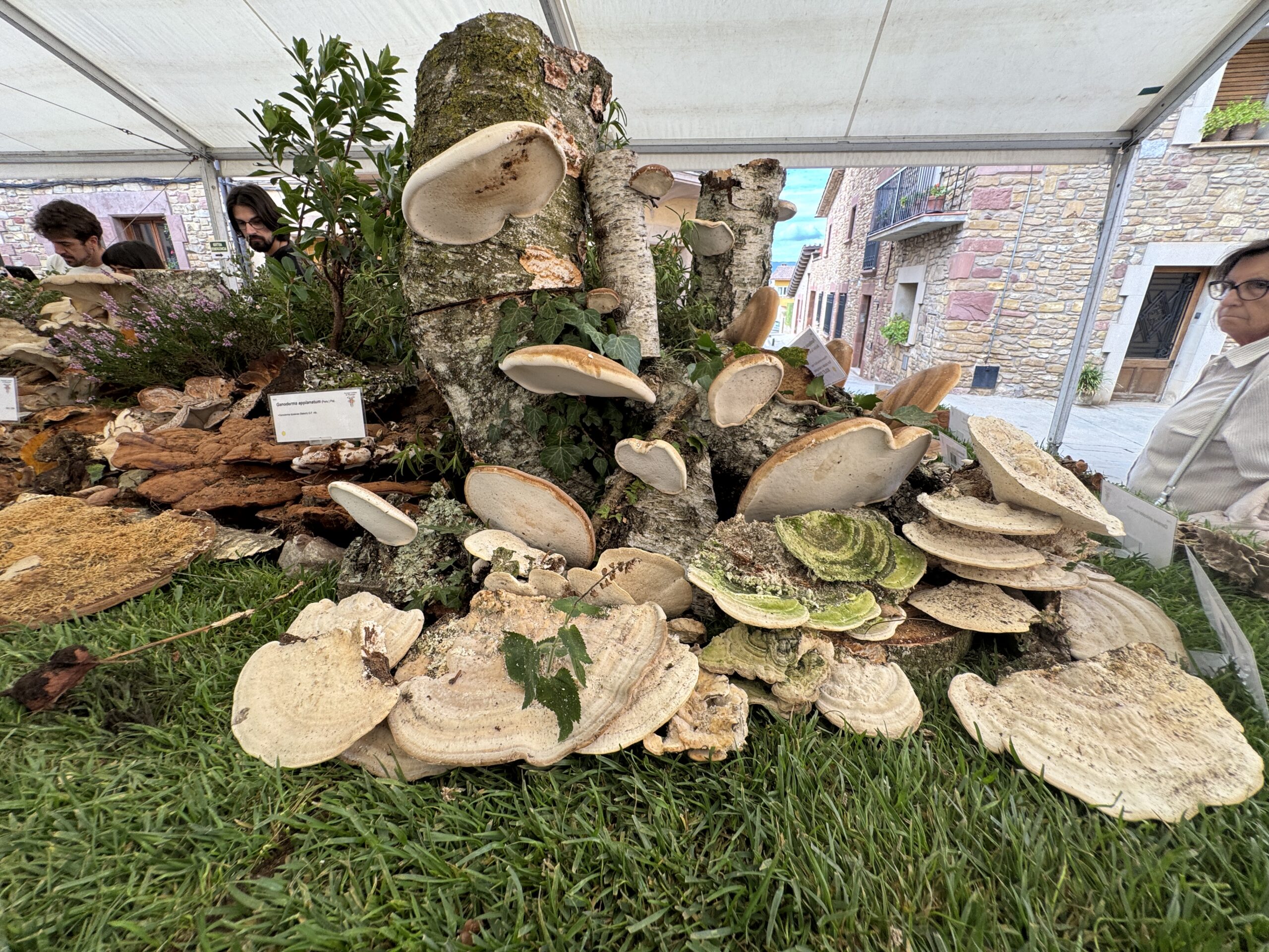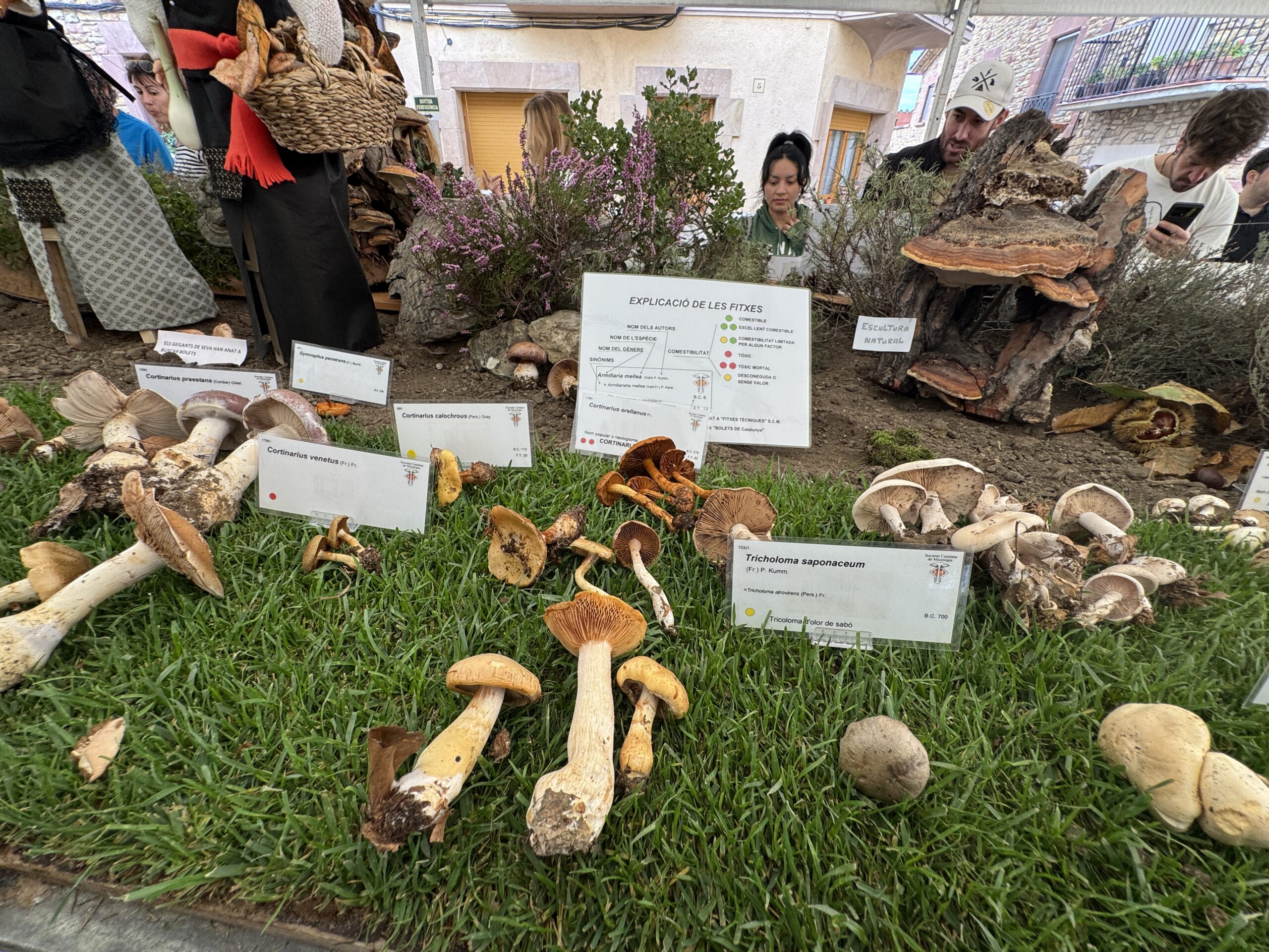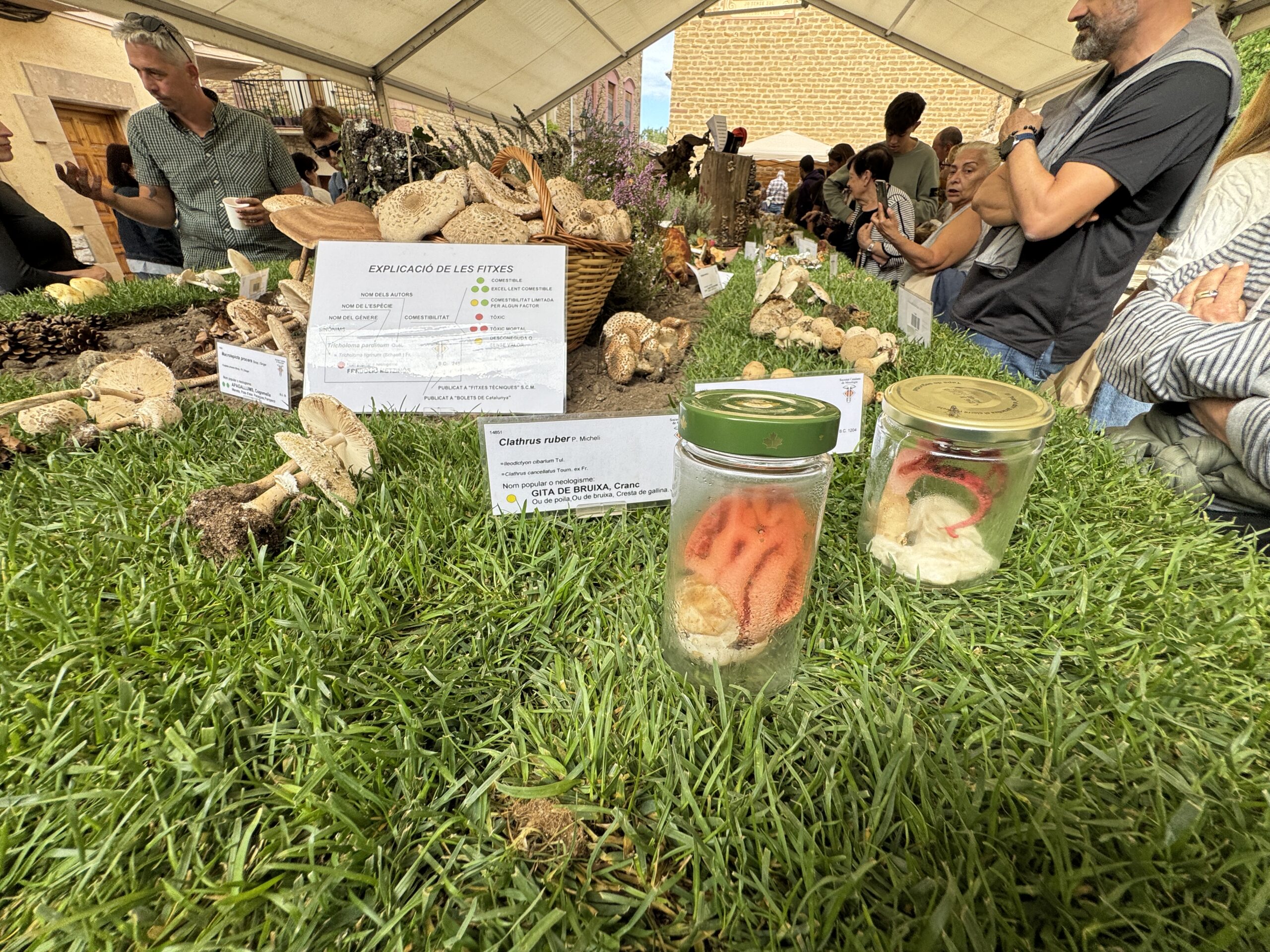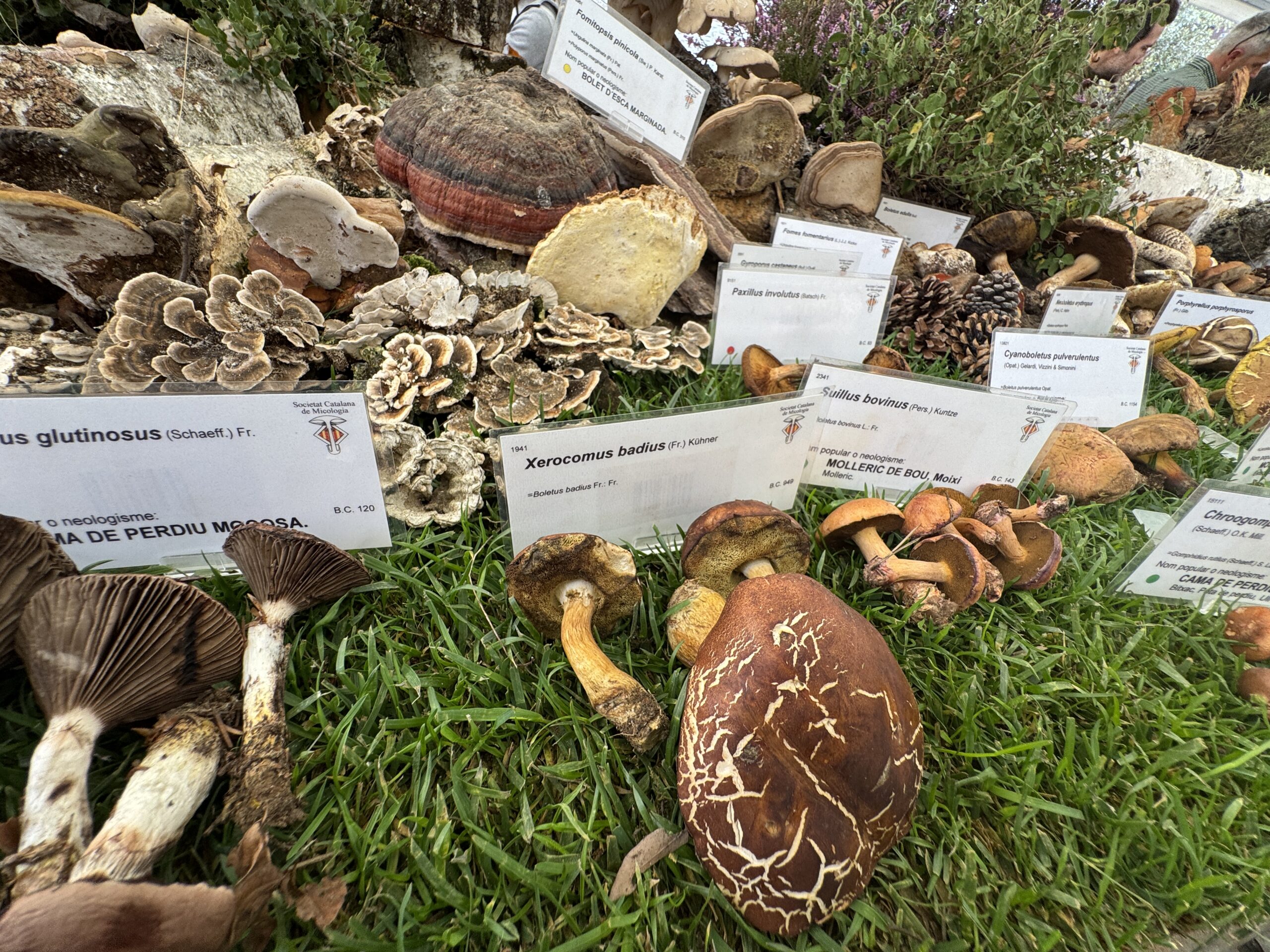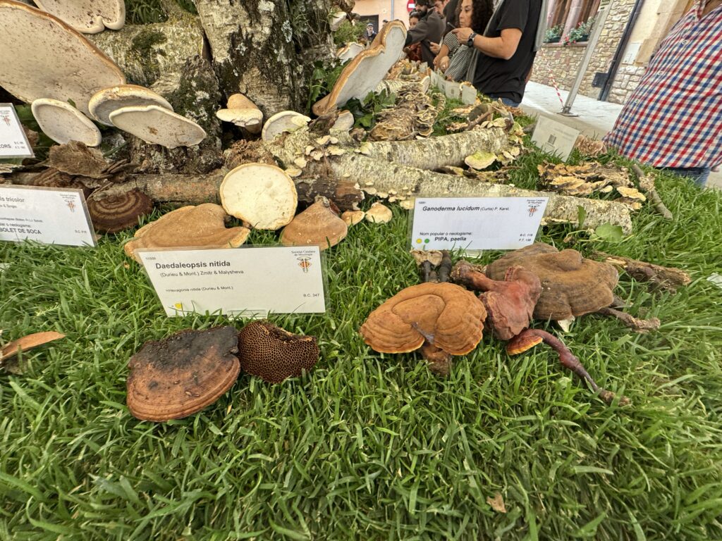 Когда мы добрались до Festa del Bolet de Seva 2025, там уже закончились основные массовые мероприятия. Гигантская грибная сковорода кормила последних жедающих. Но мы не претендовали на это блюдо — в сковороду грибы насыпают из ящиков, особо не перебирая — там и щепки, и всякий мусор. Из лесных грибов в этих ящиках только лисички. Плюс к ним продается в комплекте хлеб и вино, которые мы не едим. Мы прошли до хорошей грибной выставки и купили шиитаке с грибной фермы и варенье.
