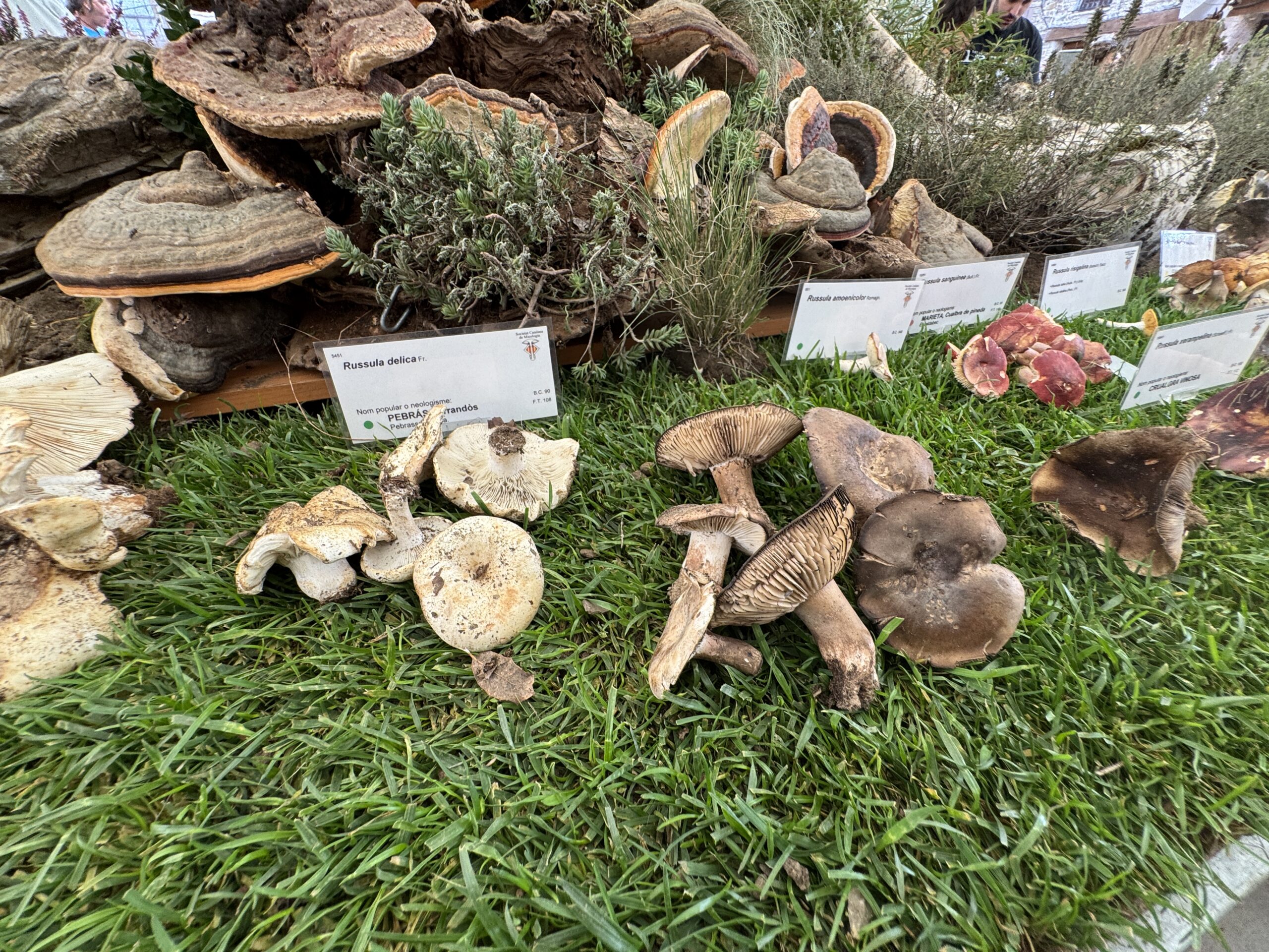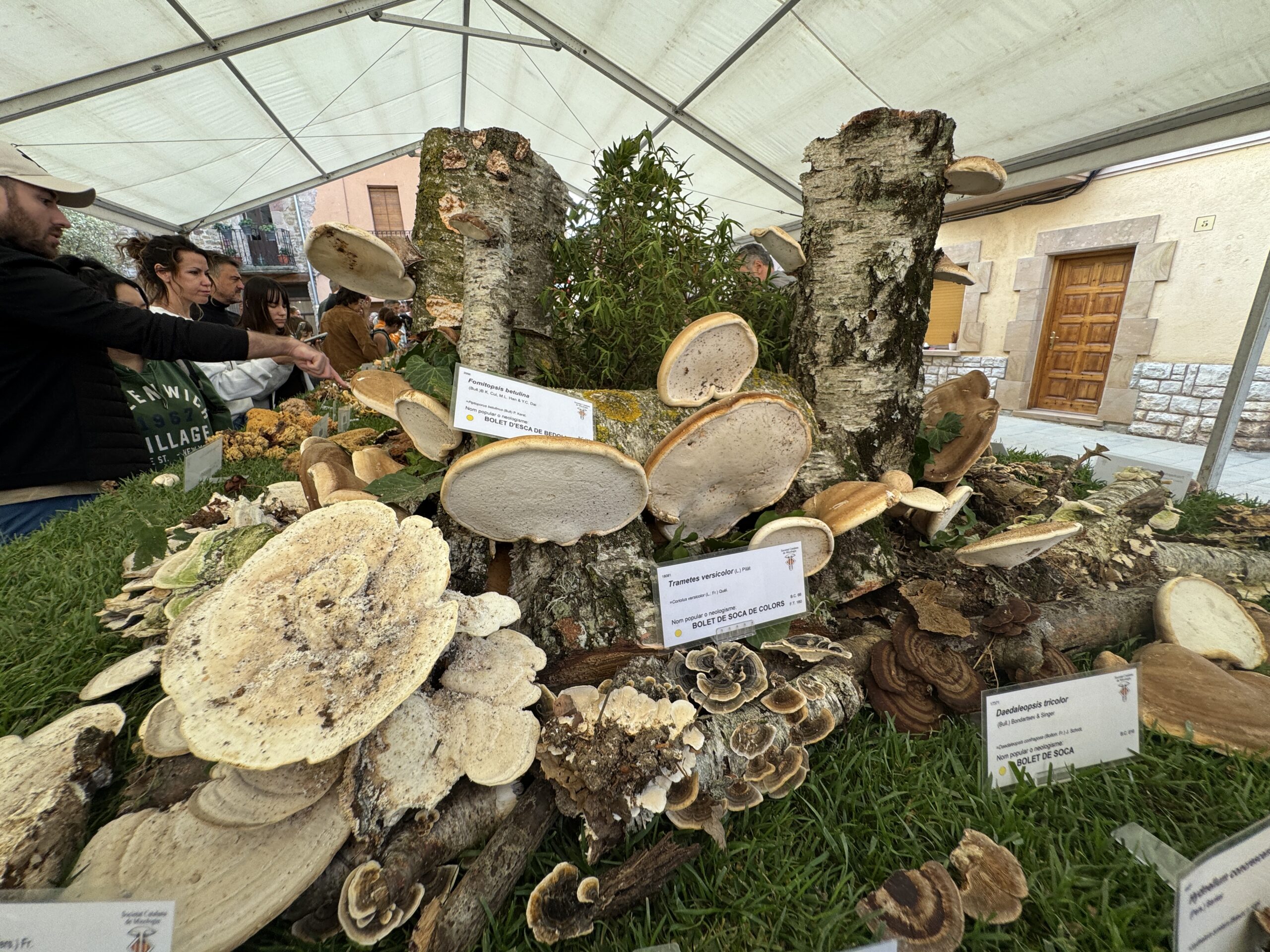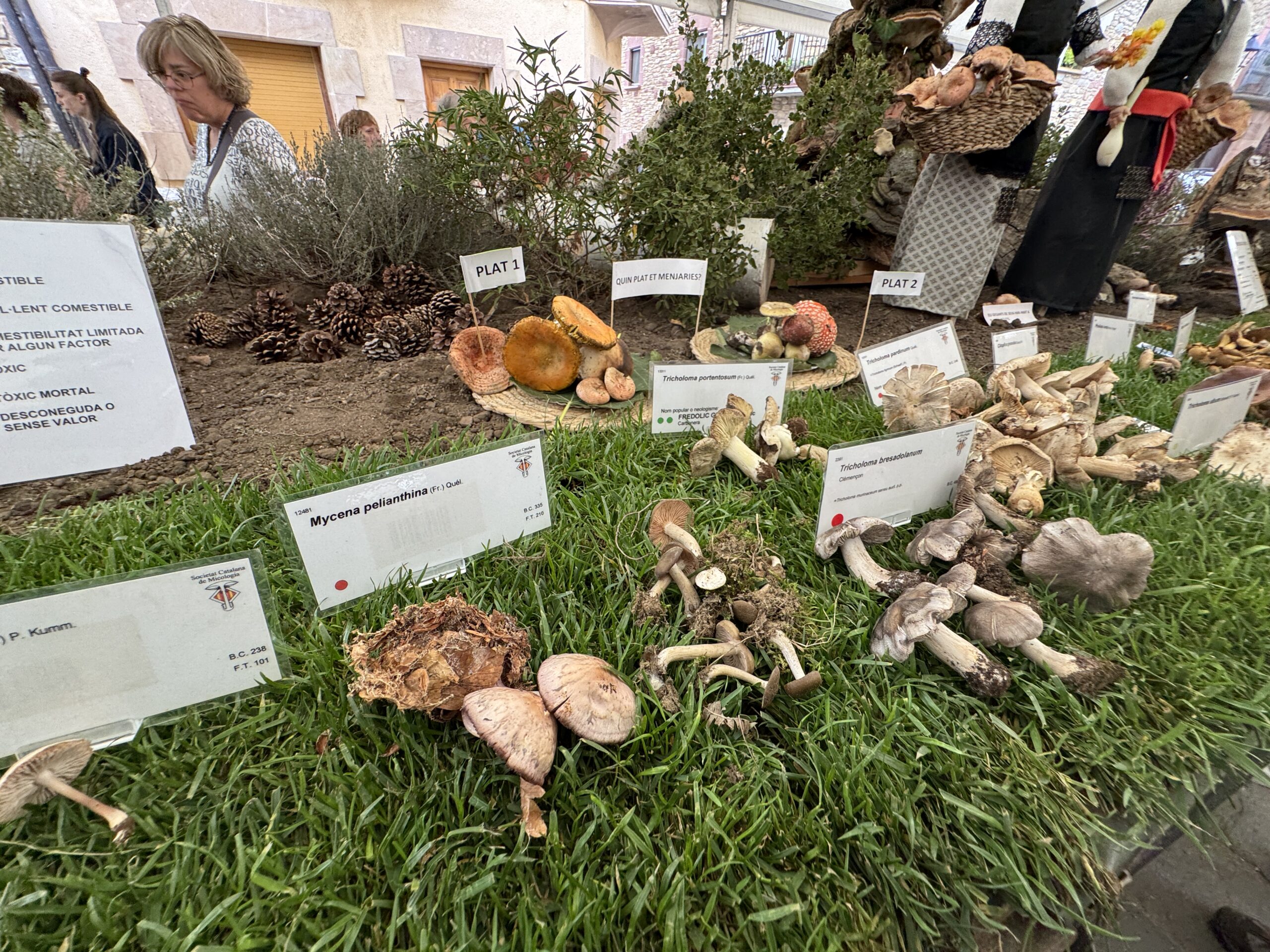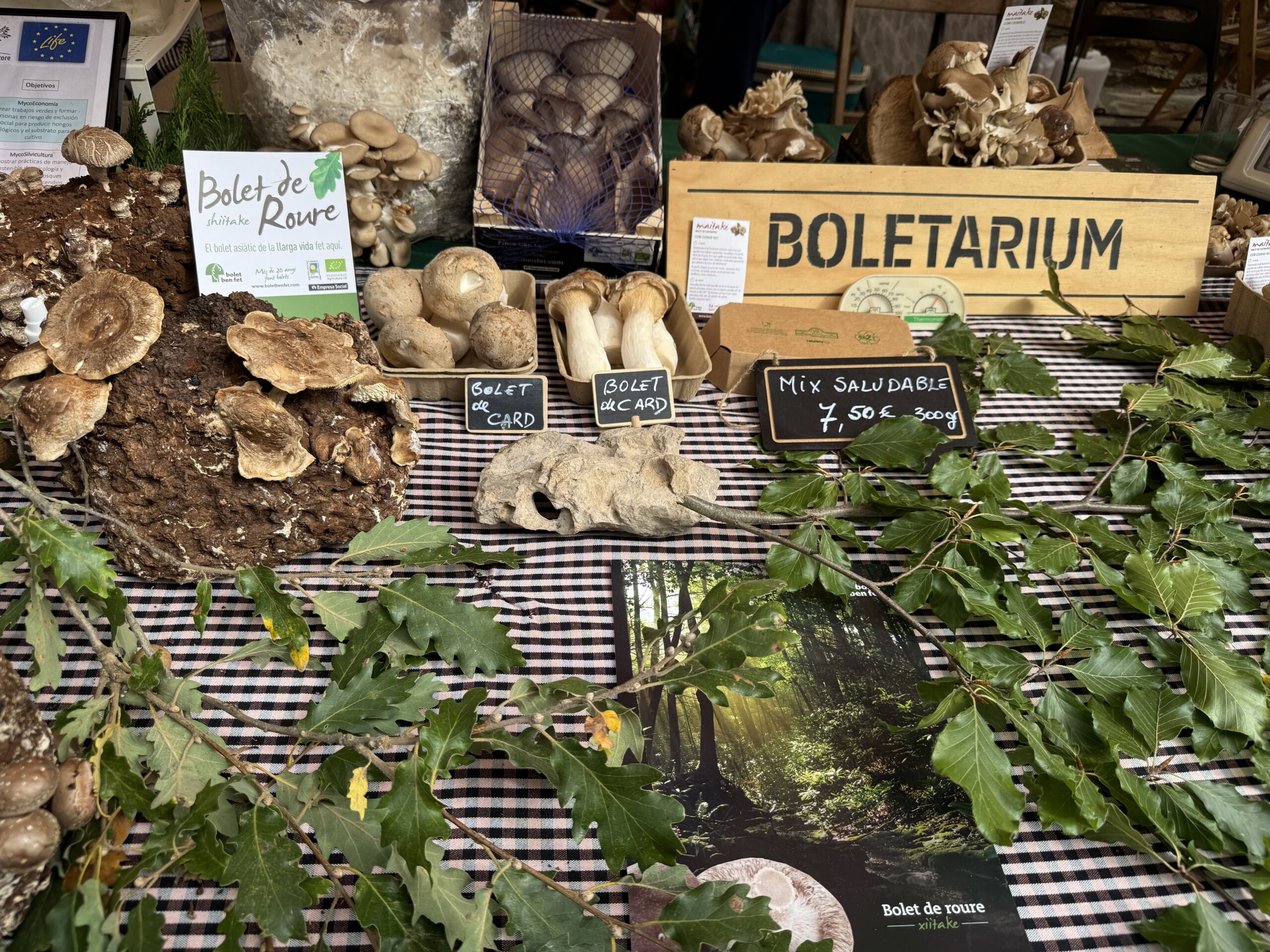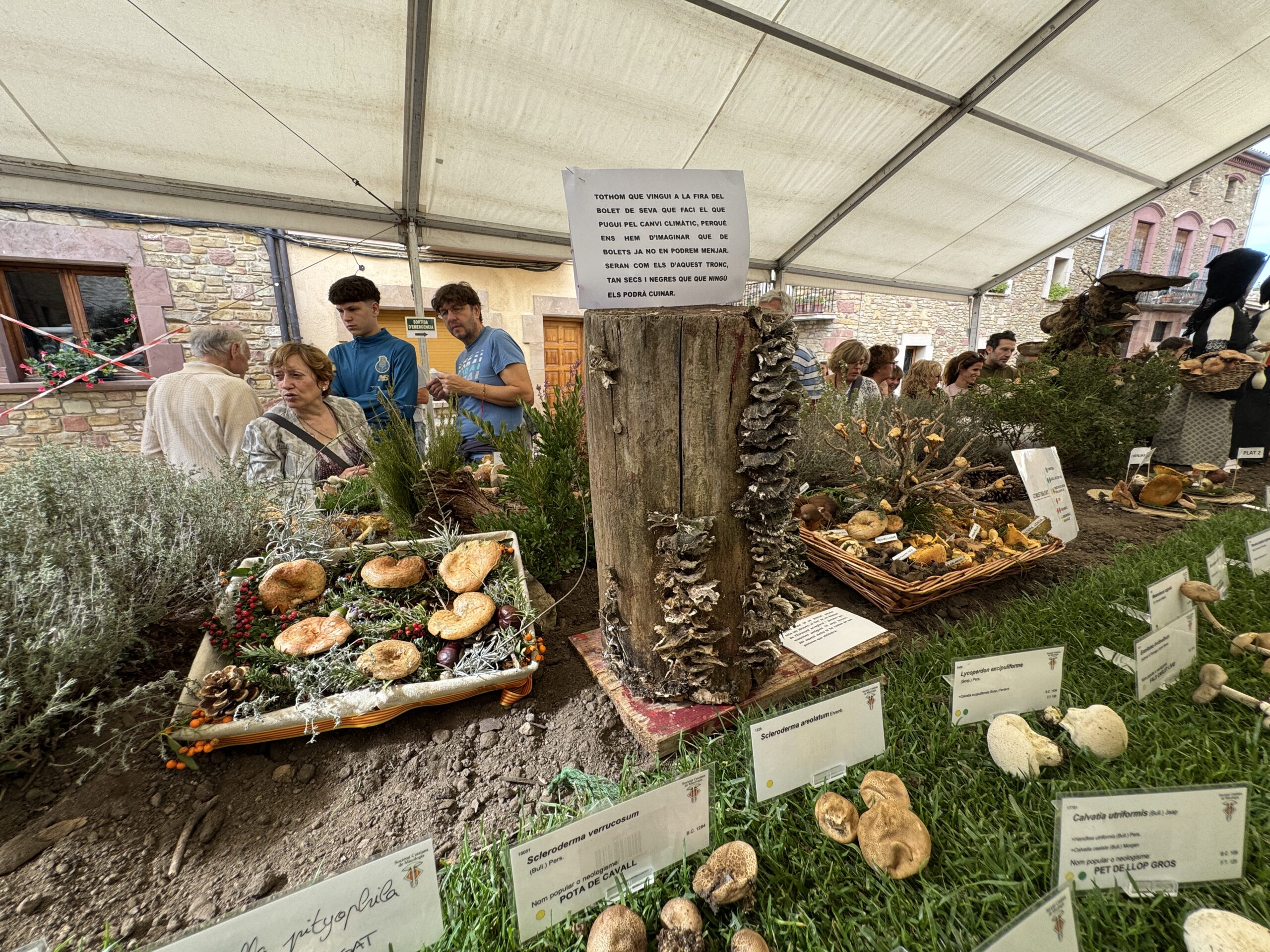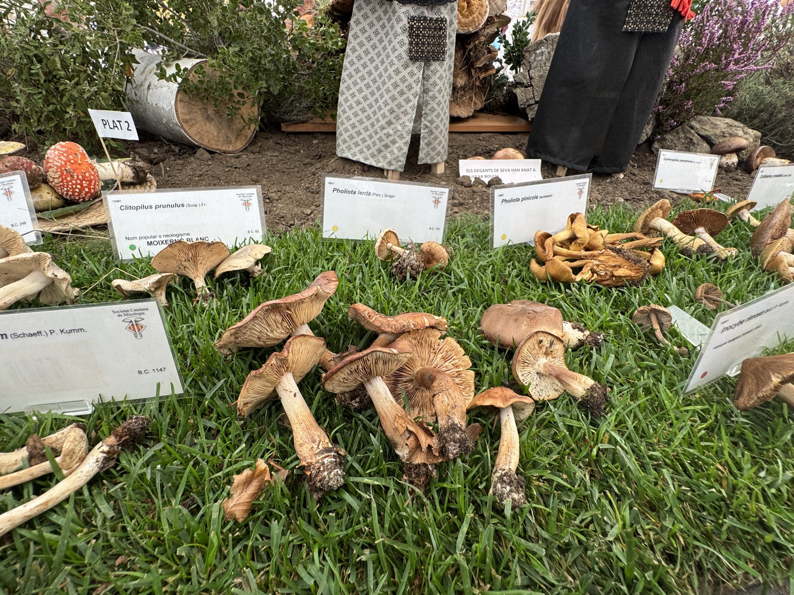 Когда мы добрались до Festa del Bolet de Seva 2025, там уже закончились основные массовые мероприятия. Гигантская грибная сковорода кормила последних жедающих. Но мы не претендовали на это блюдо — в сковороду грибы насыпают из ящиков, особо не перебирая — там и щепки, и всякий мусор. Из лесных грибов в этих ящиках только лисички. Плюс к ним продается в комплекте хлеб и вино, которые мы не едим. Мы прошли до хорошей грибной выставки и купили шиитаке с грибной фермы и варенье.
