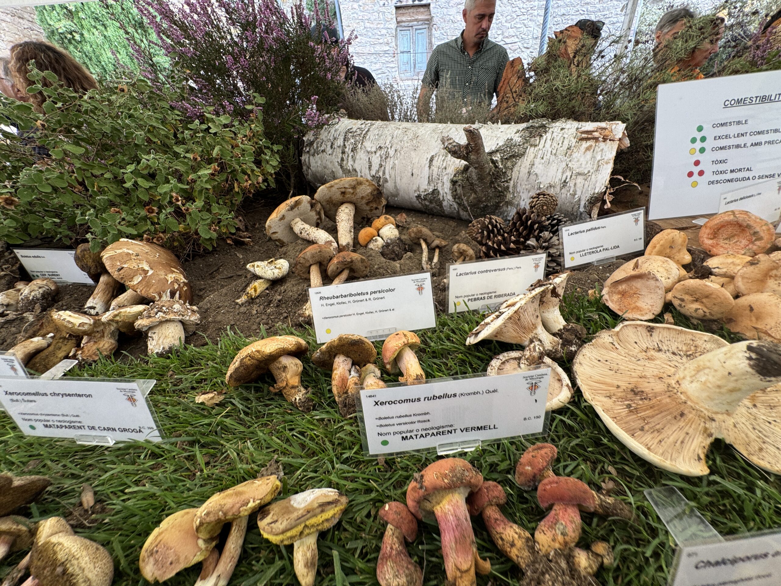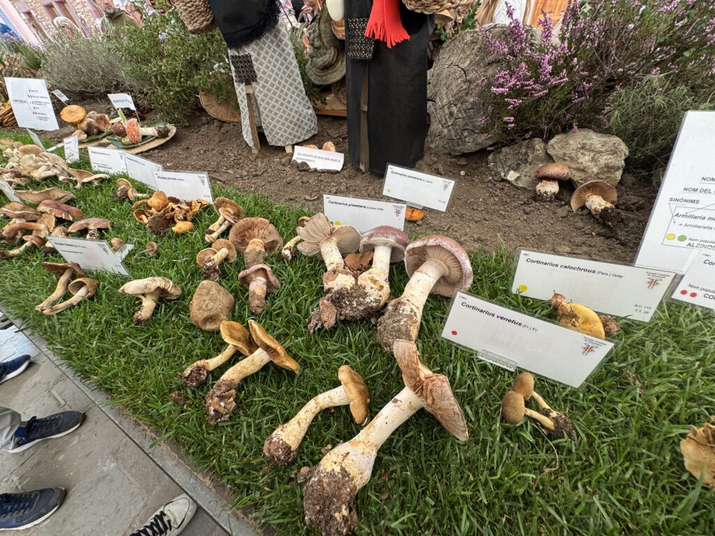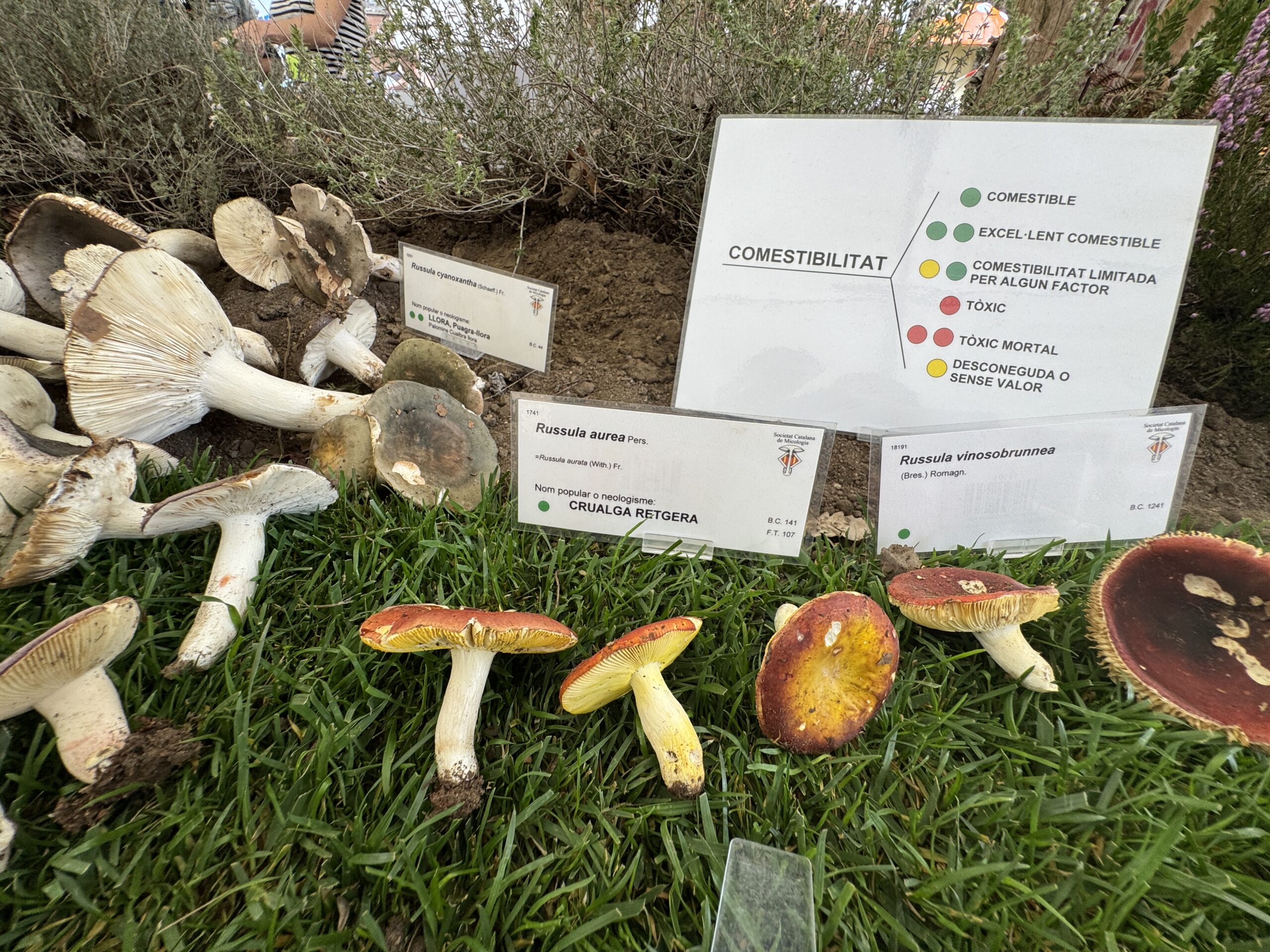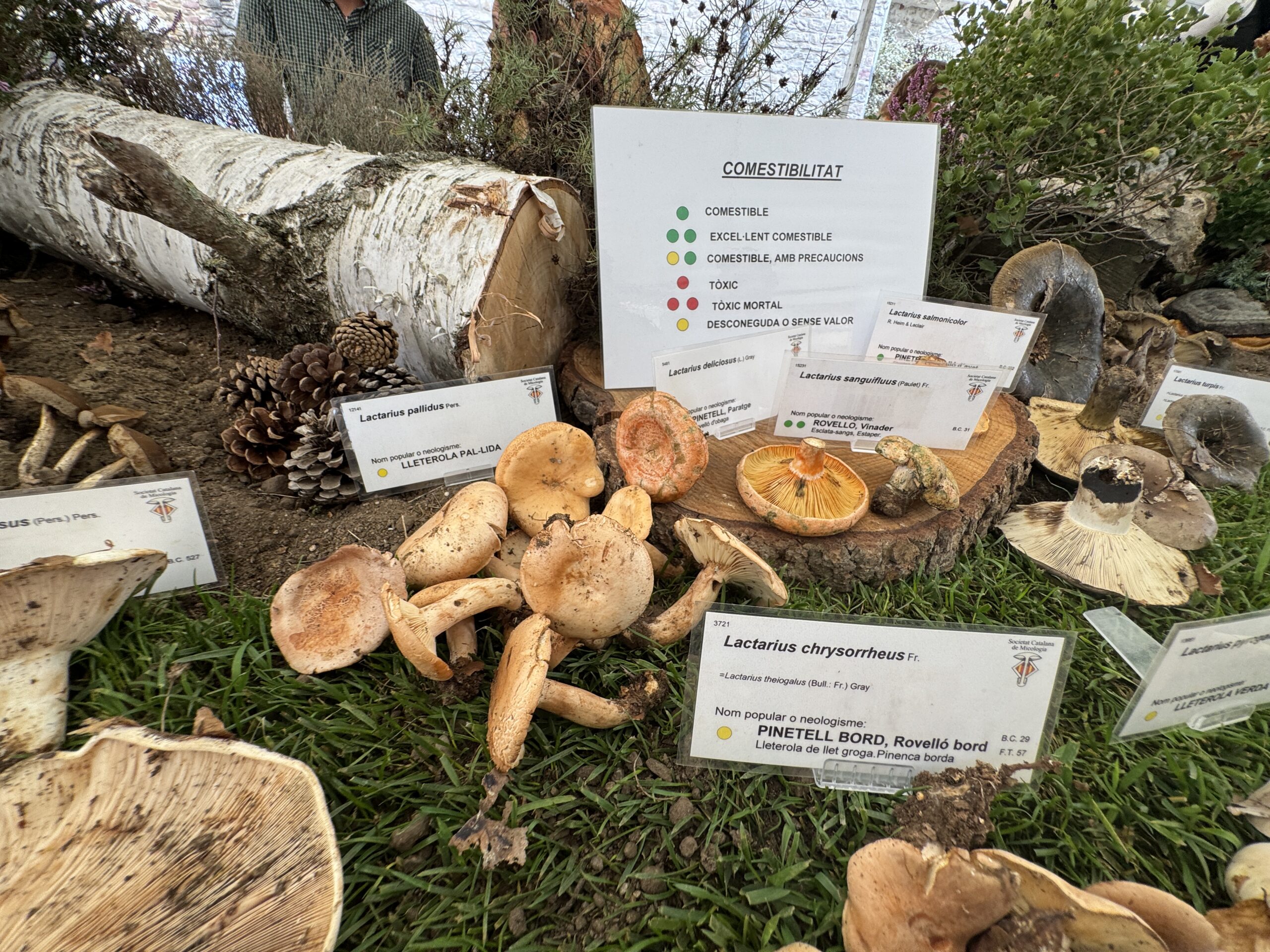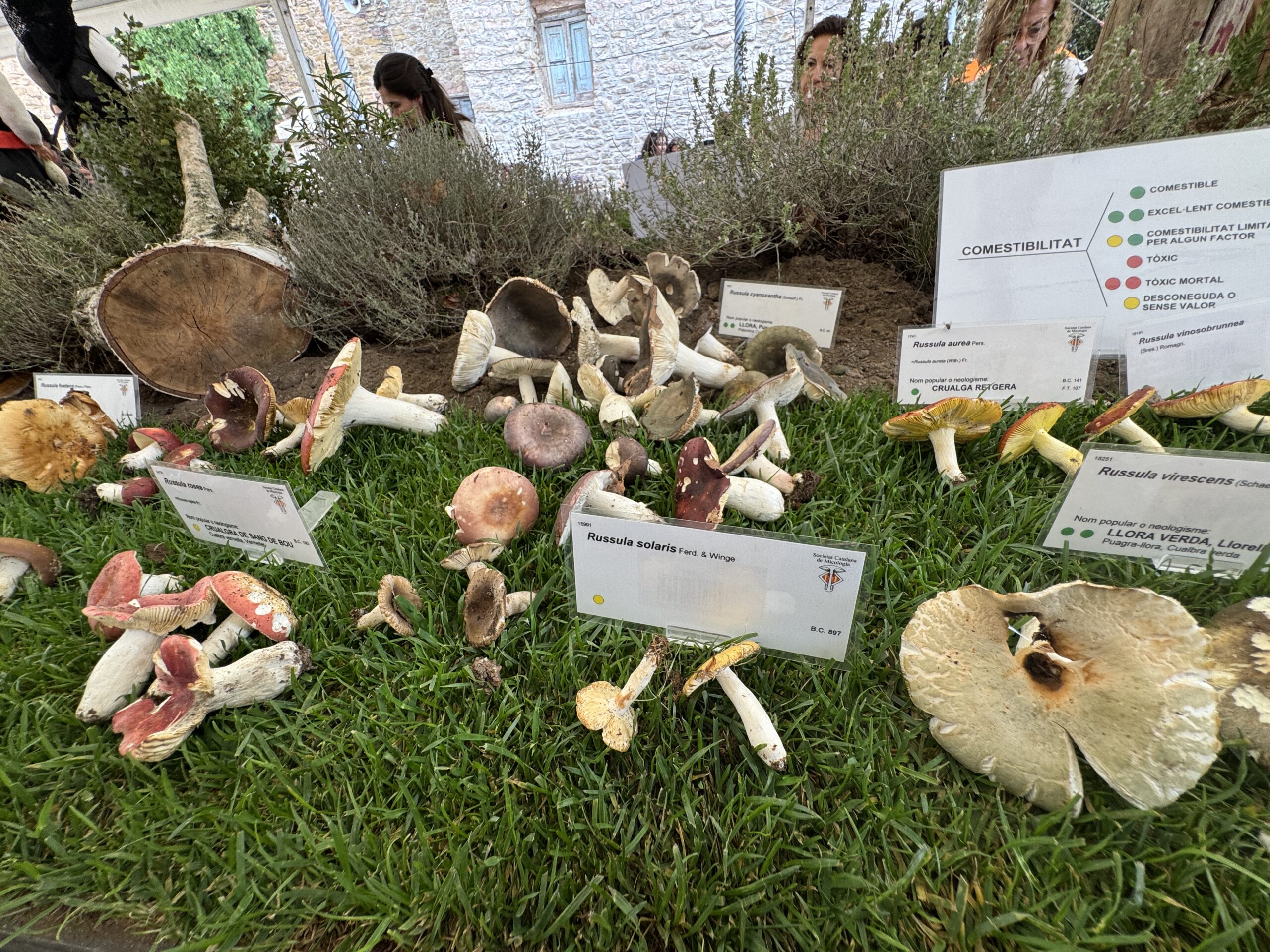 Когда мы добрались до Festa del Bolet de Seva 2025, там уже закончились основные массовые мероприятия. Гигантская грибная сковорода кормила последних жедающих. Но мы не претендовали на это блюдо — в сковороду грибы насыпают из ящиков, особо не перебирая — там и щепки, и всякий мусор. Из лесных грибов в этих ящиках только лисички. Плюс к ним продается в комплекте хлеб и вино, которые мы не едим. Мы прошли до хорошей грибной выставки и купили шиитаке с грибной фермы и варенье.