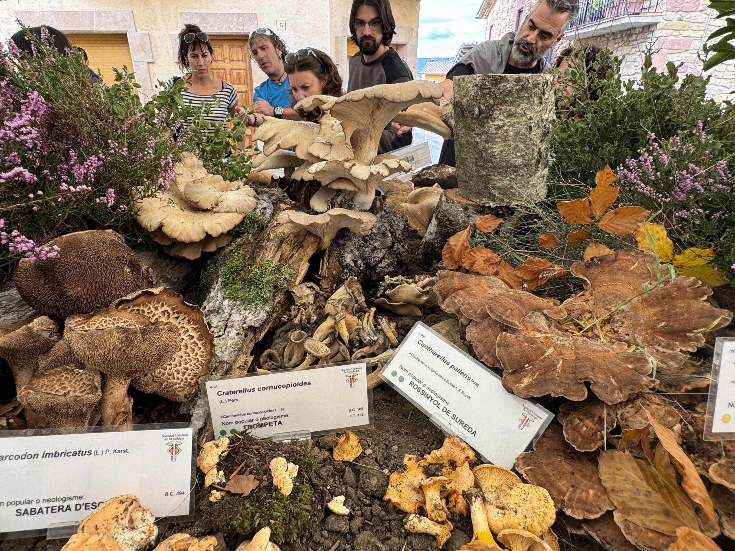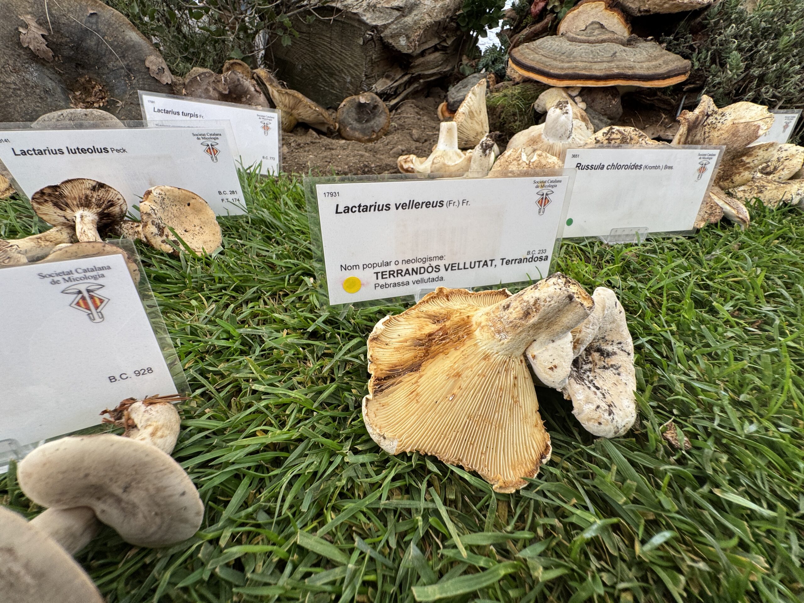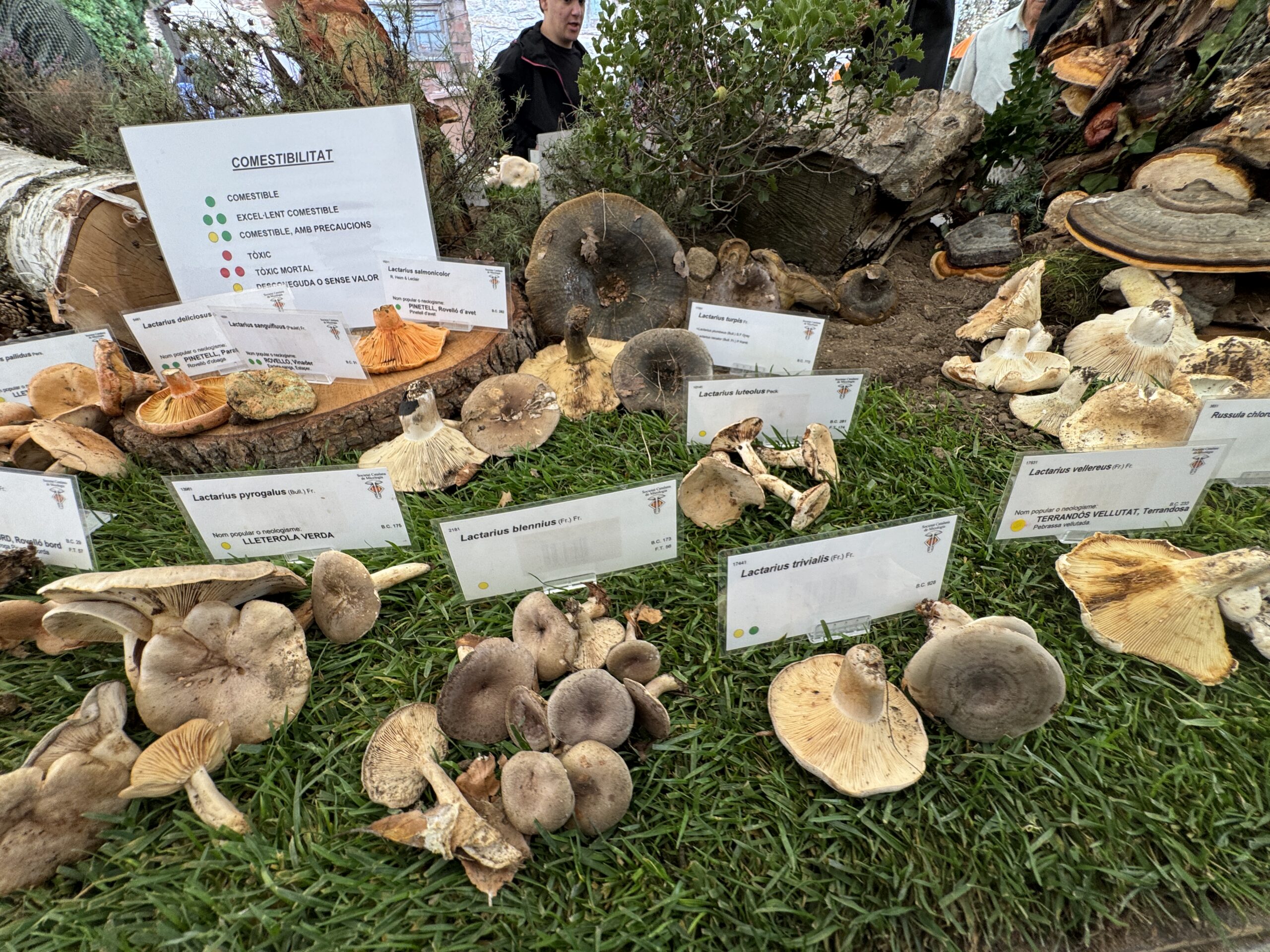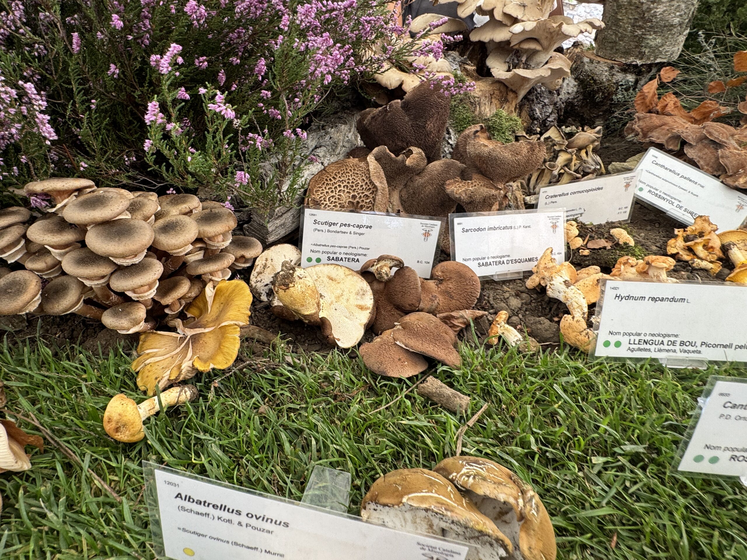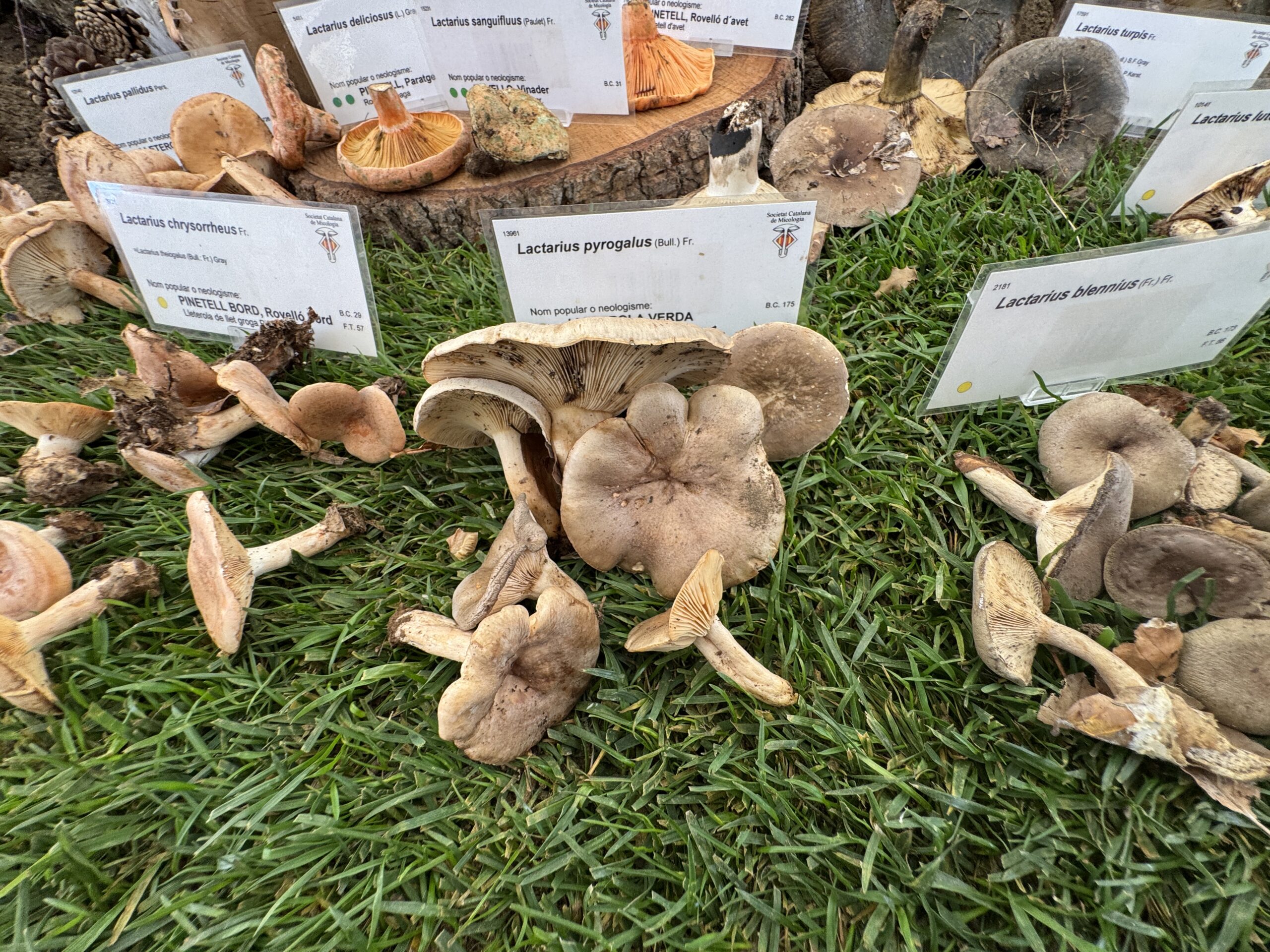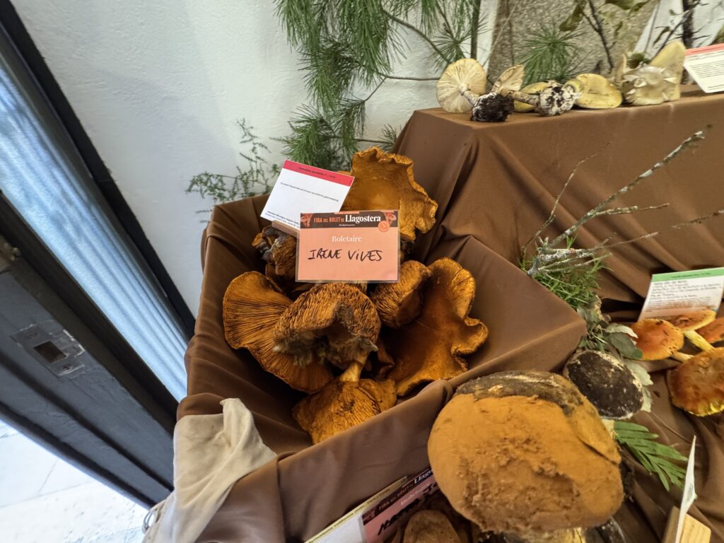 Когда мы добрались до Festa del Bolet de Seva 2025, там уже закончились основные массовые мероприятия. Гигантская грибная сковорода кормила последних жедающих. Но мы не претендовали на это блюдо — в сковороду грибы насыпают из ящиков, особо не перебирая — там и щепки, и всякий мусор. Из лесных грибов в этих ящиках только лисички. Плюс к ним продается в комплекте хлеб и вино, которые мы не едим. Мы прошли до хорошей грибной выставки и купили шиитаке с грибной фермы и варенье.