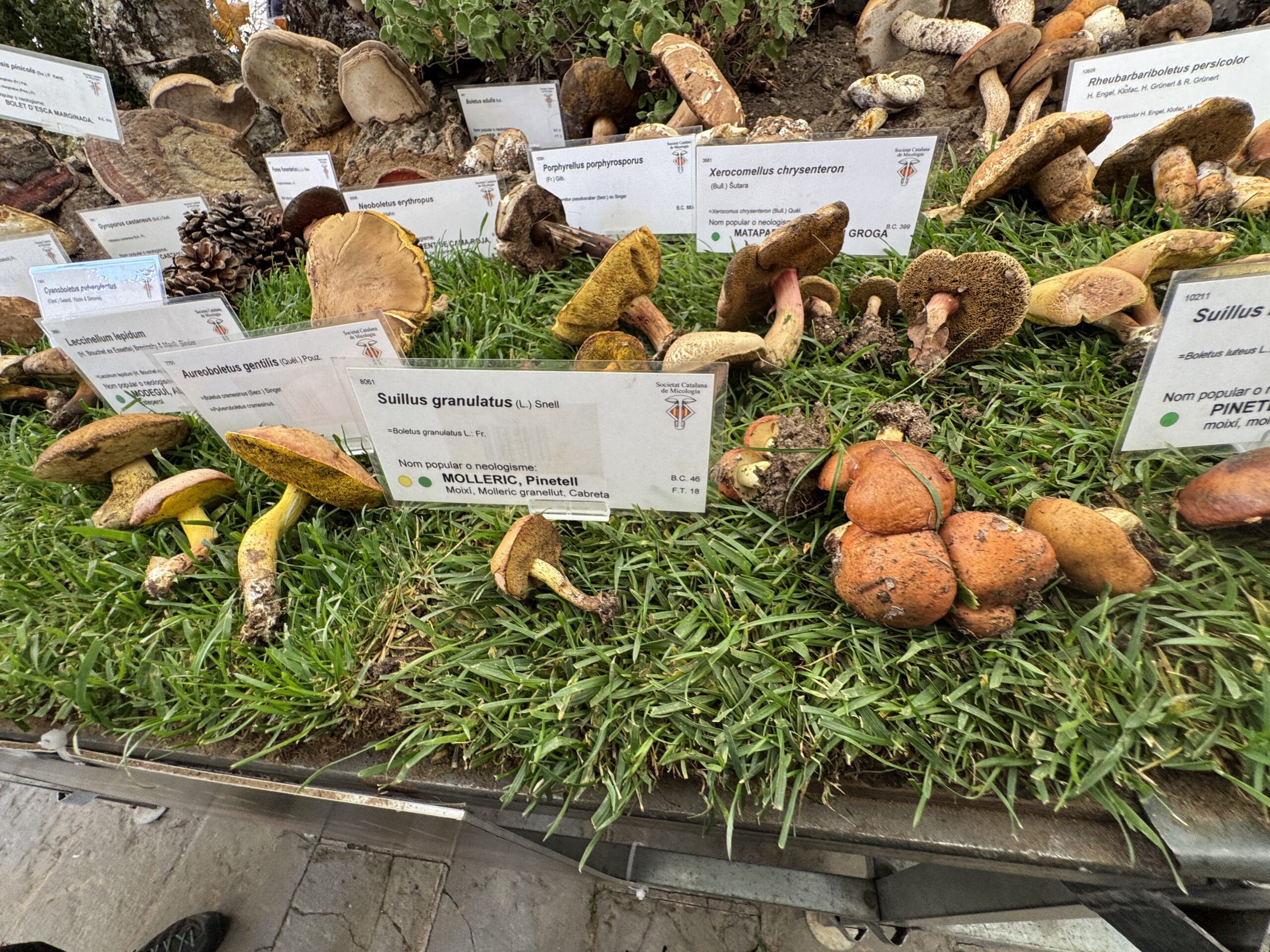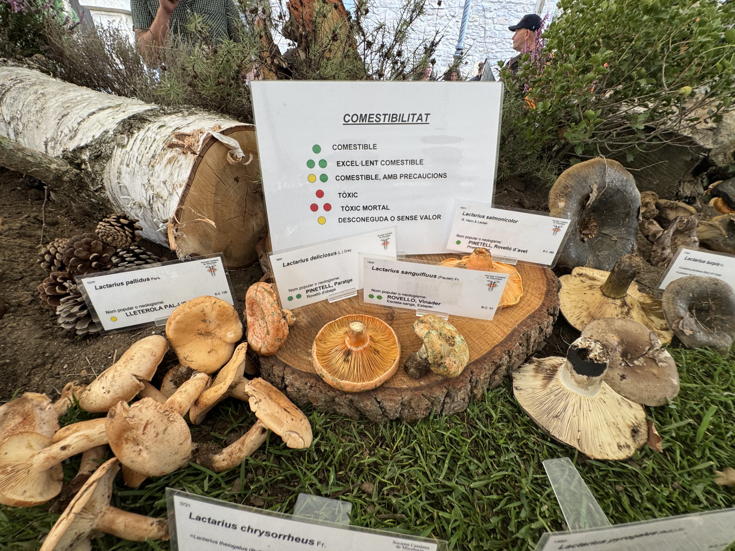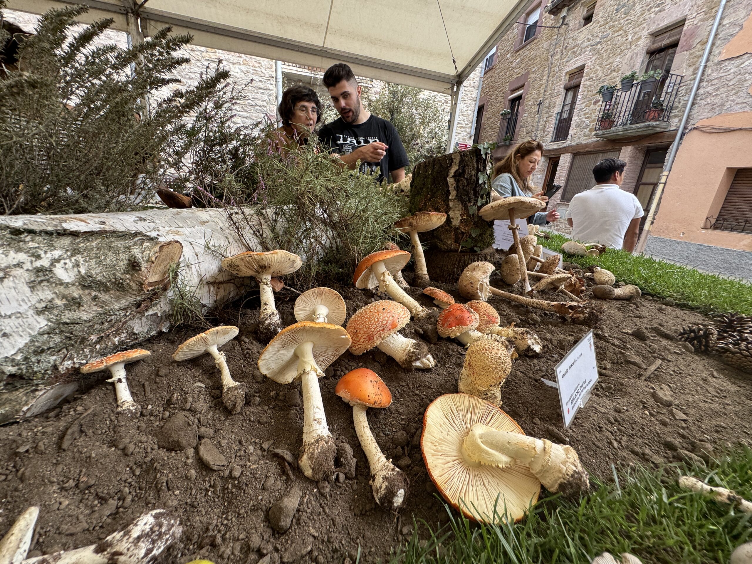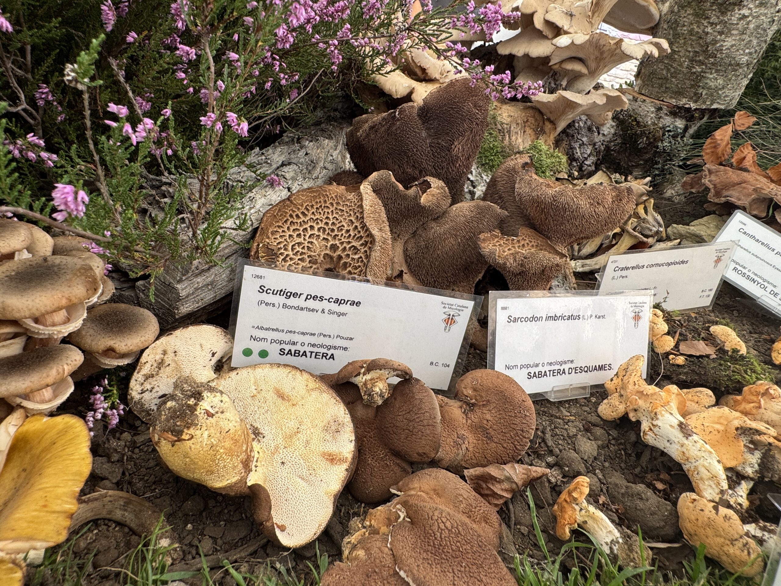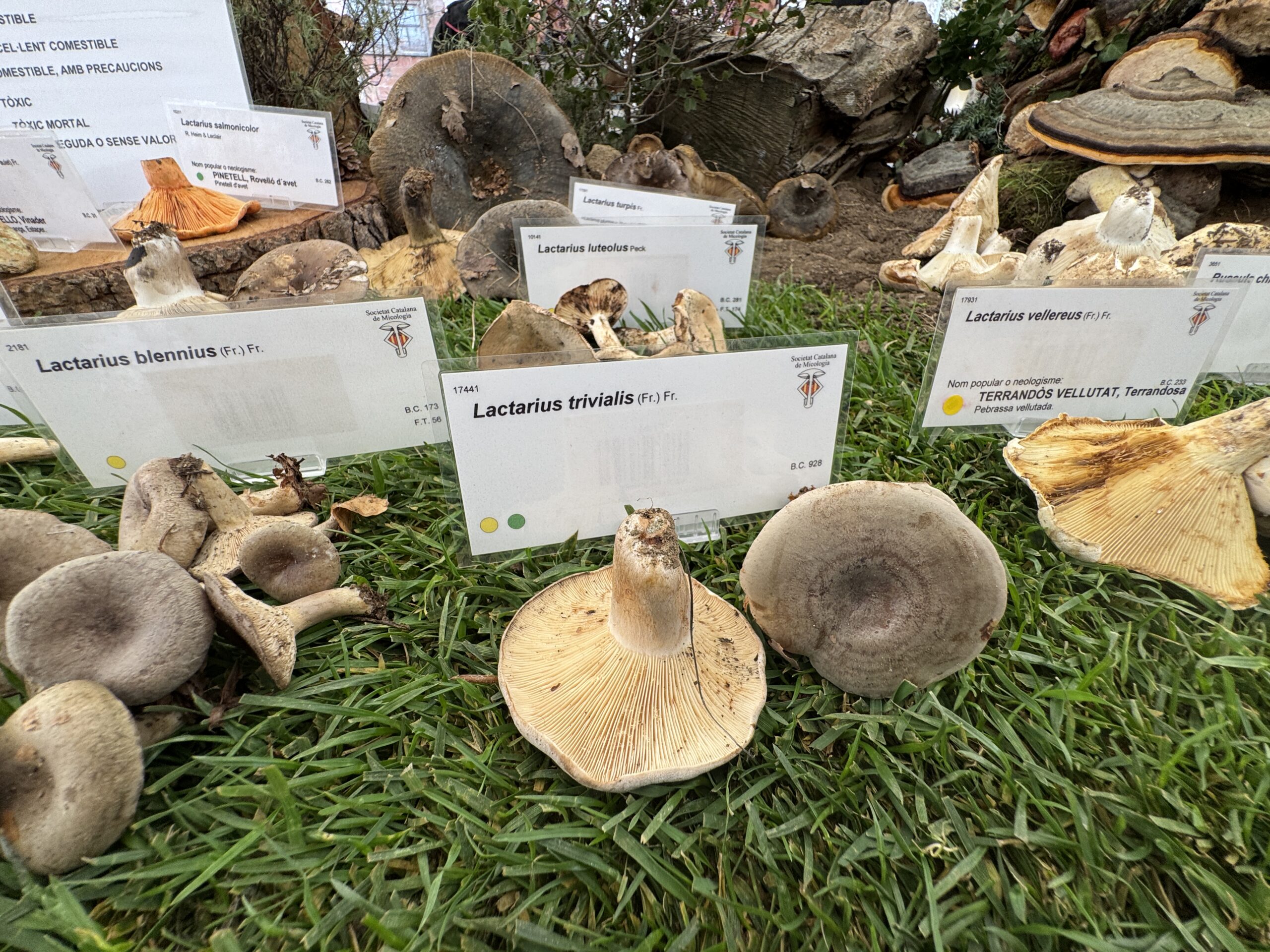 Когда мы добрались до Festa del Bolet de Seva 2025, там уже закончились основные массовые мероприятия. Гигантская грибная сковорода кормила последних жедающих. Но мы не претендовали на это блюдо — в сковороду грибы насыпают из ящиков, особо не перебирая — там и щепки, и всякий мусор. Из лесных грибов в этих ящиках только лисички. Плюс к ним продается в комплекте хлеб и вино, которые мы не едим. Мы прошли до хорошей грибной выставки и купили шиитаке с грибной фермы и варенье.