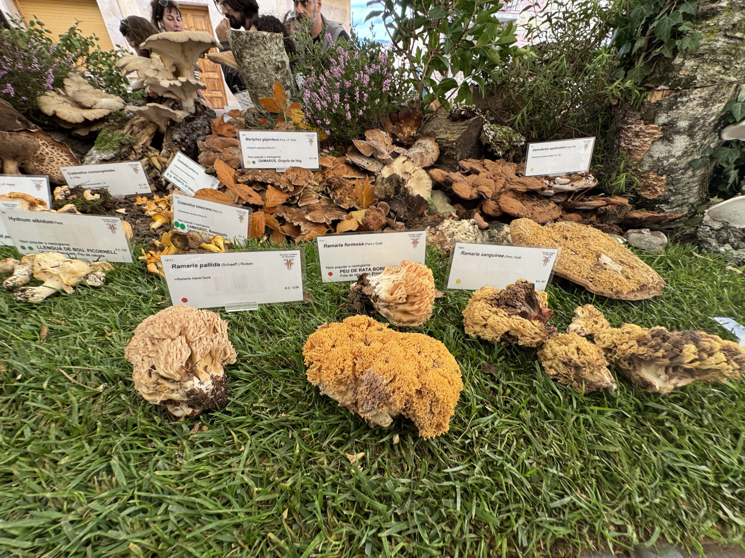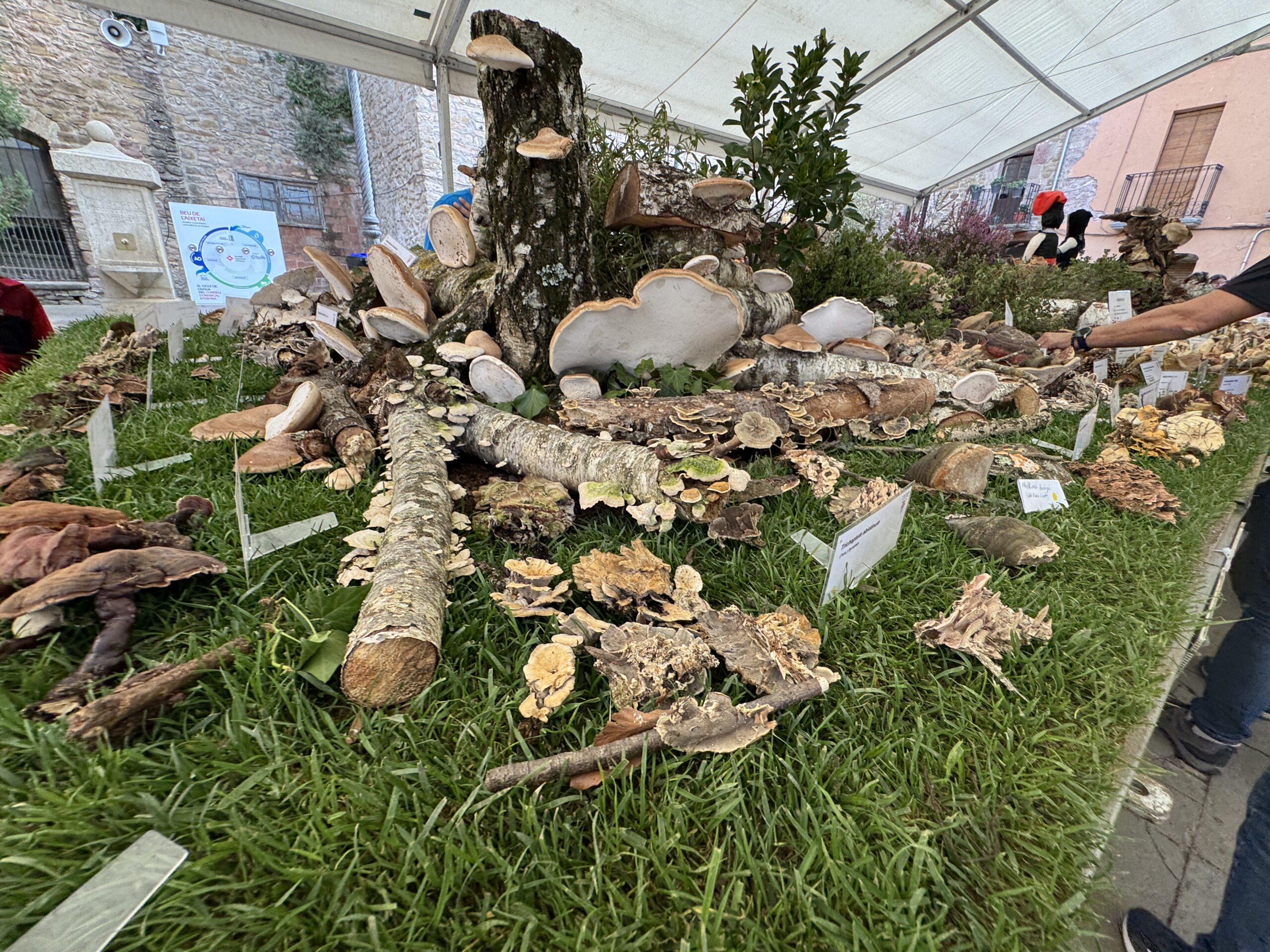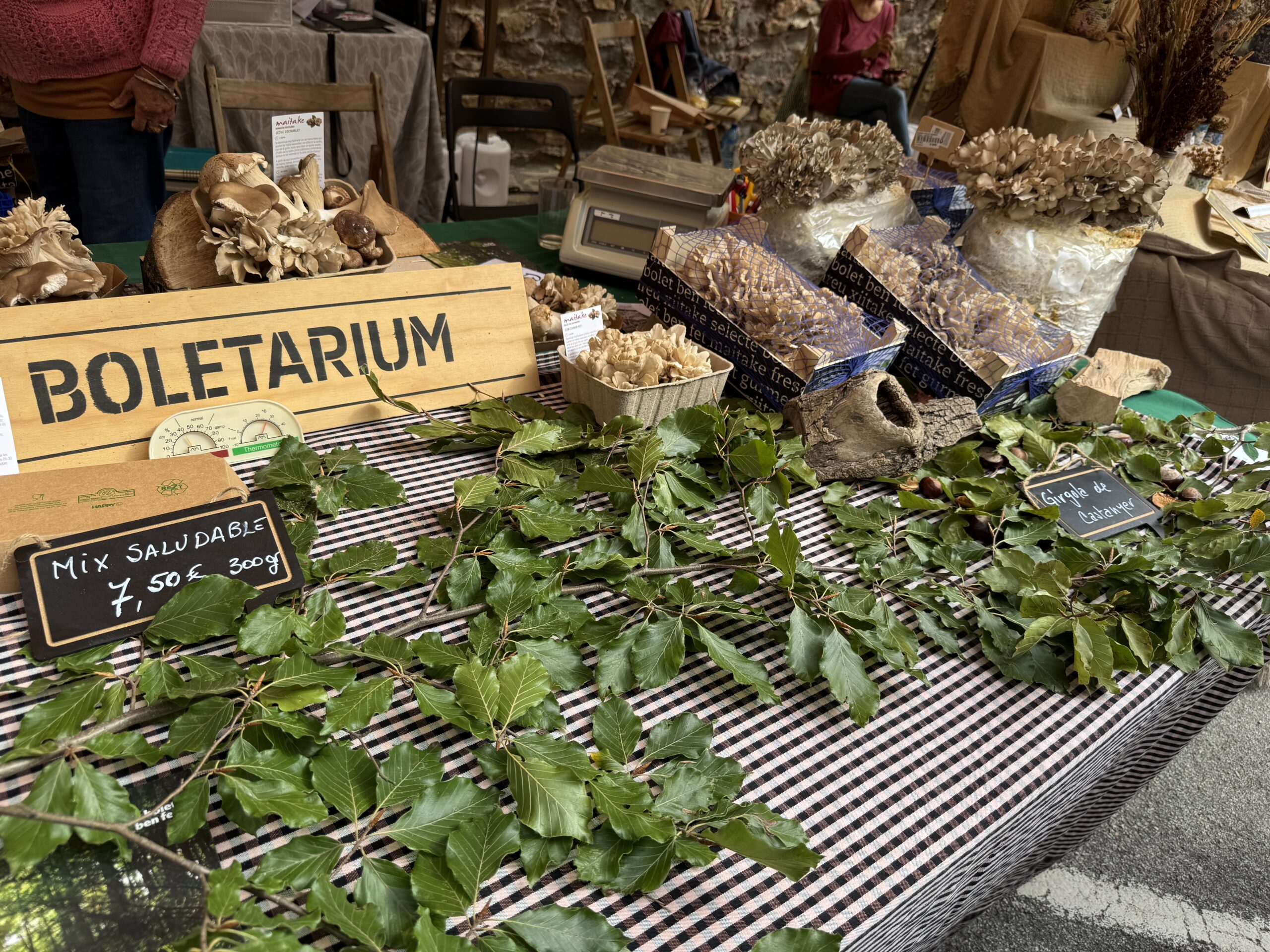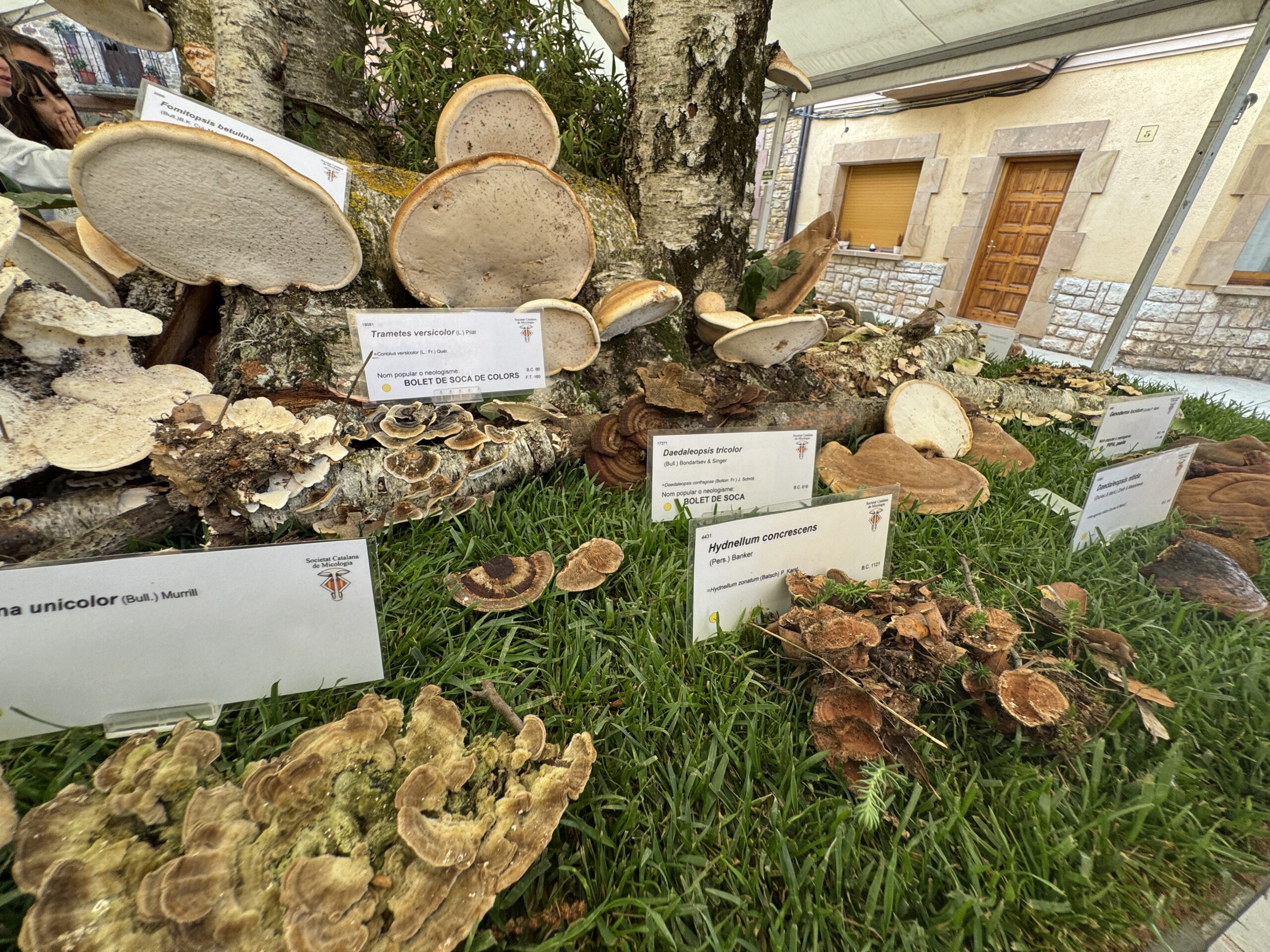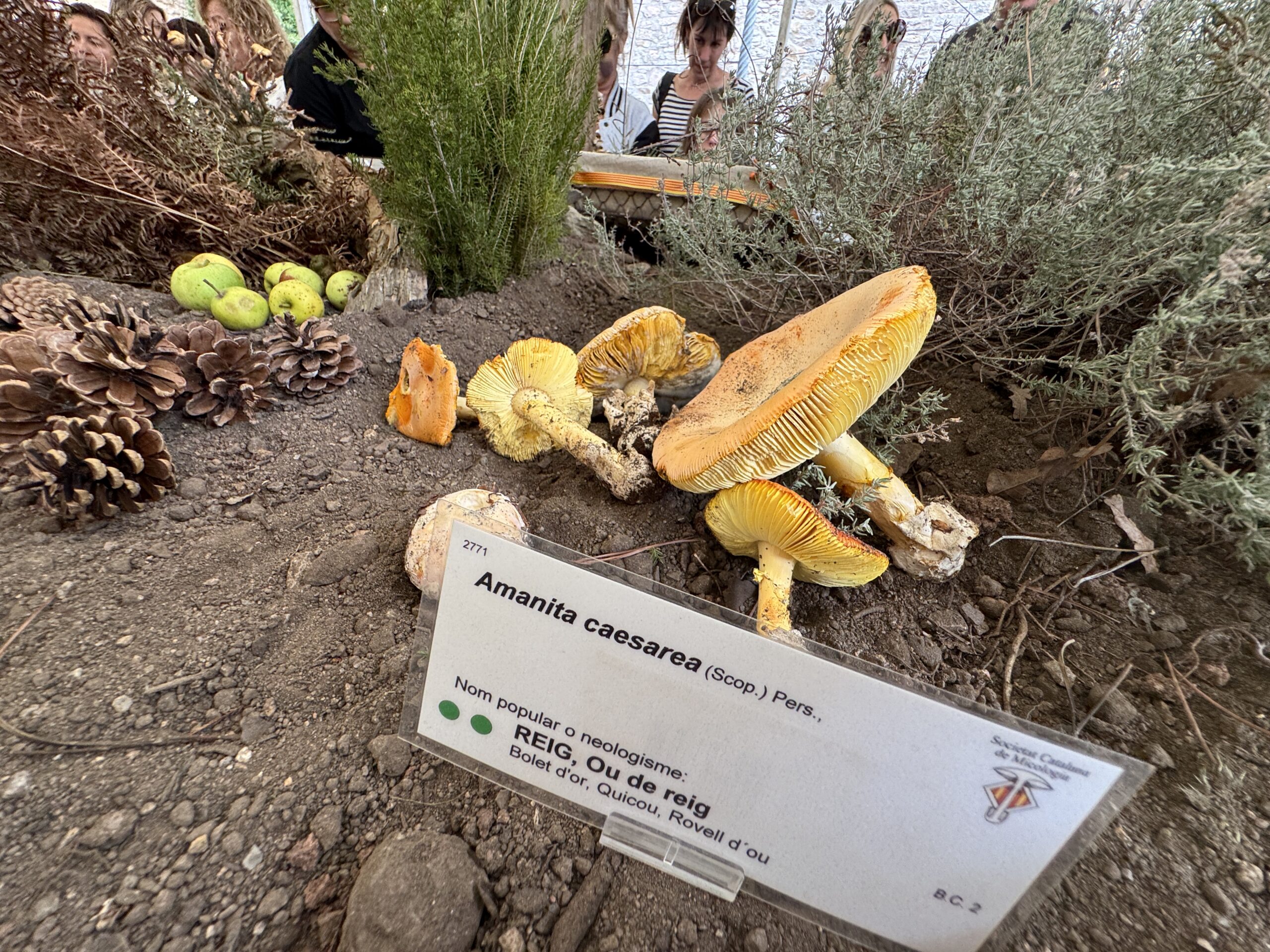 Когда мы добрались до Festa del Bolet de Seva 2025, там уже закончились основные массовые мероприятия. Гигантская грибная сковорода кормила последних жедающих. Но мы не претендовали на это блюдо — в сковороду грибы насыпают из ящиков, особо не перебирая — там и щепки, и всякий мусор. Из лесных грибов в этих ящиках только лисички. Плюс к ним продается в комплекте хлеб и вино, которые мы не едим. Мы прошли до хорошей грибной выставки и купили шиитаке с грибной фермы и варенье.