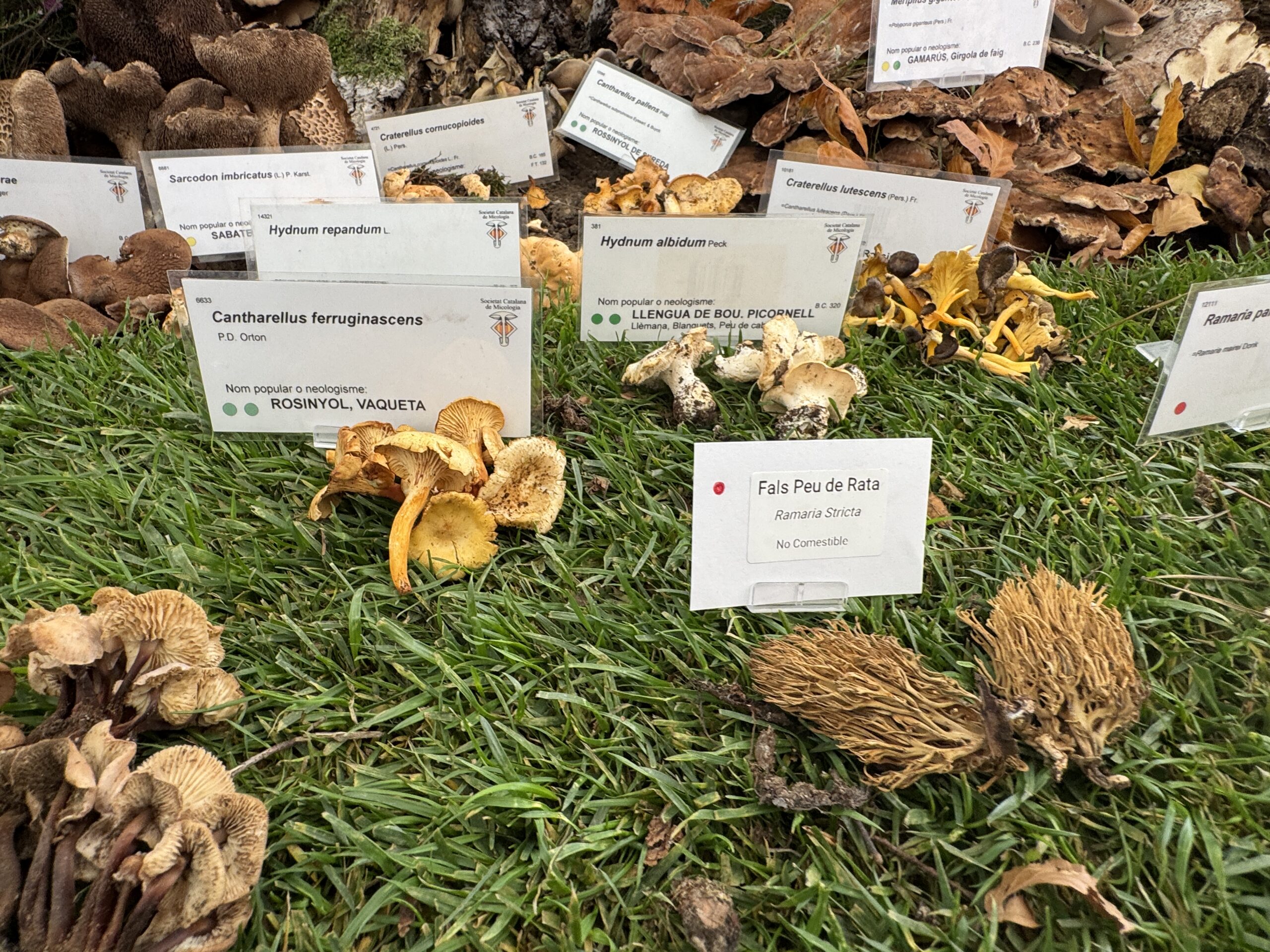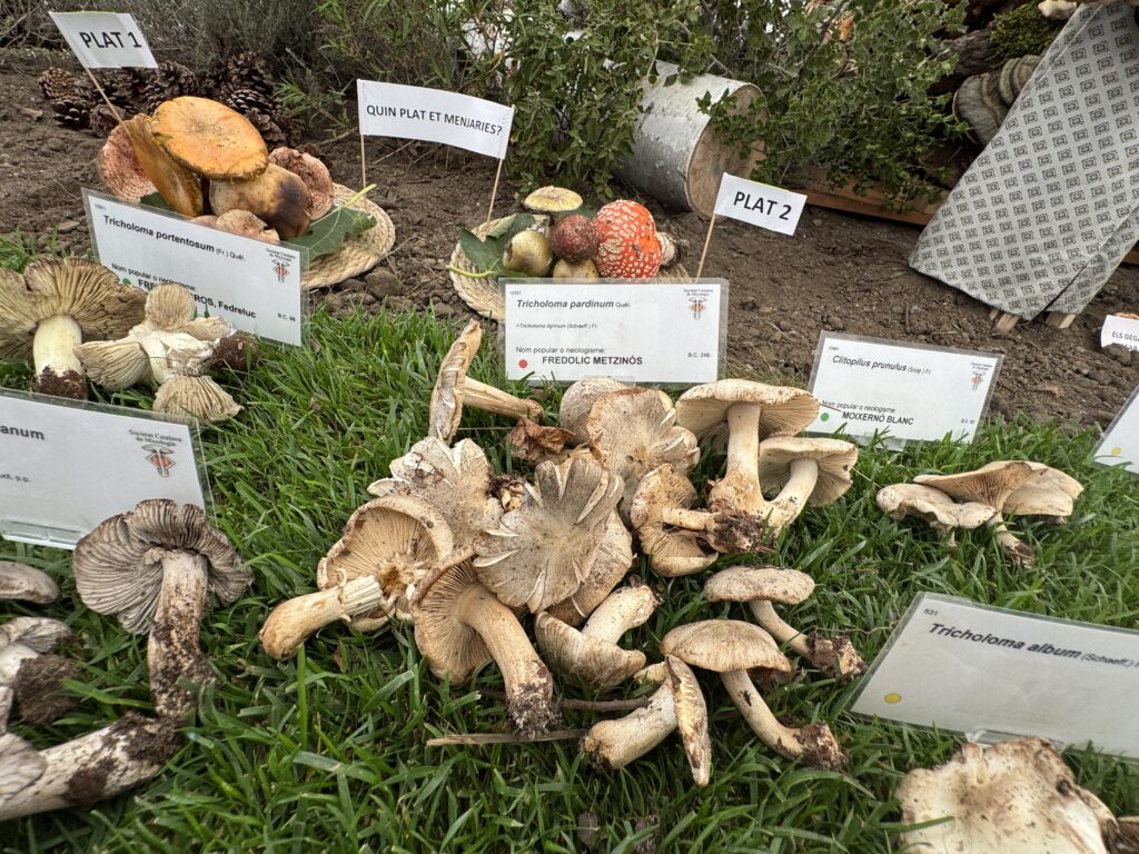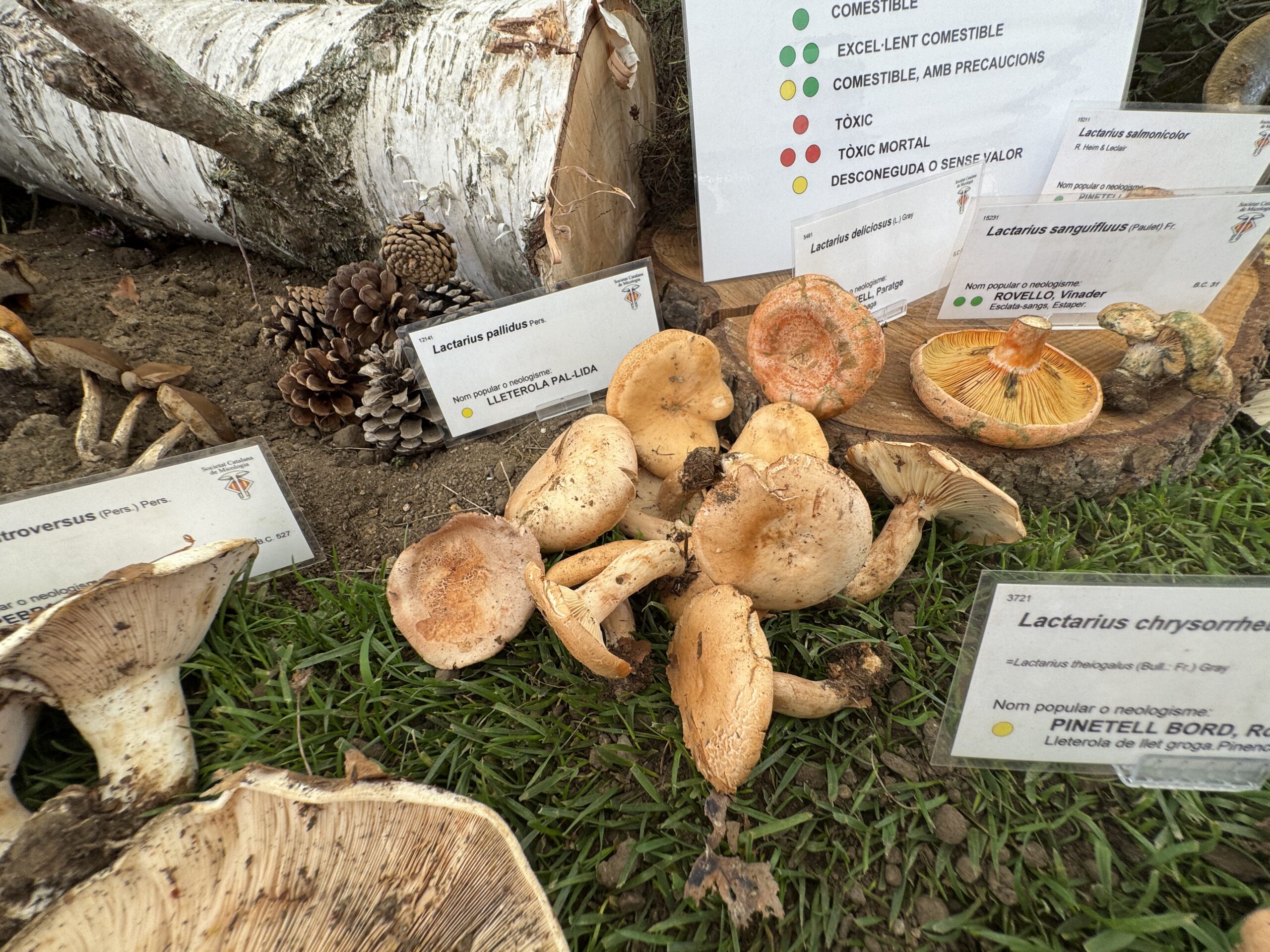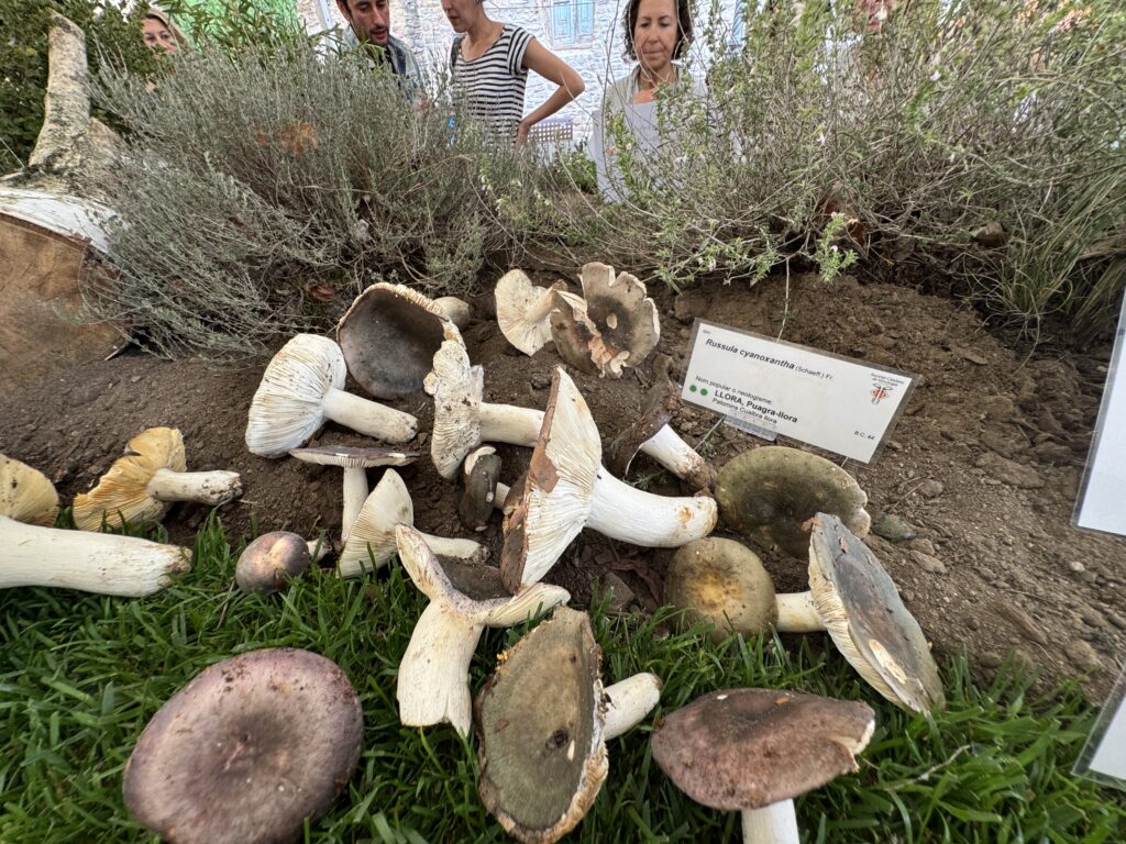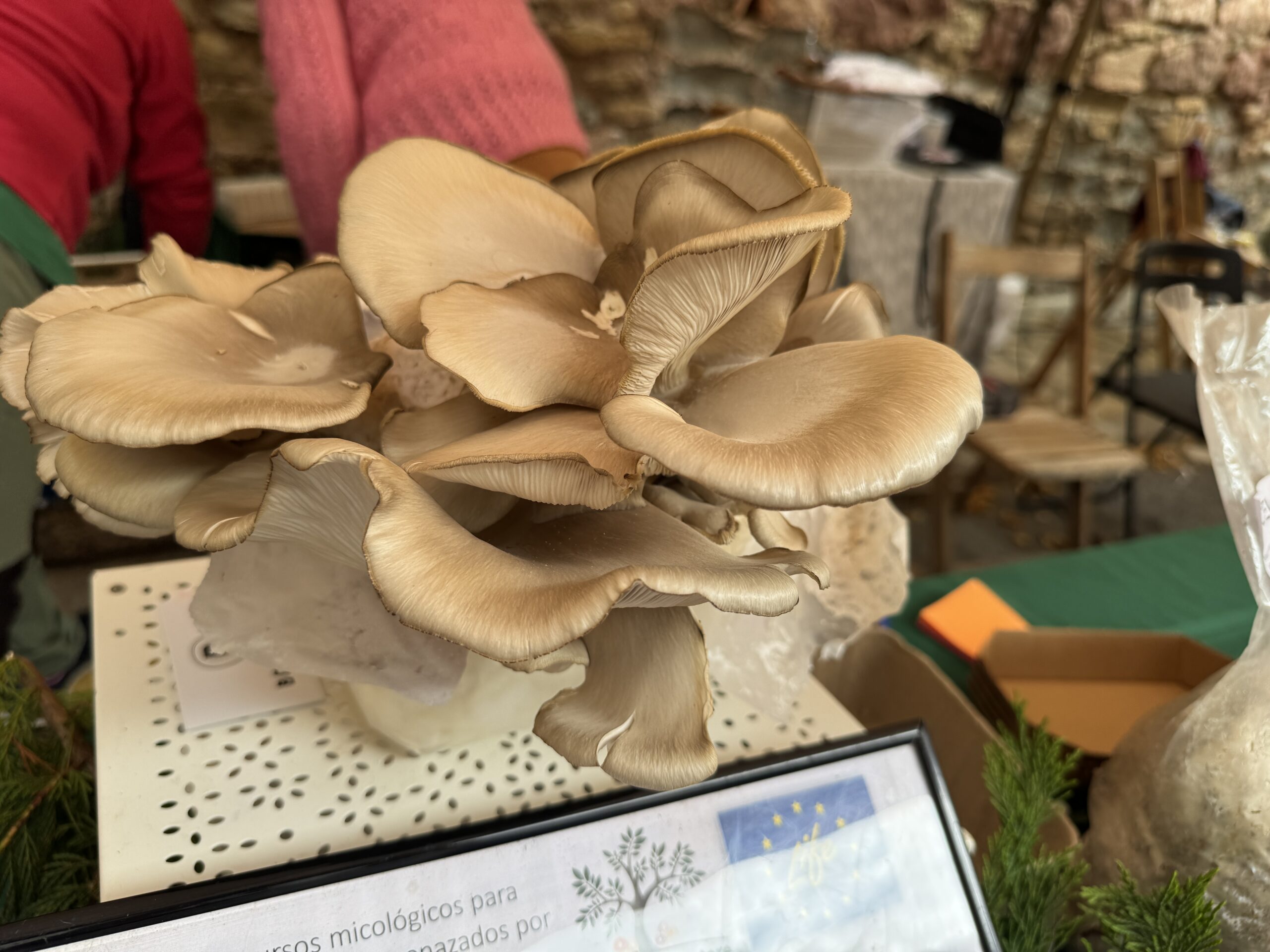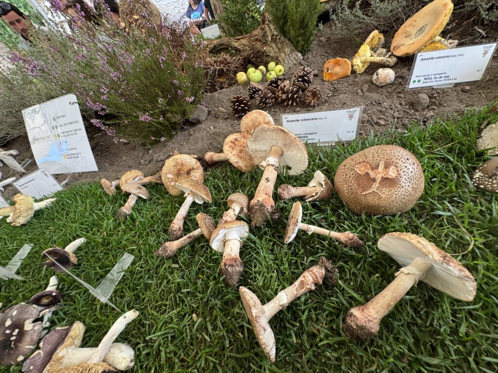 Когда мы добрались до Festa del Bolet de Seva 2025, там уже закончились основные массовые мероприятия. Гигантская грибная сковорода кормила последних жедающих. Но мы не претендовали на это блюдо — в сковороду грибы насыпают из ящиков, особо не перебирая — там и щепки, и всякий мусор. Из лесных грибов в этих ящиках только лисички. Плюс к ним продается в комплекте хлеб и вино, которые мы не едим. Мы прошли до хорошей грибной выставки и купили шиитаке с грибной фермы и варенье.