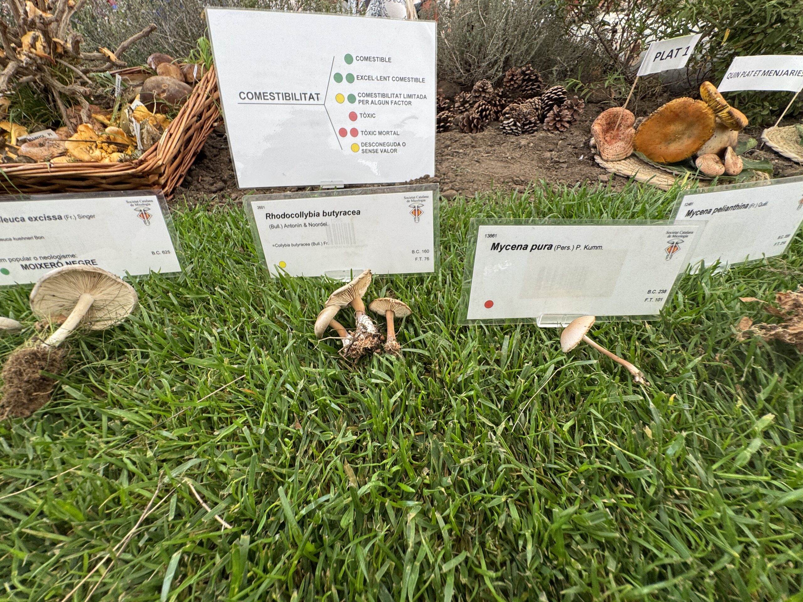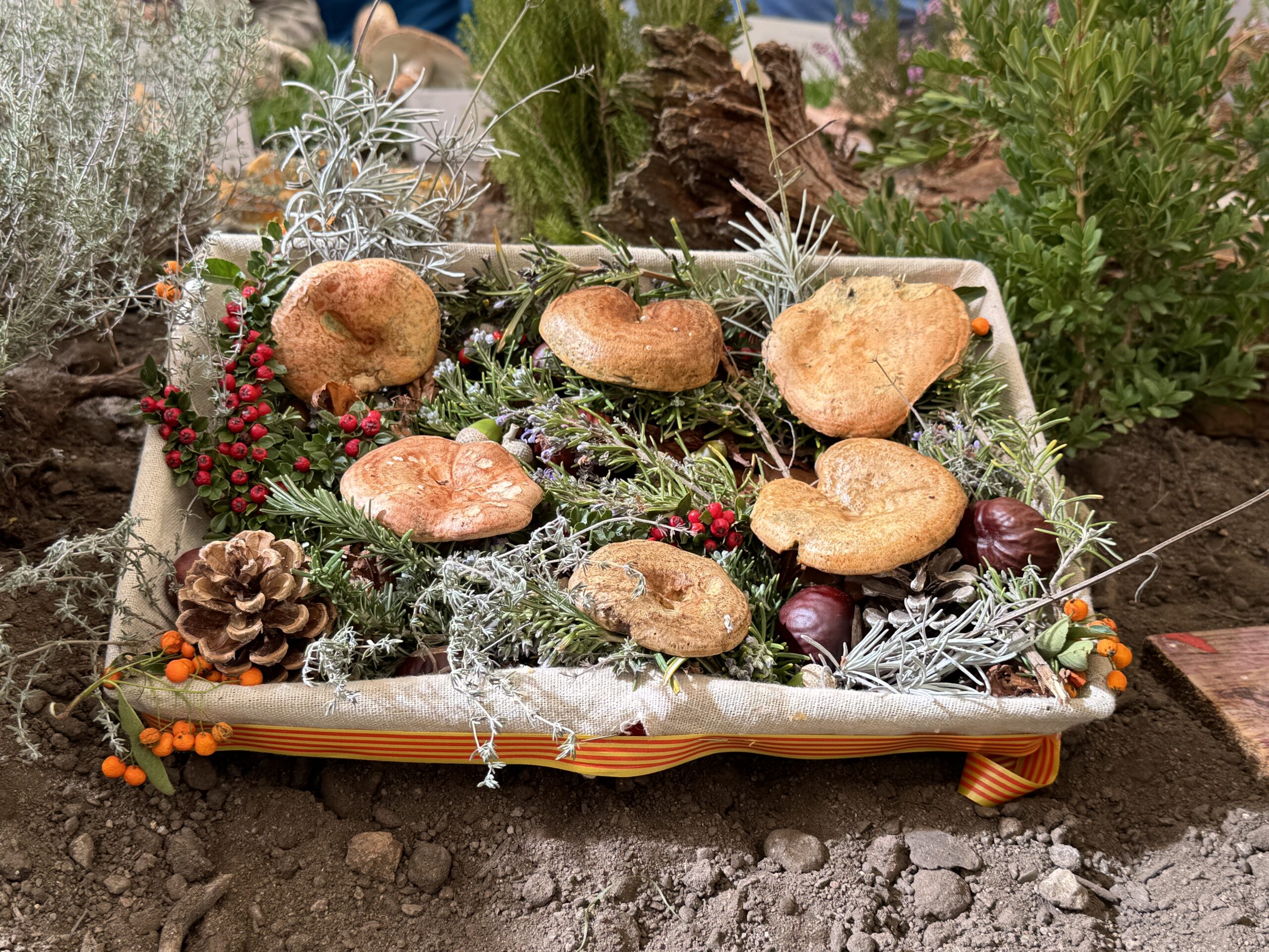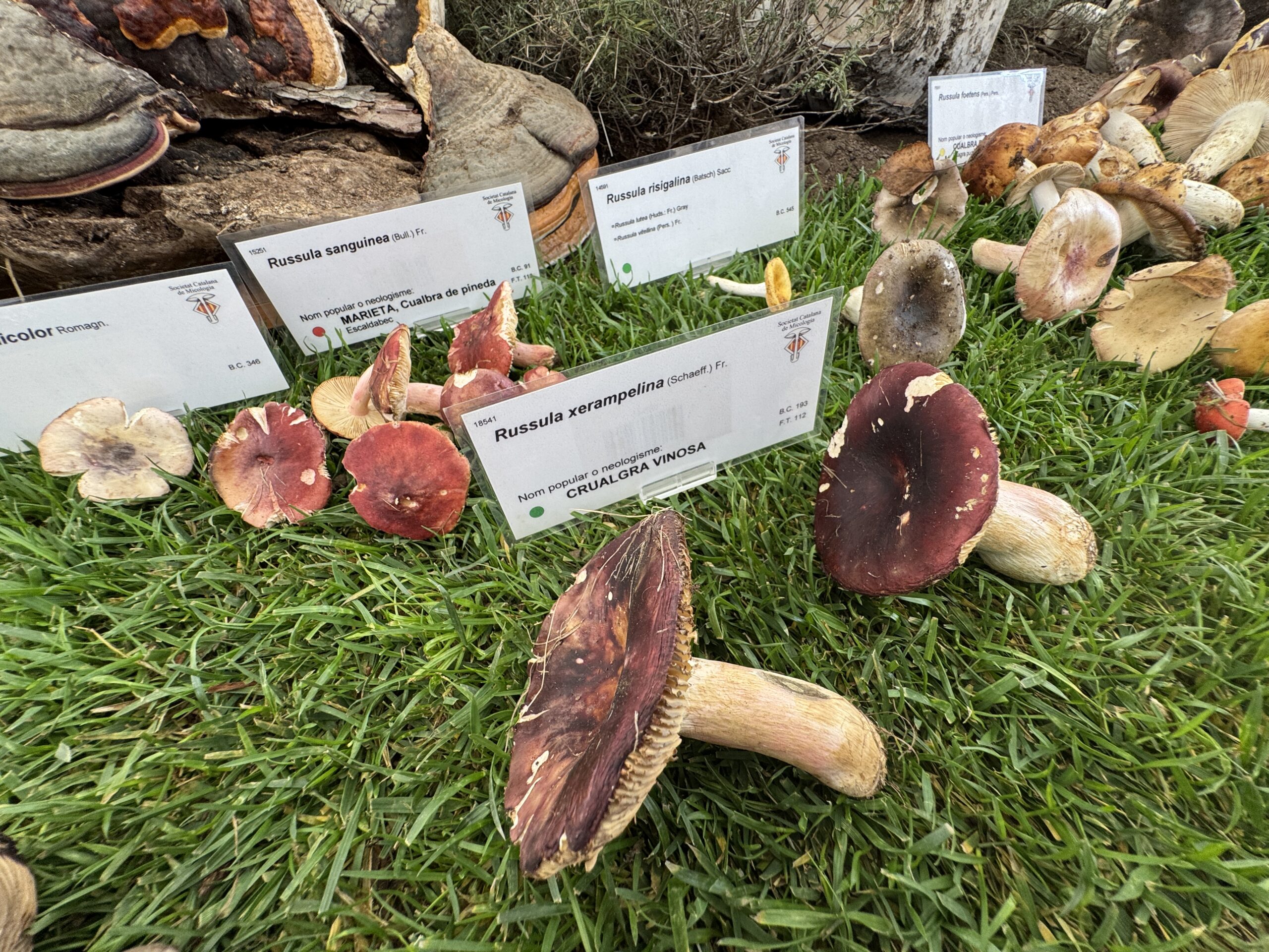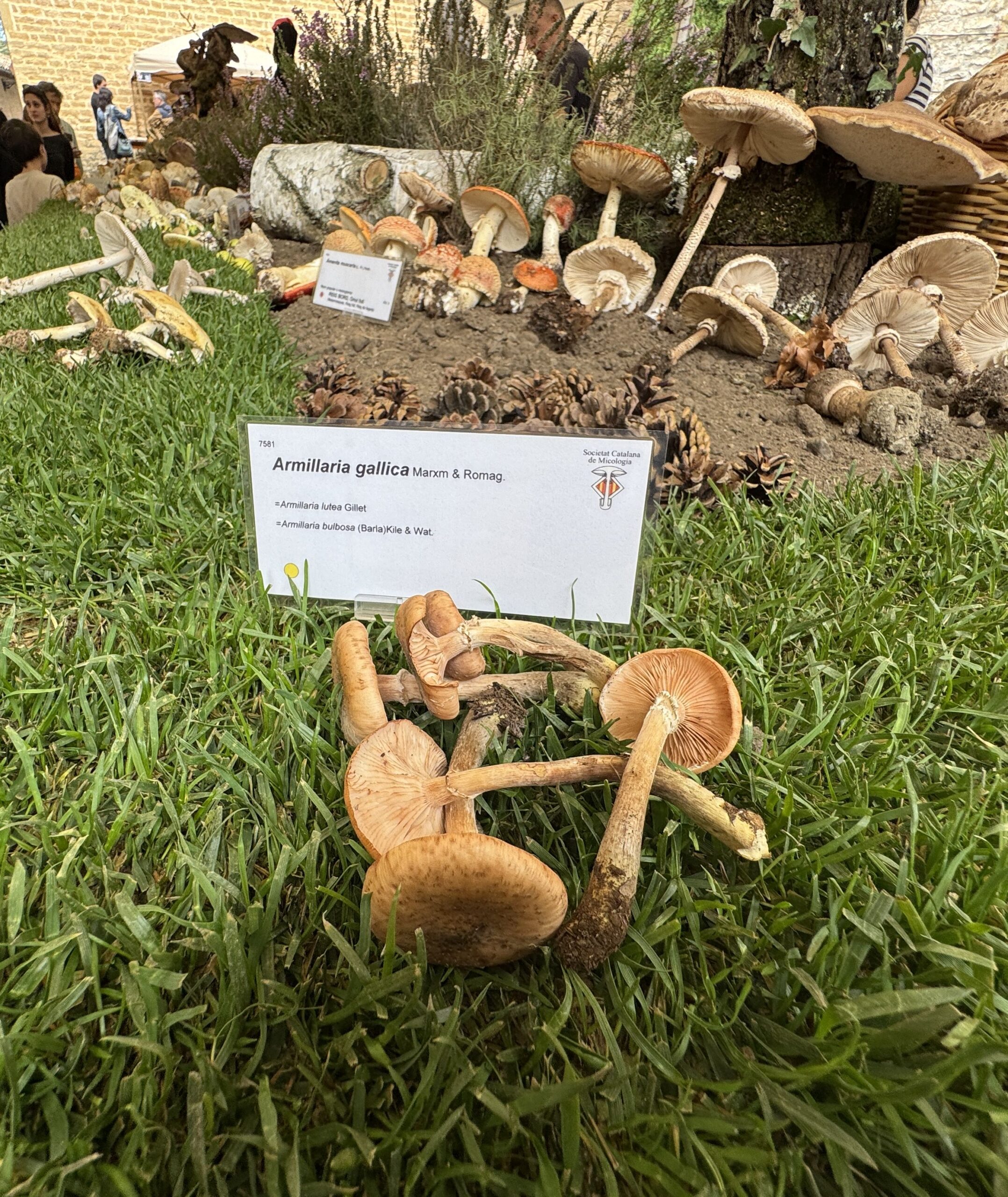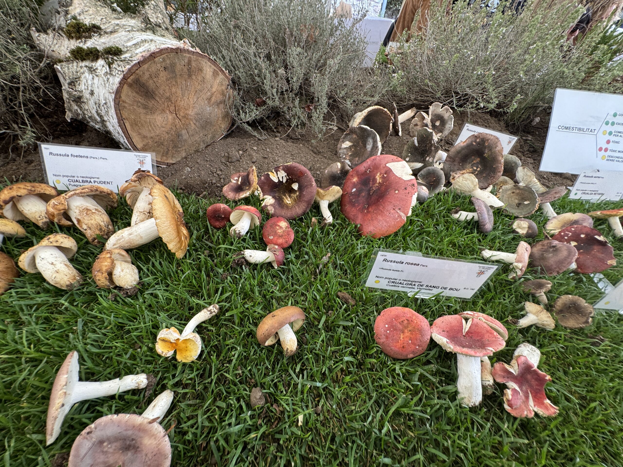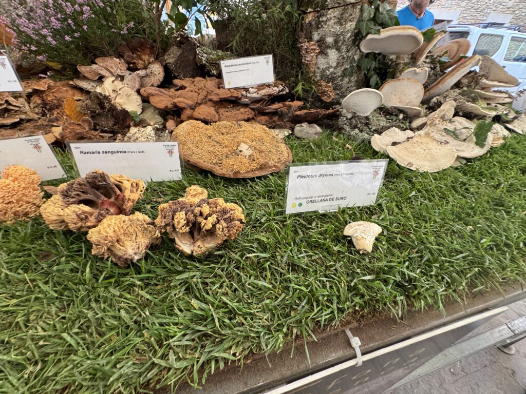Когда мы добрались до Festa del Bolet de Seva 2025, там уже закончились основные массовые мероприятия. Гигантская грибная сковорода кормила последних жедающих. Но мы не претендовали на это блюдо — в сковороду грибы насыпают из ящиков, особо не перебирая — там и щепки, и всякий мусор. Из лесных грибов в этих ящиках только лисички. Плюс к ним продается в комплекте хлеб и вино, которые мы не едим. Мы прошли до хорошей грибной выставки и купили шиитаке с грибной фермы и варенье.