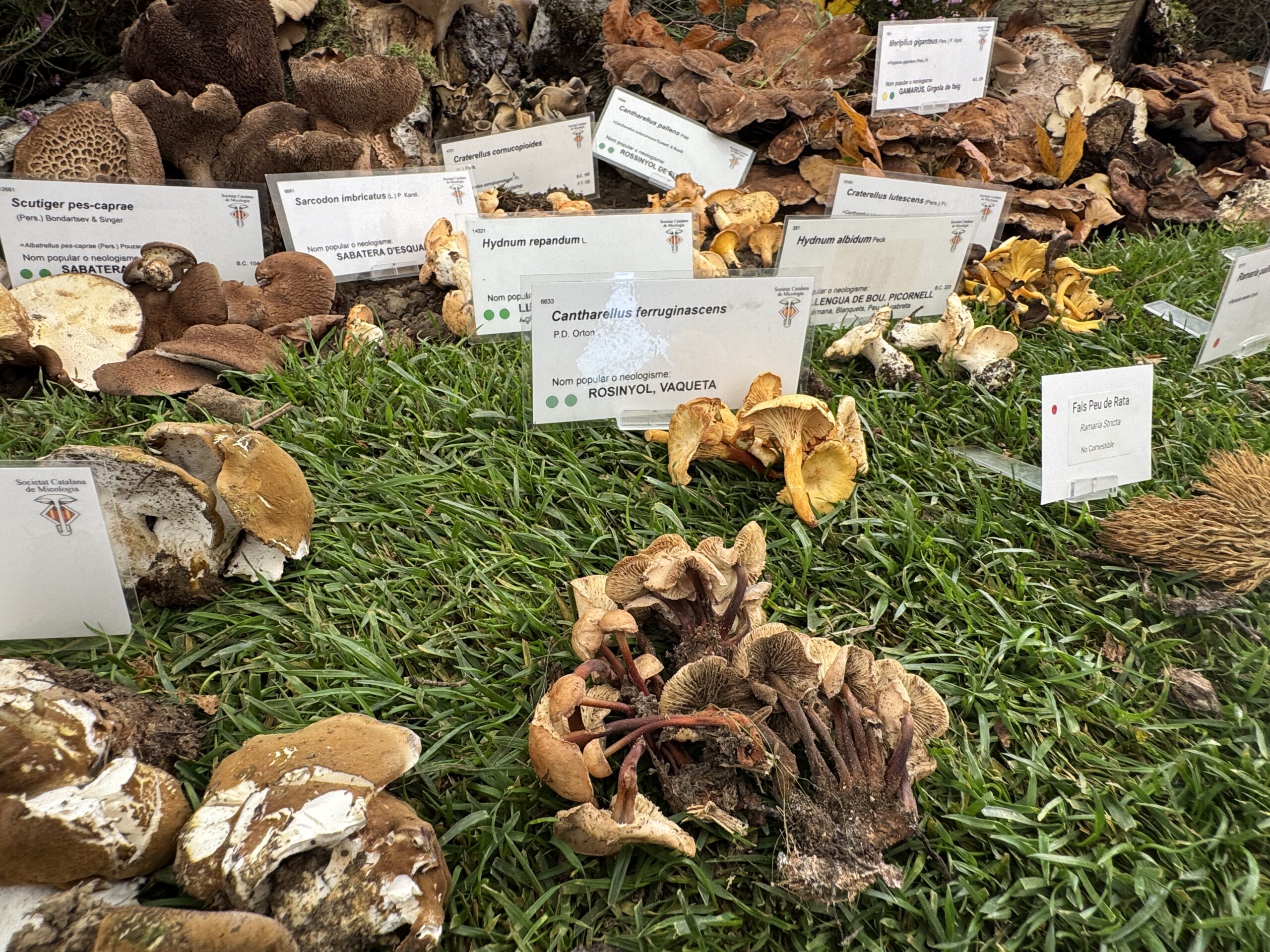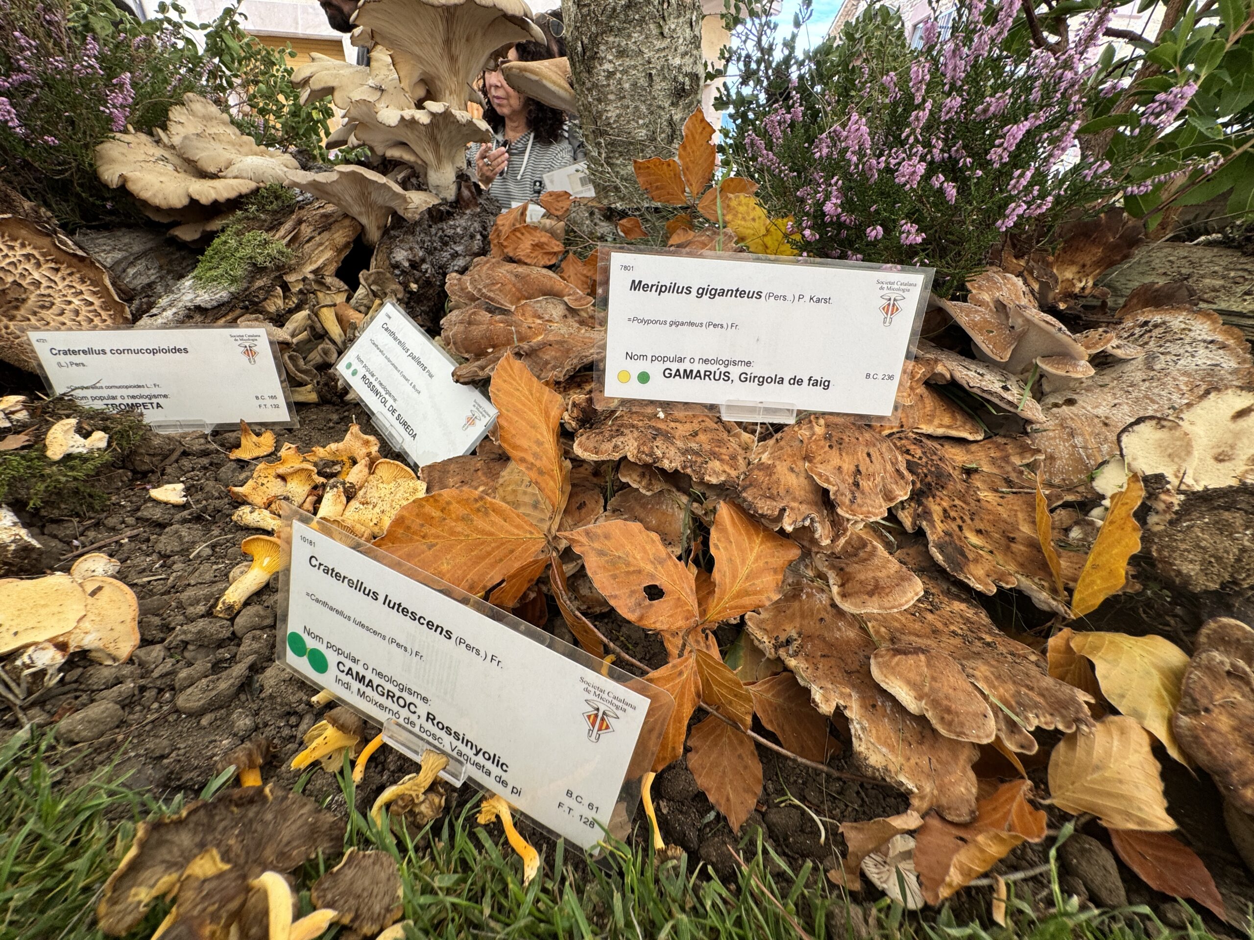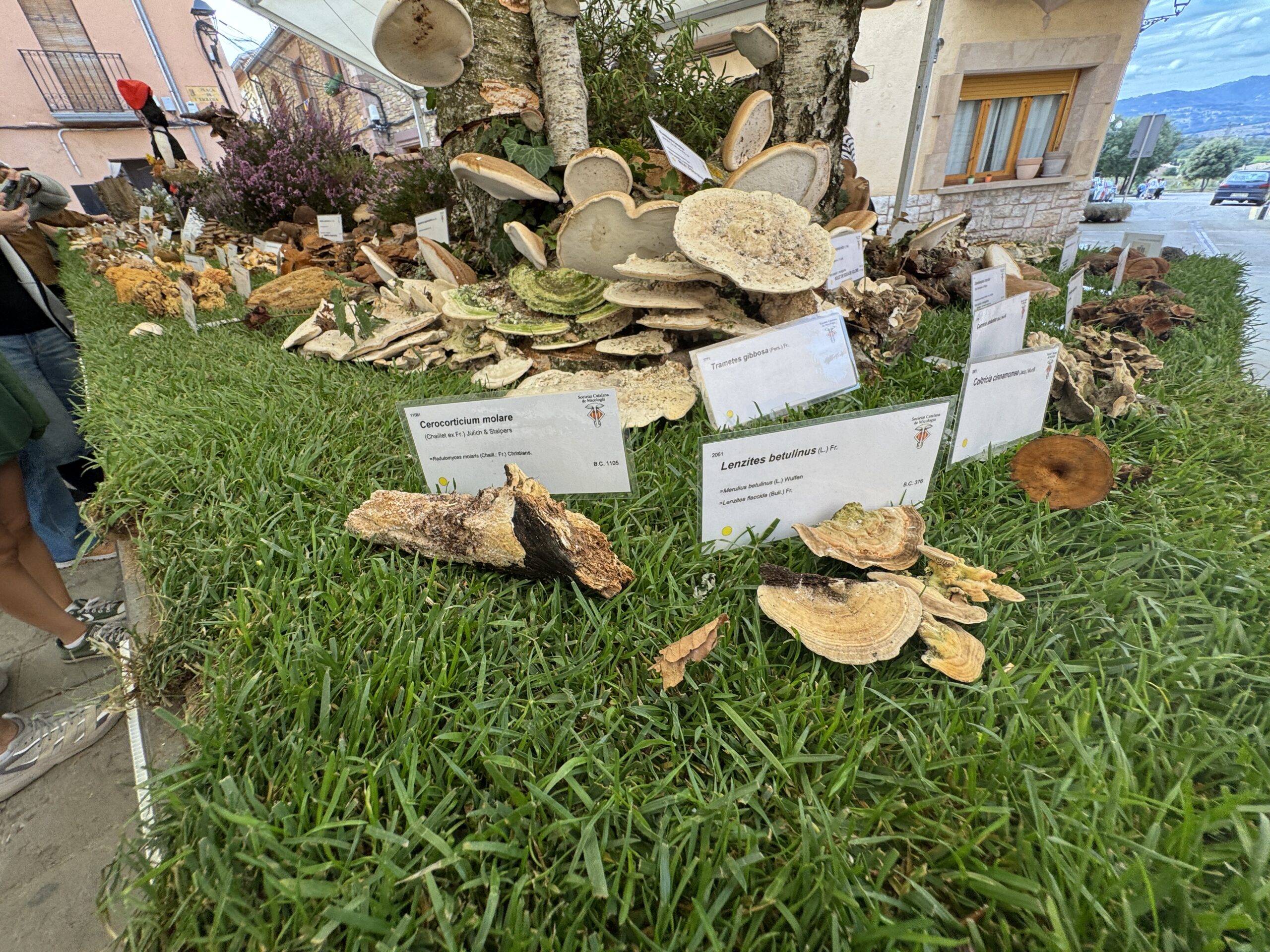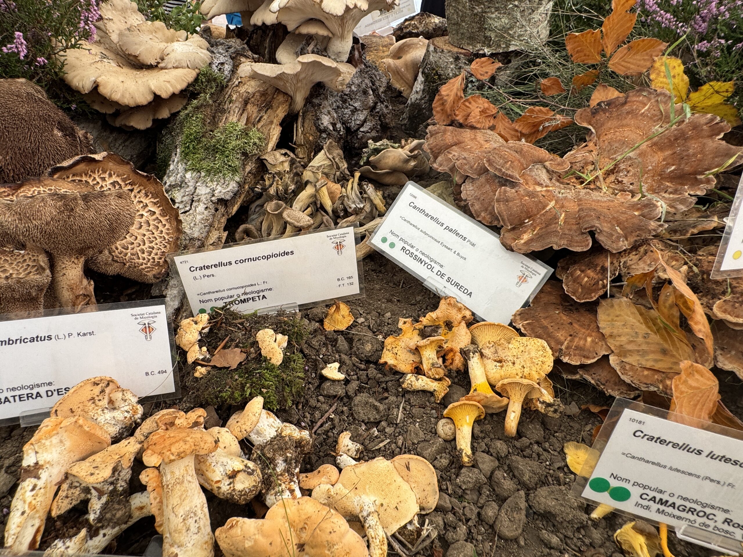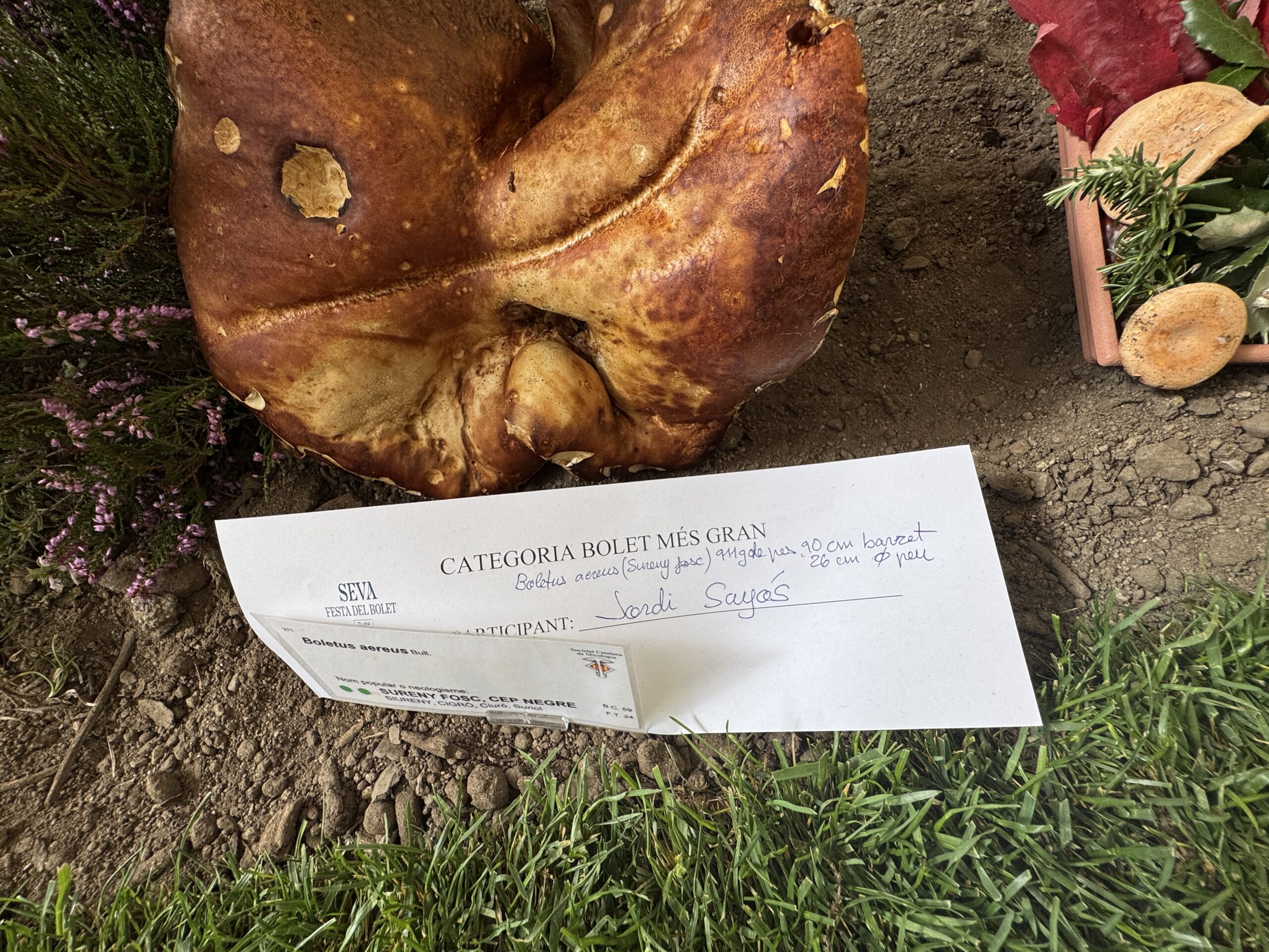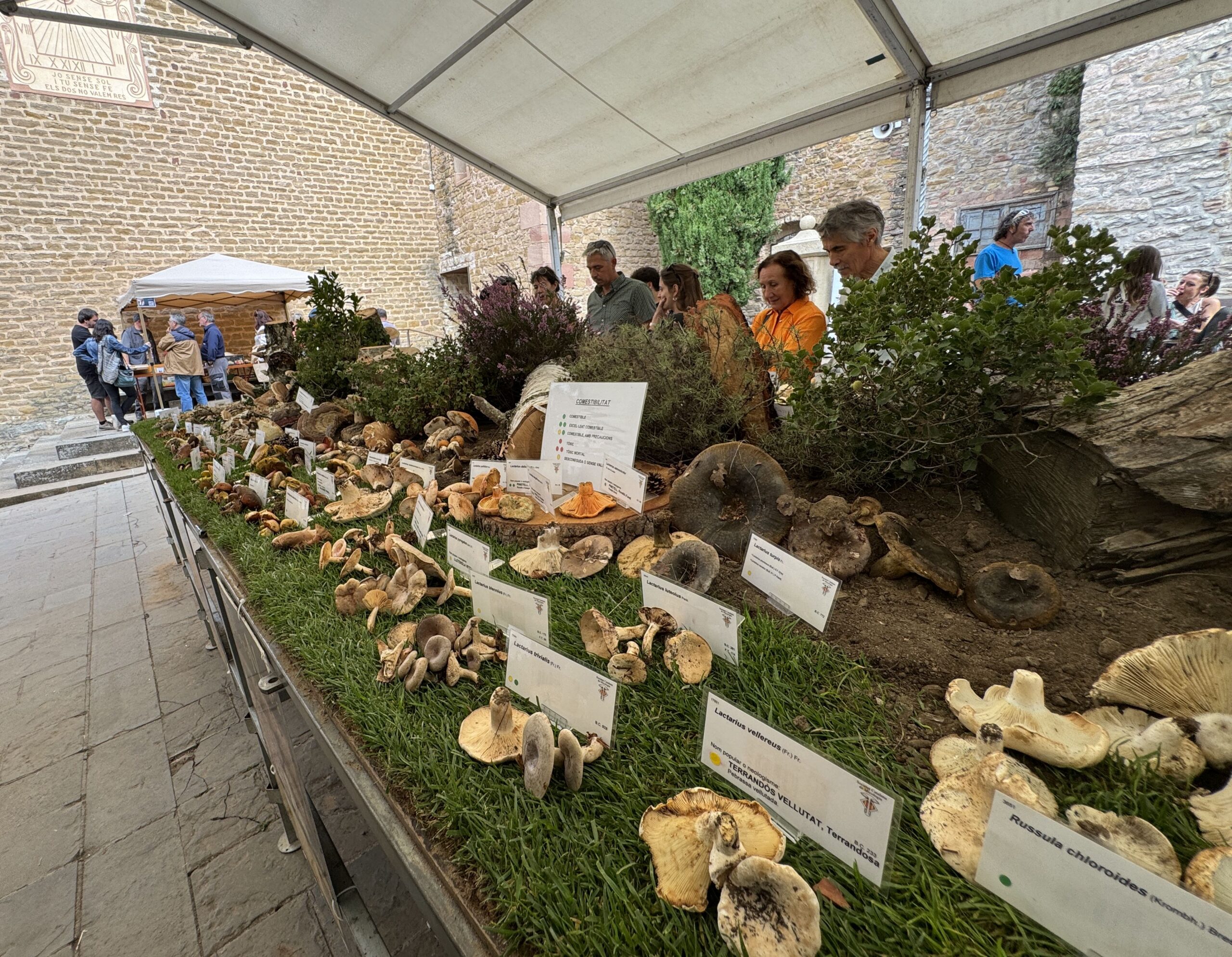 Когда мы добрались до Festa del Bolet de Seva 2025, там уже закончились основные массовые мероприятия. Гигантская грибная сковорода кормила последних жедающих. Но мы не претендовали на это блюдо — в сковороду грибы насыпают из ящиков, особо не перебирая — там и щепки, и всякий мусор. Из лесных грибов в этих ящиках только лисички. Плюс к ним продается в комплекте хлеб и вино, которые мы не едим. Мы прошли до хорошей грибной выставки и купили шиитаке с грибной фермы и варенье.