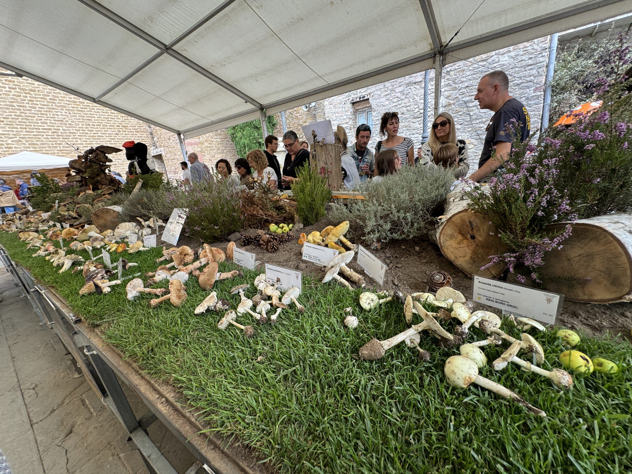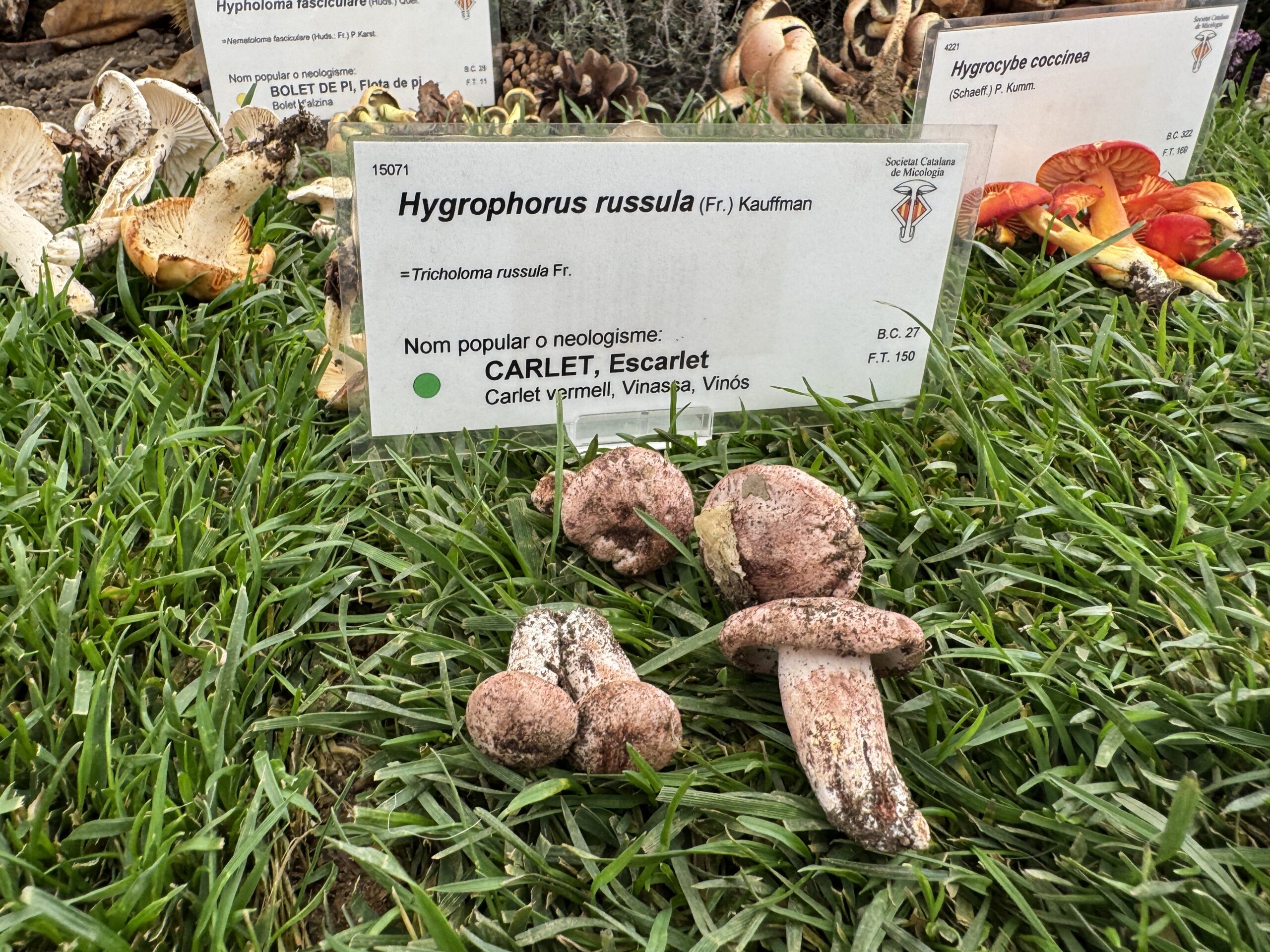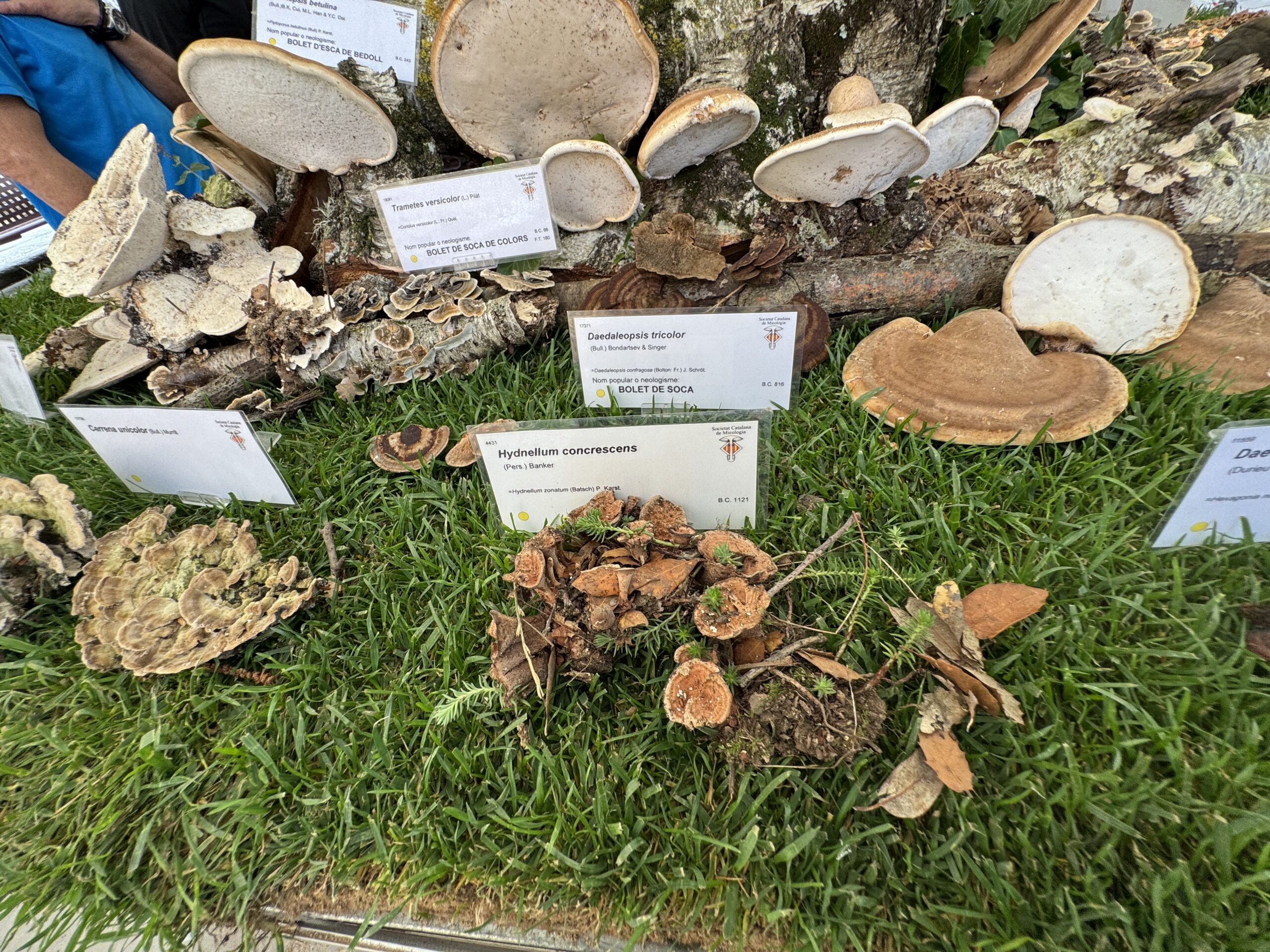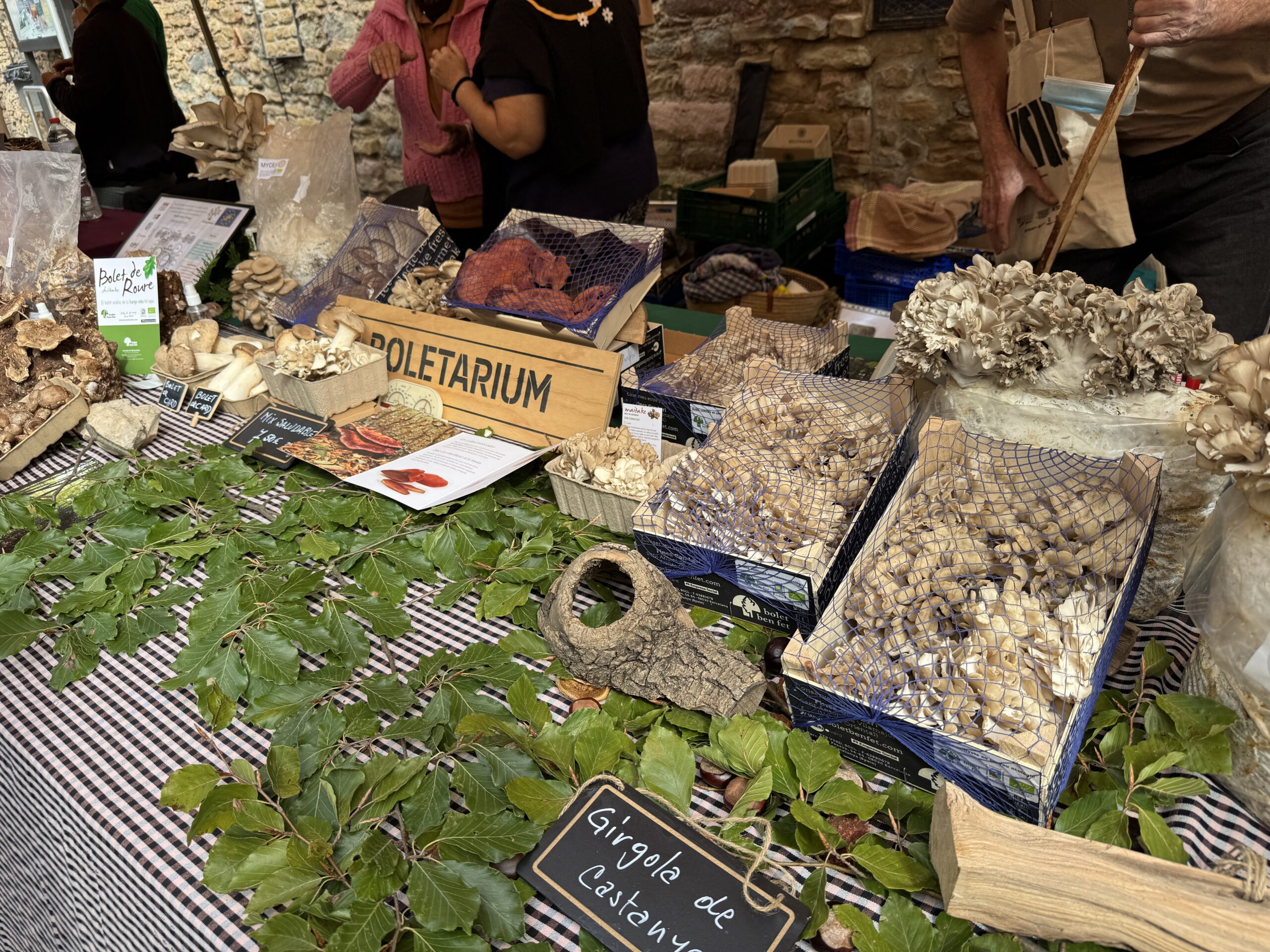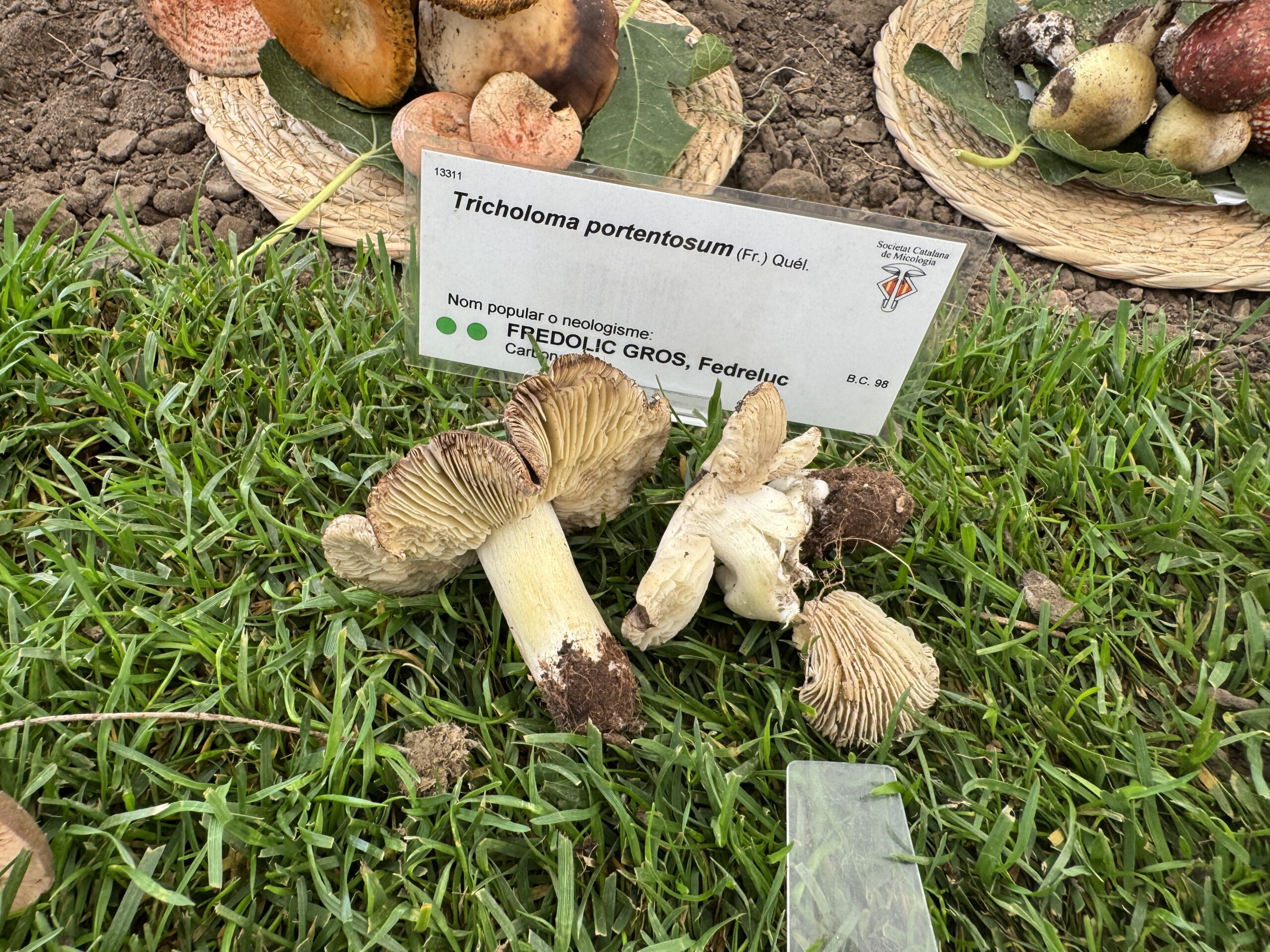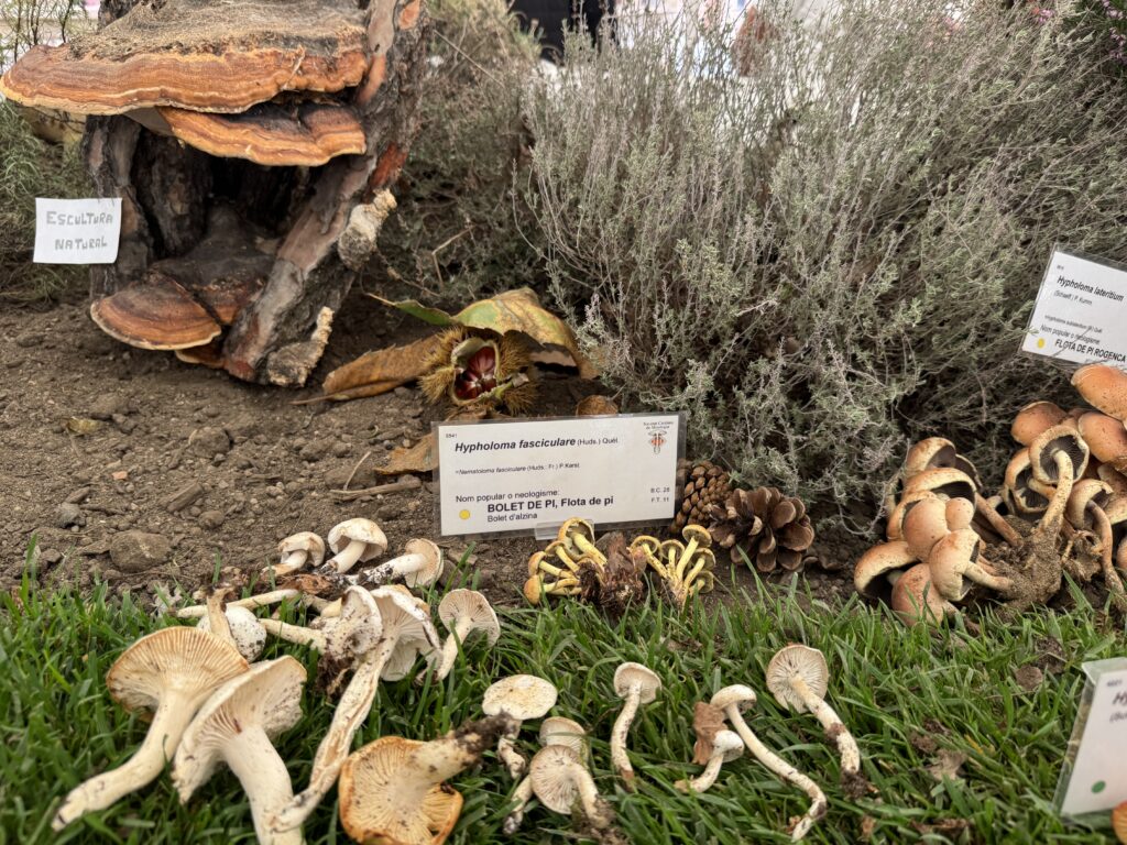 Когда мы добрались до Festa del Bolet de Seva 2025, там уже закончились основные массовые мероприятия. Гигантская грибная сковорода кормила последних жедающих. Но мы не претендовали на это блюдо — в сковороду грибы насыпают из ящиков, особо не перебирая — там и щепки, и всякий мусор. Из лесных грибов в этих ящиках только лисички. Плюс к ним продается в комплекте хлеб и вино, которые мы не едим. Мы прошли до хорошей грибной выставки и купили шиитаке с грибной фермы и варенье.