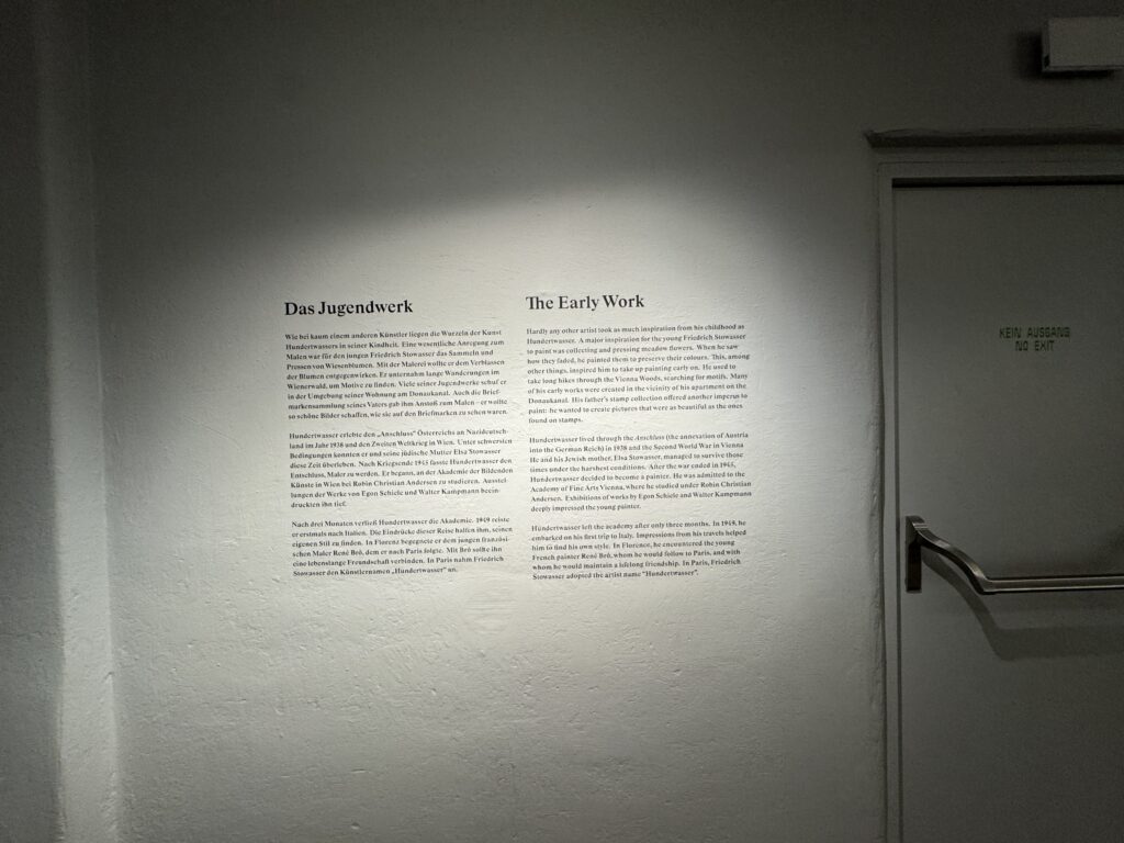 Хундертвассер выработал свой независимый стиль в начале 1950-х годов, вдохновившись поездками в Италию, Францию, Испанию и Северную Африку. Будь то впечатления от византийского искусства, средневековых и ренессансных фресок в Северной Италии, знакомство с экспрессионизмом или особая любовь к творчеству Эгона Шиле, Хундертвассер и его искусство формировались под влиянием множества художественных переживаний, а также стран и людей, с которыми он встречался в своих путешествиях.