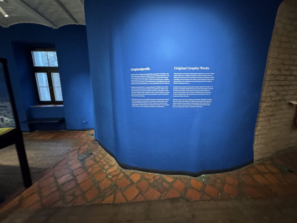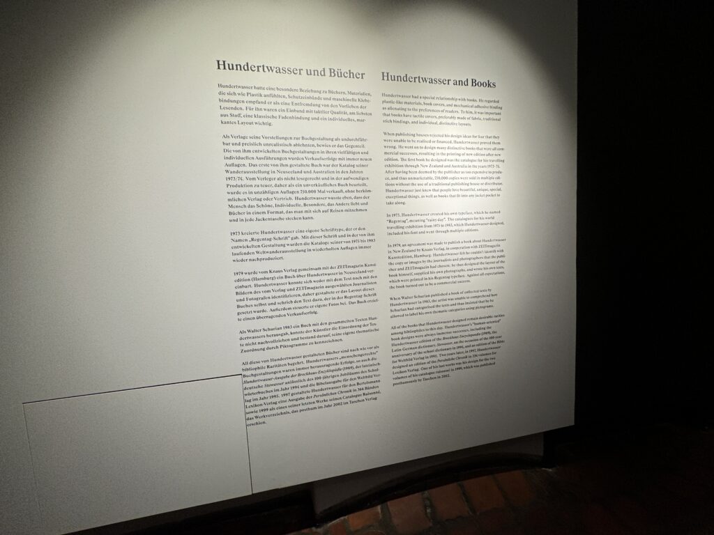 У Хундертвассера были особые отношения с книгами. Он считал, что материалы, похожие на пластик, книжные обложки и механический клеевой переплет не соответствуют предпочтениям читателей. Для него было важно, чтобы книги имели приятные на ощупь обложки, предпочтительно из ткани, традиционный сшитый переплет и индивидуальное, оригинальное оформление.