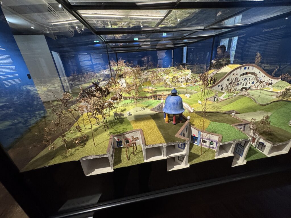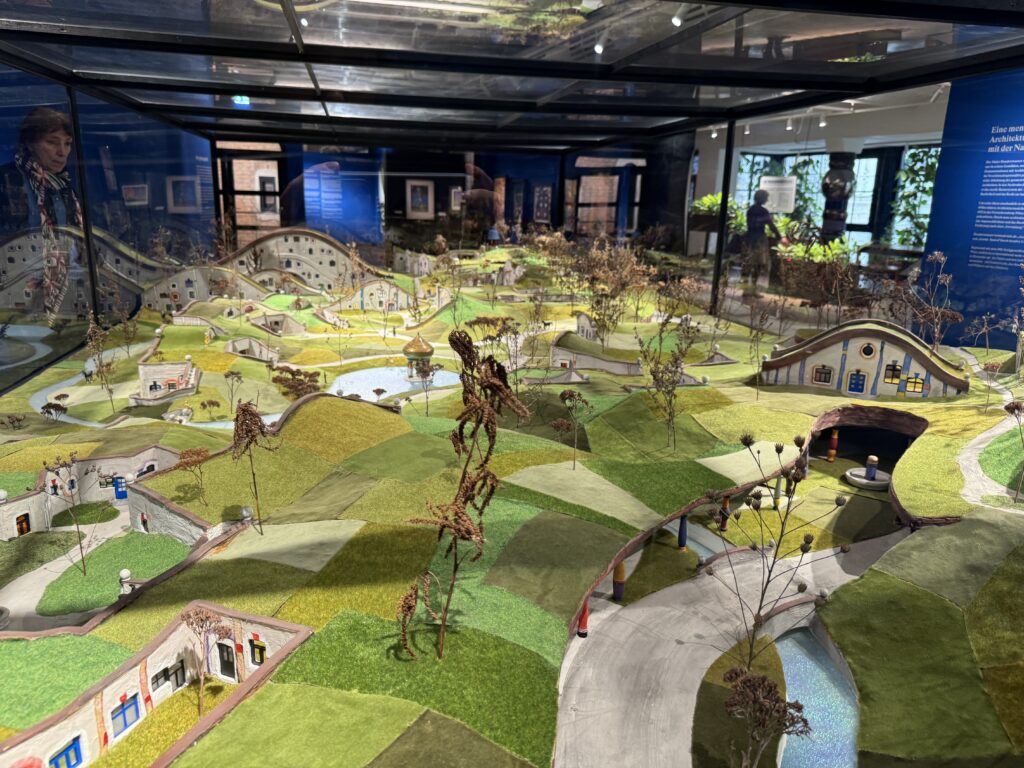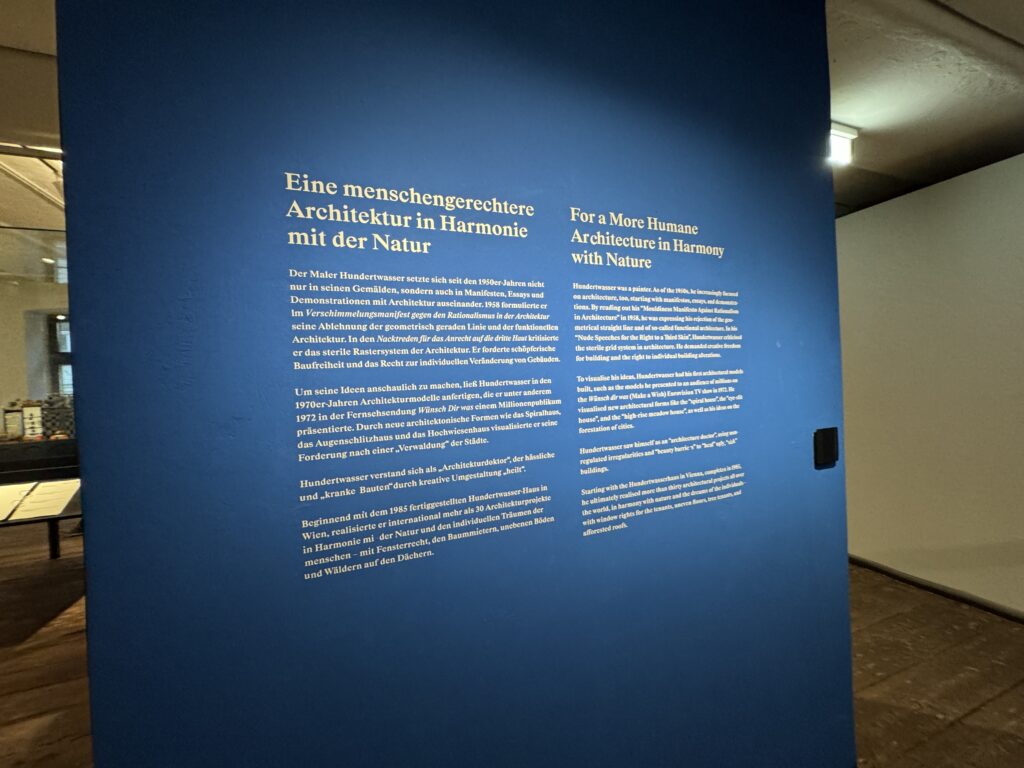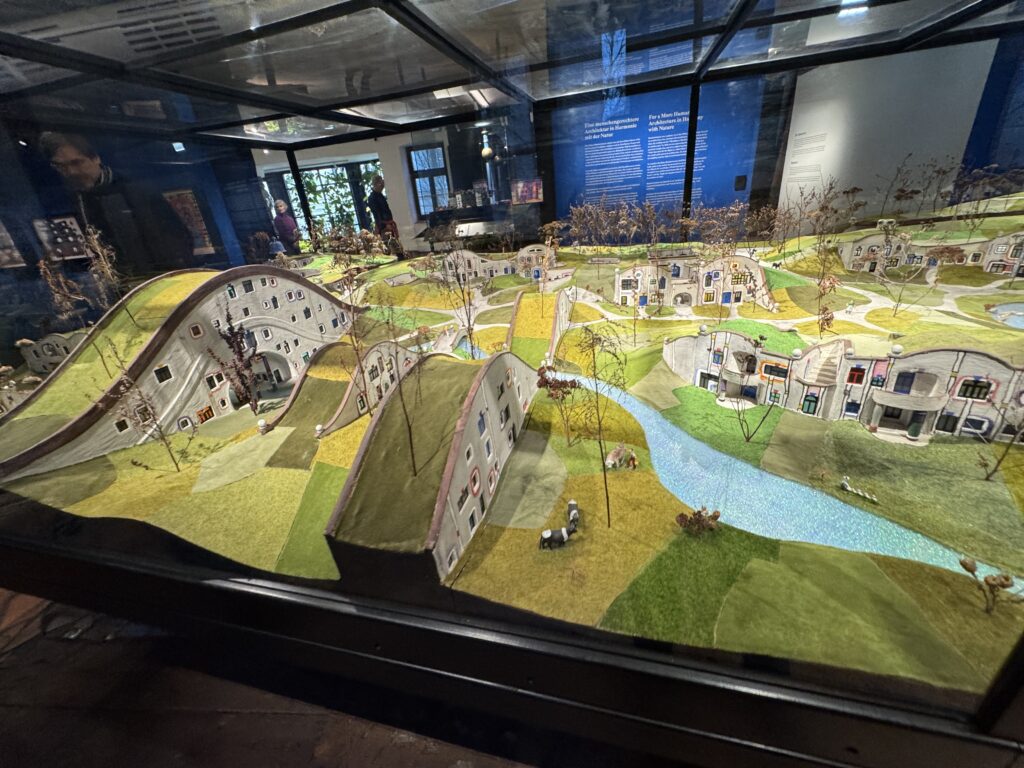 Чтобы визуализировать свои идеи, Хундертвассер создал свои первые архитектурные модели, например, модели, которые он представил многомиллионной аудитории на телешоу «Wünsch dir was» (Загадай желание) «Евровидение» в 1972 году. Он визуализировал новые архитектурные формы, такие как «спиральный дом», «дом-гавайский домик» и «высотный луговой дом», а также свои идеи по озеленению городов.