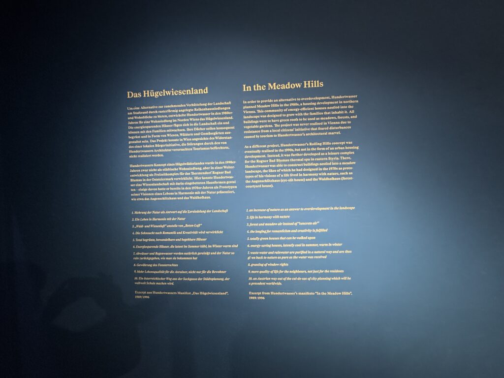 В качестве альтернативы чрезмерной застройке Хундертвассер в 1980-х годах спланировал жилой комплекс «Луговые холмы» в северной Вене. Этот поселок из энергоэффективных домов, органично вписанных в ландшафт, был спроектирован таким образом, чтобы расти вместе с семьями, которые в нем живут. Все здания должны были иметь зеленые крыши, которые можно было бы использовать как луга, леса и огороды. Проект так и не был реализован в Вене из-за сопротивления местной гражданской инициативы, которая опасалась, что туризм нарушит архитектурное чудо Хундертвассера.