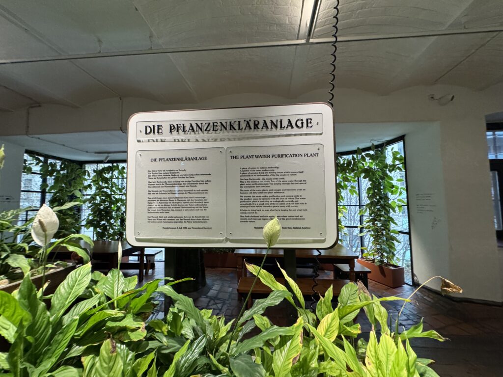 Для Хундертвассера дерево имело космологическое измерение как универсальный символ созидания, роста и жизни. Дерево играло центральную роль в его картинах. Кампании по посадке деревьев и озеленению способствовали глобальному распространению ответственности за защиту окружающей среды. Его архитектура с ее облесенными крышами и «деревьями-жителями» является выражением его экологического подхода.