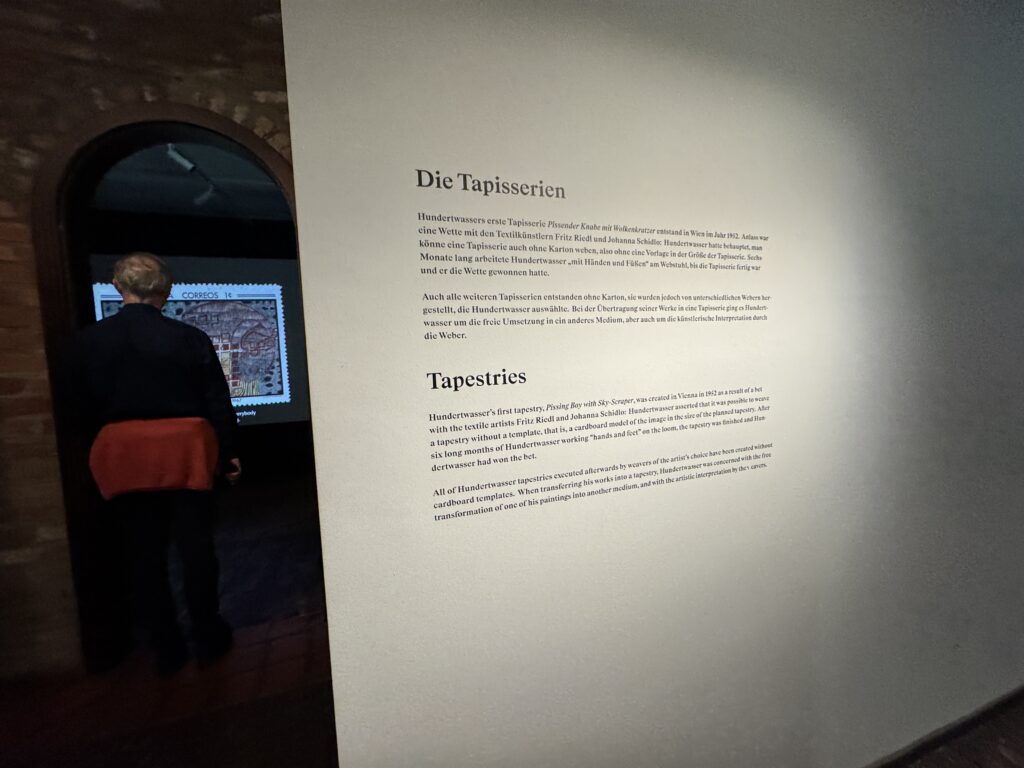 Первый гобелен Хундертвассера, «Мальчик, писающий на небоскрёбе», был создан в Вене в 1952 году в результате пари с художниками по текстилю Фрицем Ридлем и Йоханной Шидло: Хундертвассер утверждал, что гобелен можно соткать без шаблона, то есть картонной модели изображения в размере запланированного гобелена. После шести долгих месяцев работы Хундертвассера «руками и ногами на ткацком станке» гобелен был закончен, и Хундертвассер выиграл пари.