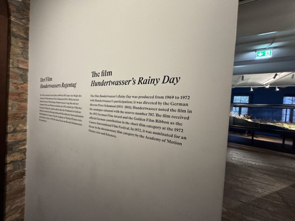 Фильм «Дождливый день Хундертвассера» был создан в период с 1969 по 1972 год при участии самого Хундертвассера; режиссёром выступил немецкий режиссёр Петер Шамони (1934–2011). Хундертвассер отметил фильм в своём каталоге-резоне под номером 707. Фильм получил Немецкую кинопремию 1972 года и «Золотую киноленту» как официальный немецкий вклад в категорию короткометражных фильмов на Каннском международном кинофестивале 1972 года. В 1972 году он был номинирован на премию «Оскар» в категории документальных фильмов Академией кинематографических искусств и наук.»