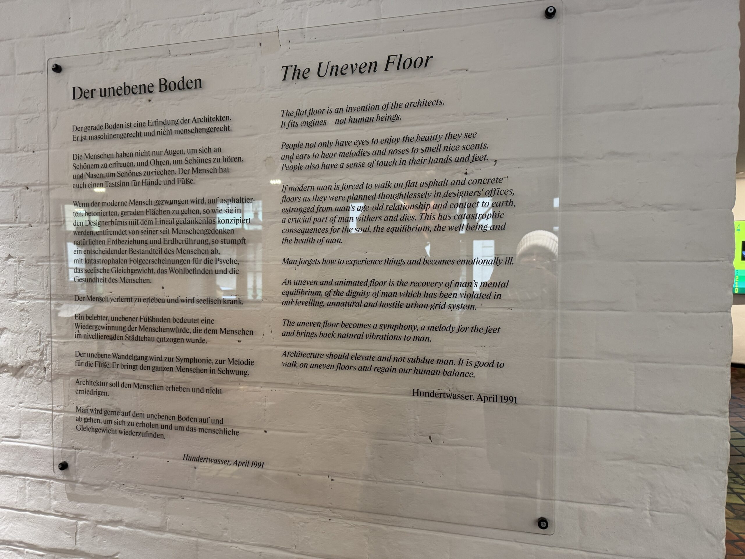 Неровный, шероховатый пол символизирует восстановление человеческого достоинства, которое было украдено у людей в результате выравнивания городской застройки.