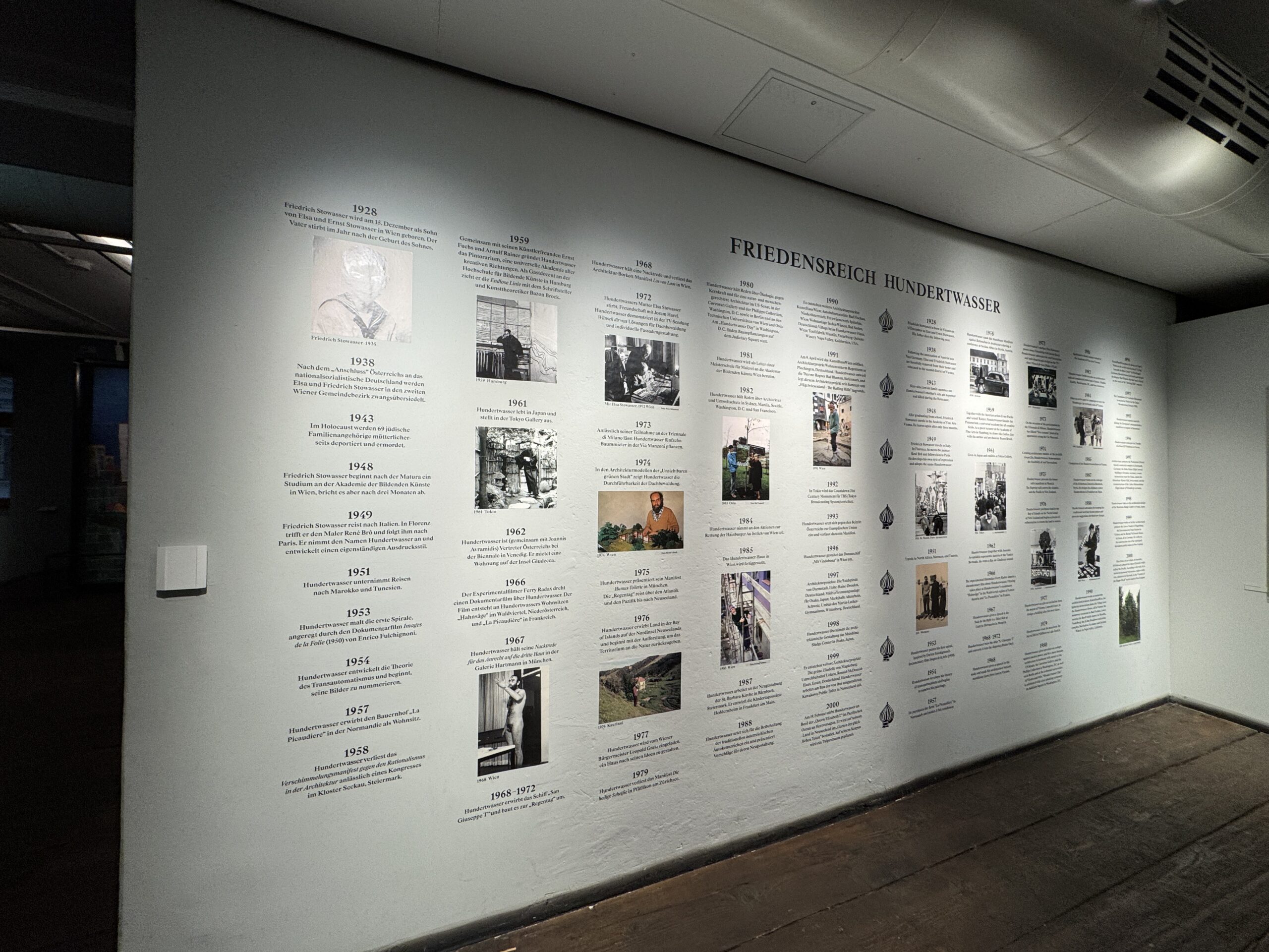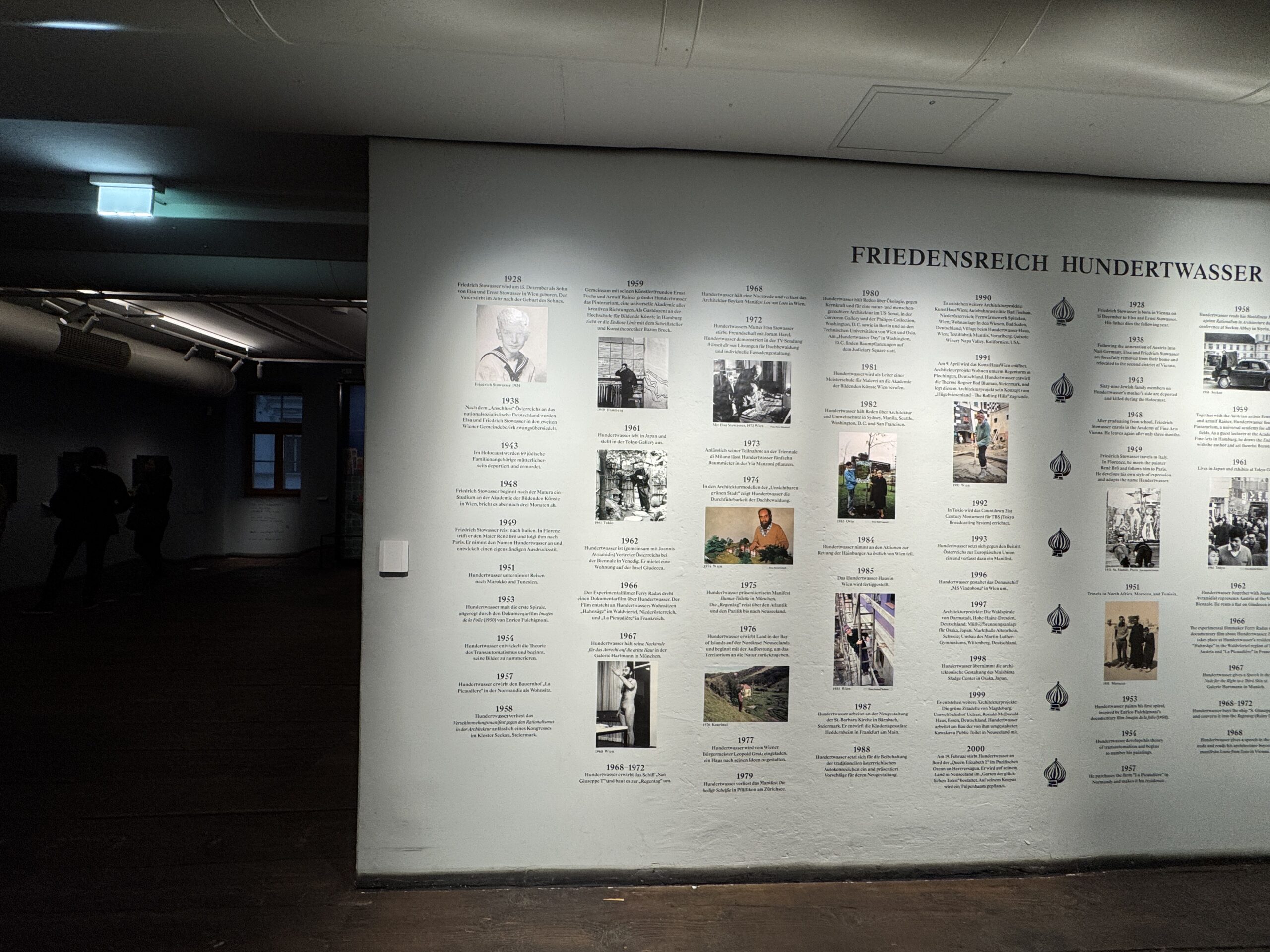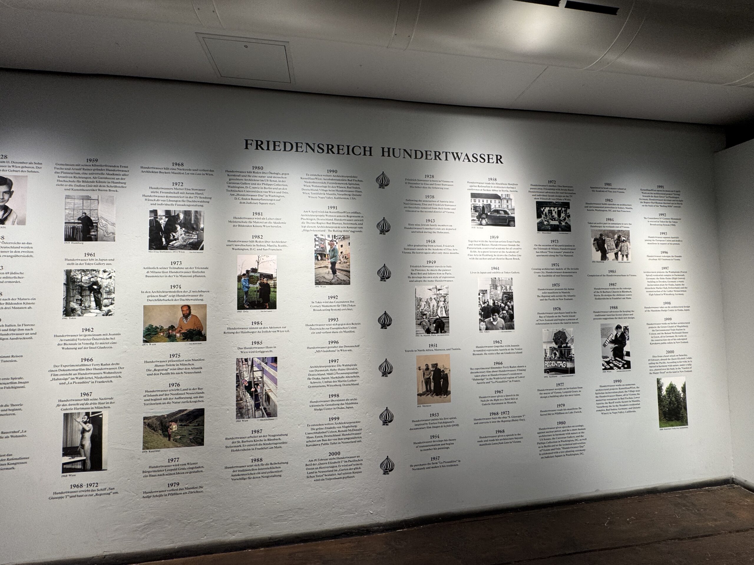 1975 год. Выставка в Доме искусства, Мюнхен. Манифест «Гумус-туалет» в Мюнхене. Разработка почтовой марки для Австрии: «Спиральное дерево». Запуск серии «Современное искусство в Австрии». Гравёр всех почтовых марок: Вольфганг Зайдель. Начало мирового передвижного выставочного тура в Музее современного искусства города Парижа, продолжавшегося до 1983 года в 27 странах и 43 музеях. В Альбертине, Вена, начало мирового передвижного выставочного тура его полного графического творчества. Он продолжался до 1992 года в 15 странах и более чем 80 музеях и галереях. Путешествие на корабле «Регентаг» через Атлантику в Карибский бассейн, через Панамский канал в Тихий океан.