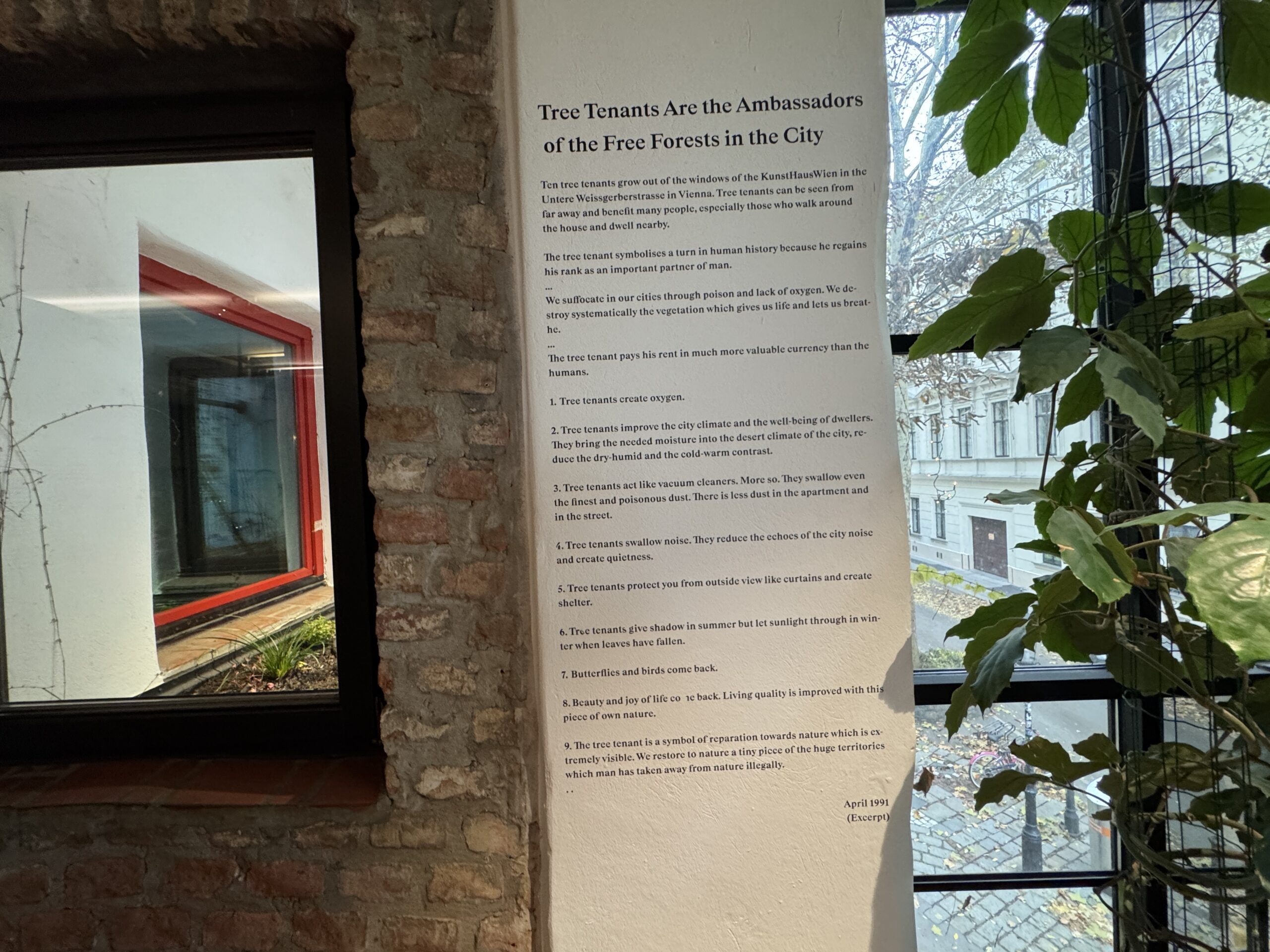 Из окон Венского художественного дома на улице Унтере Вайсгерберштрассе в Вене вырастают десять деревьев-жильцов. Эти деревья видны издалека и приносят пользу многим людям, особенно тем, кто гуляет вокруг дома и живет поблизости.