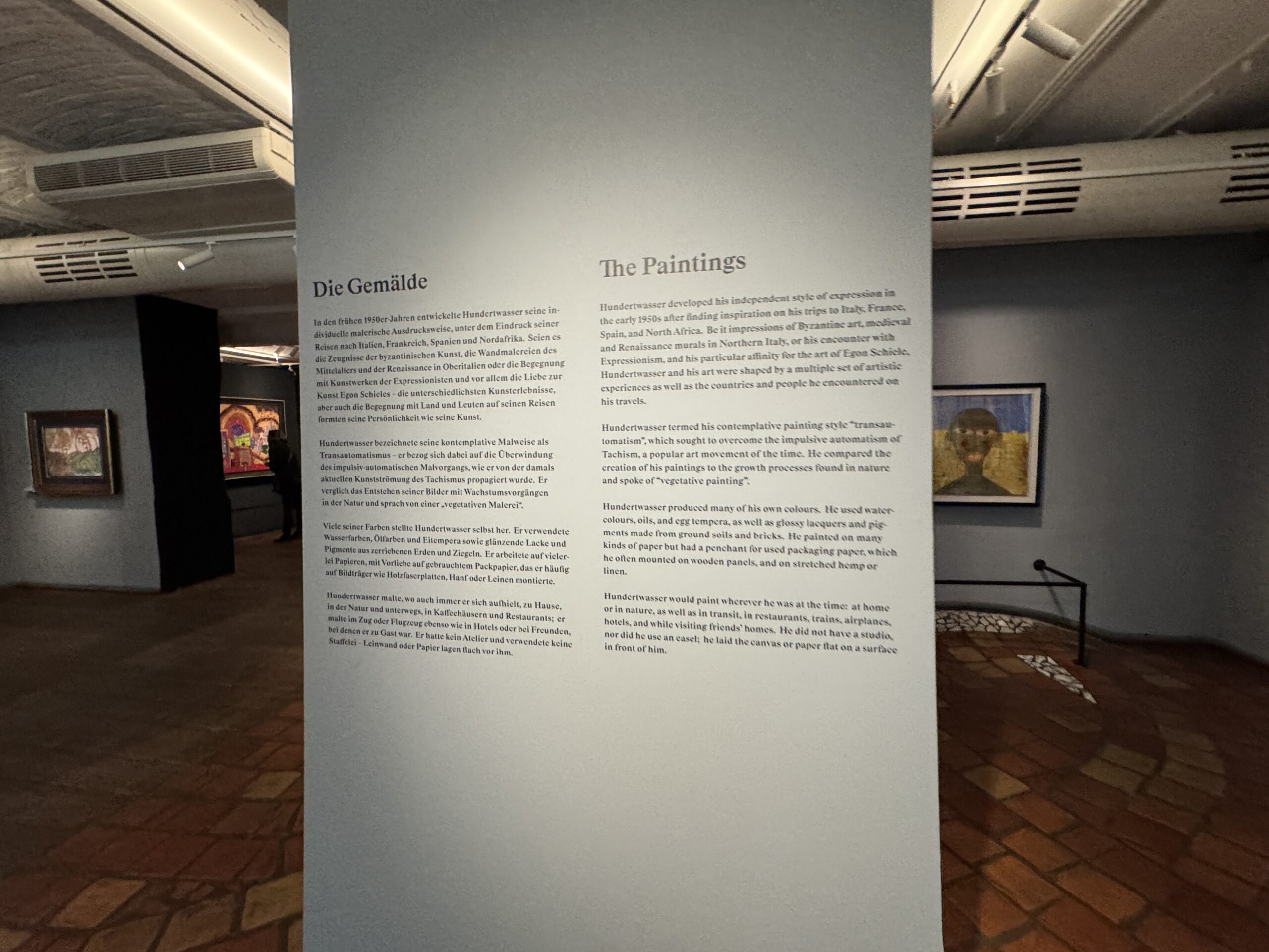 Хундертвассер выработал свой независимый стиль в начале 1950-х годов, вдохновившись поездками в Италию, Францию, Испанию и Северную Африку. Будь то впечатления от византийского искусства, средневековых и ренессансных фресок в Северной Италии, знакомство с экспрессионизмом или особая любовь к творчеству Эгона Шиле, Хундертвассер и его искусство формировались под влиянием множества художественных переживаний, а также стран и людей, с которыми он встречался в своих путешествиях.