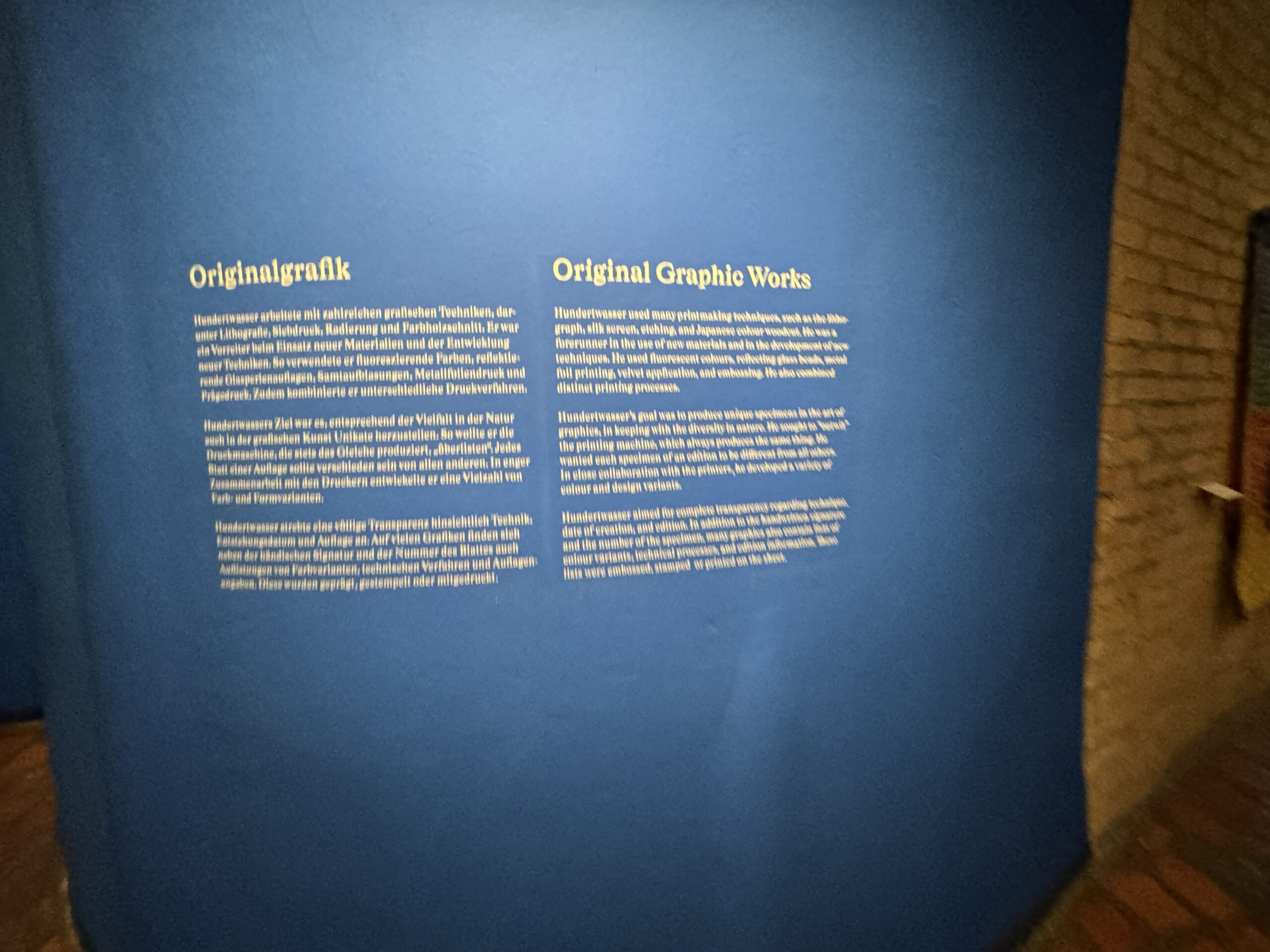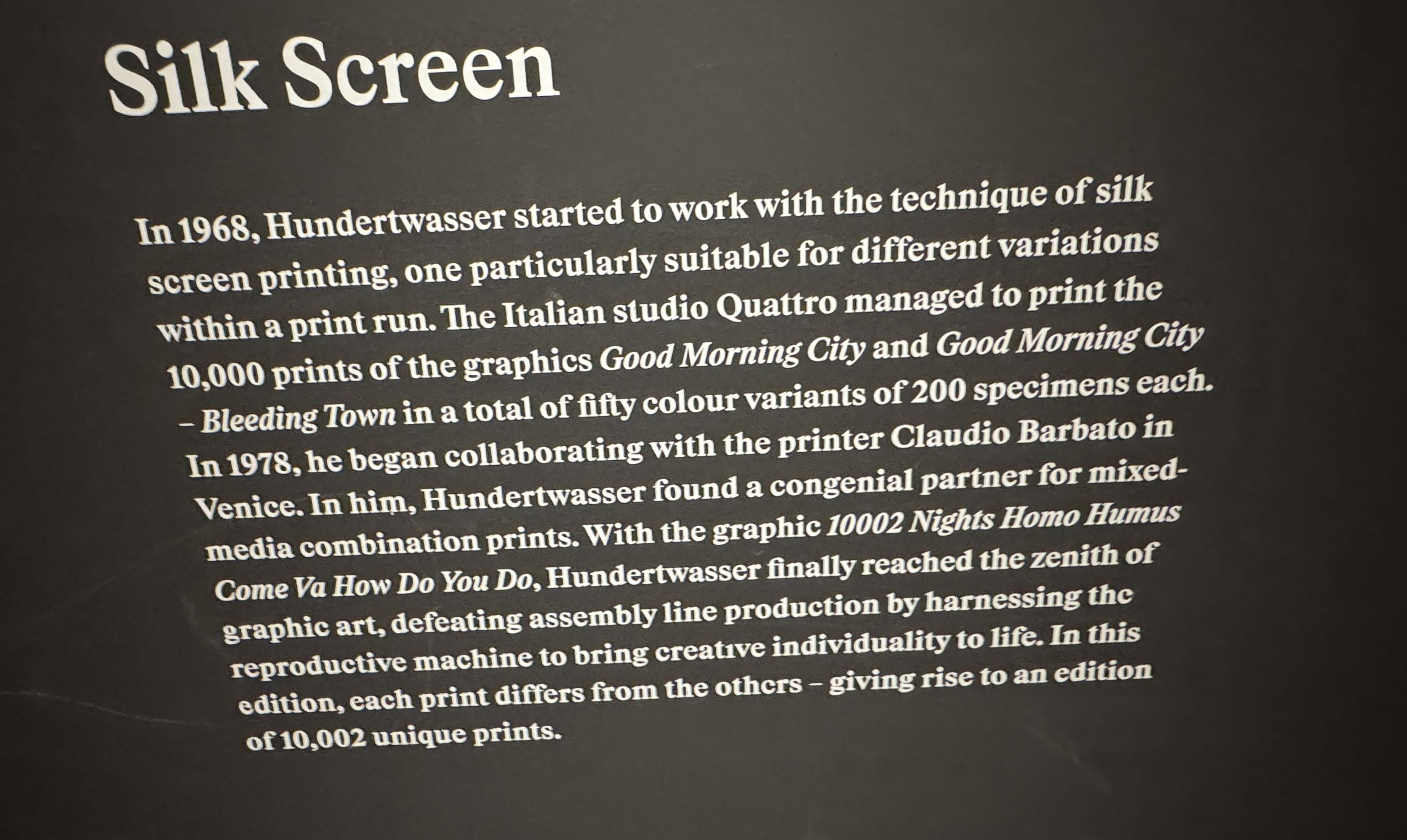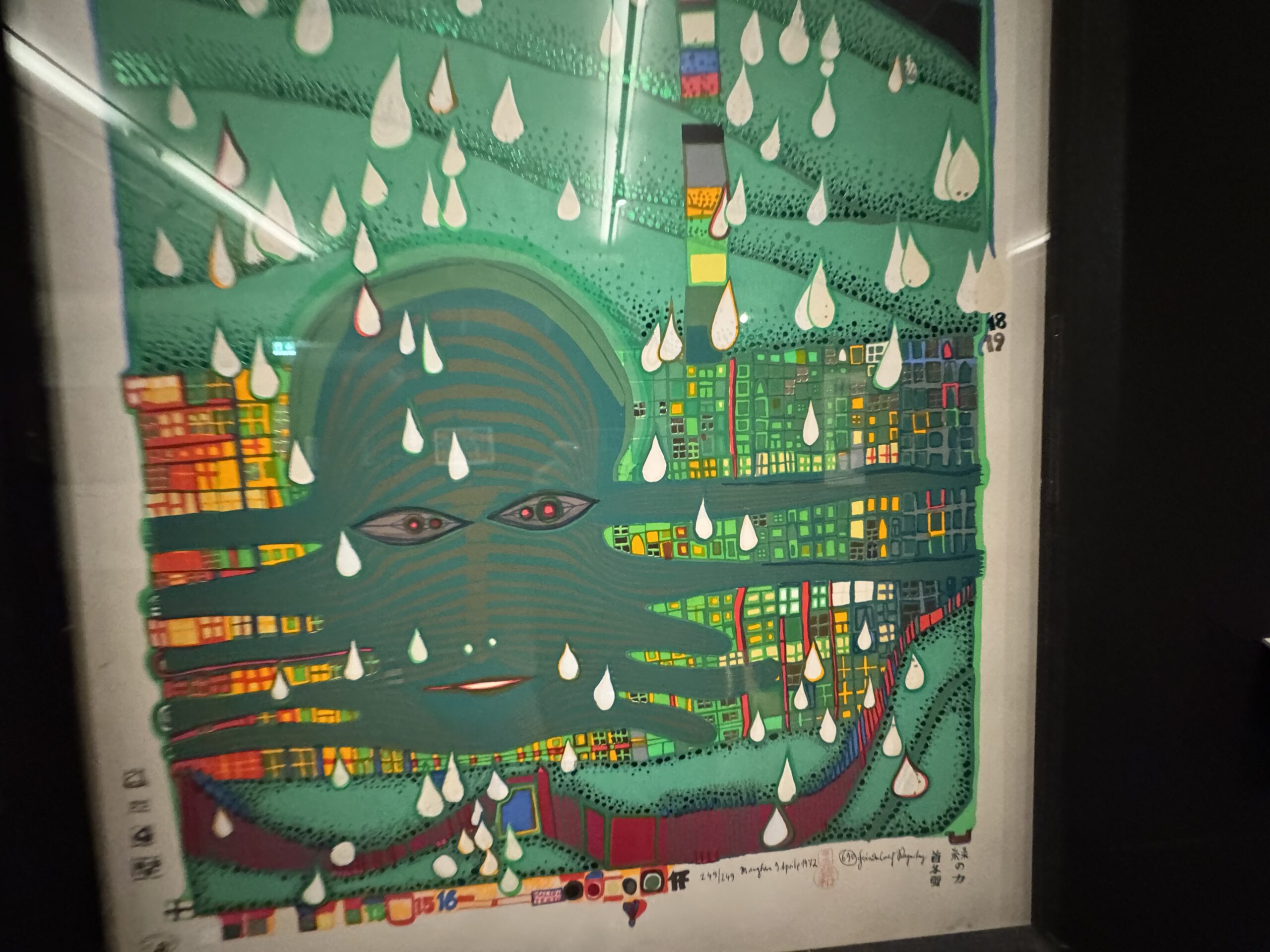 Хундертвассер стремился к полной прозрачности в отношении даты создания и тиража. Помимо почерка и номера экземпляра, на листе тиснями или отпечатками были указаны многочисленные графические цветовые варианты, технологии печати и такие особенности, как Мого Хата.»