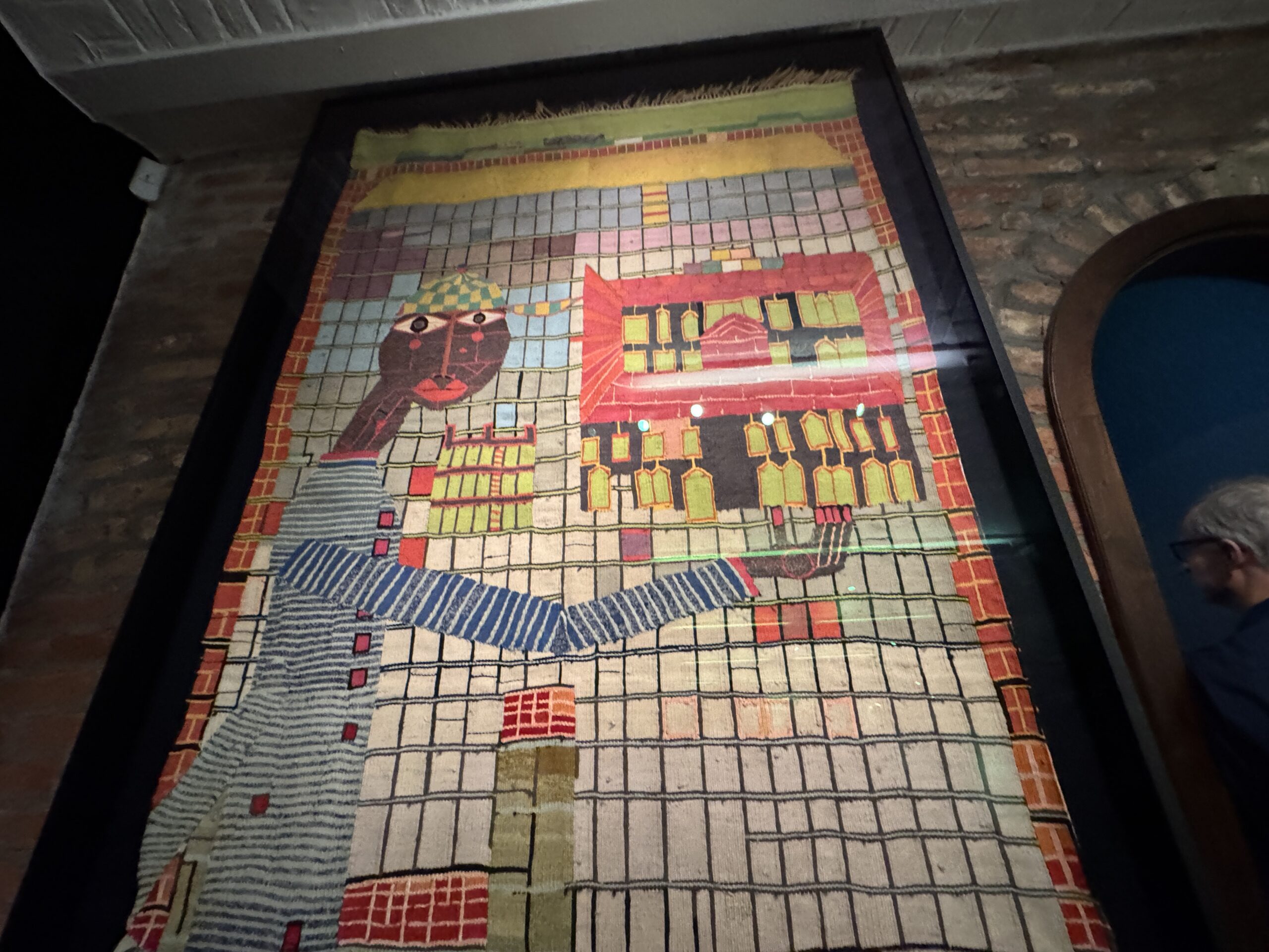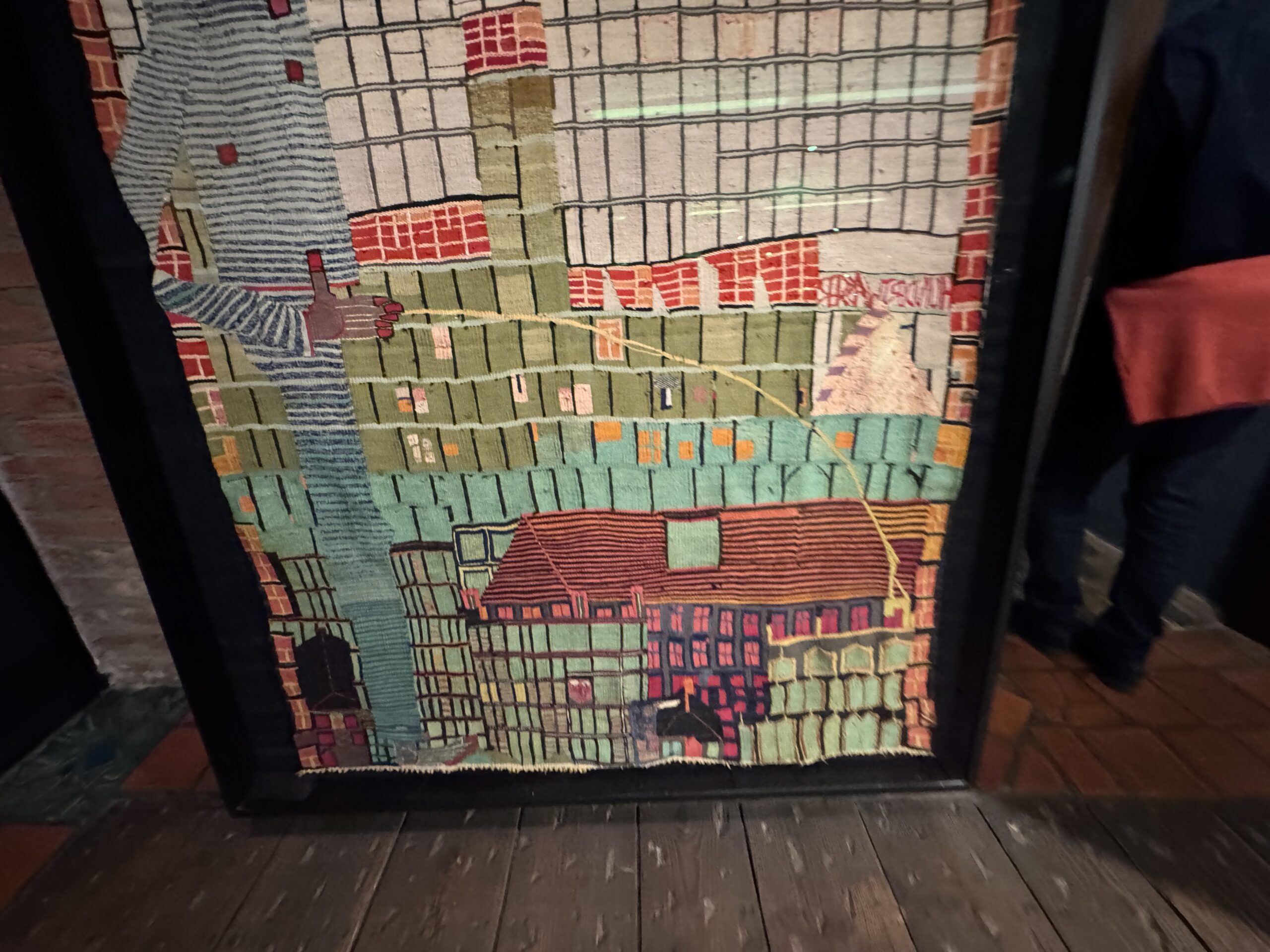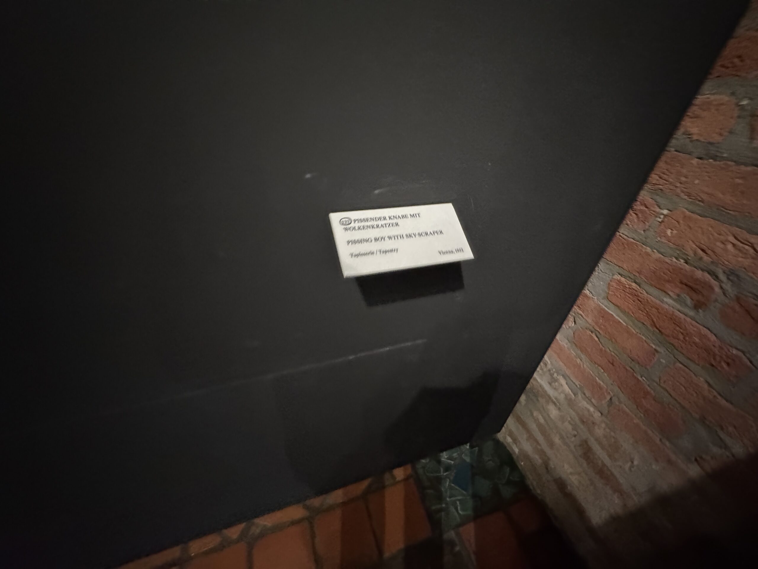 Первый гобелен Хундертвассера, «Мальчик, писающий на небоскрёбе», был создан в Вене в 1952 году в результате пари с художниками по текстилю Фрицем Ридлем и Йоханной Шидло: Хундертвассер утверждал, что гобелен можно соткать без шаблона, то есть картонной модели изображения в размере запланированного гобелена. После шести долгих месяцев работы Хундертвассера «руками и ногами на ткацком станке» гобелен был закончен, и Хундертвассер выиграл пари.