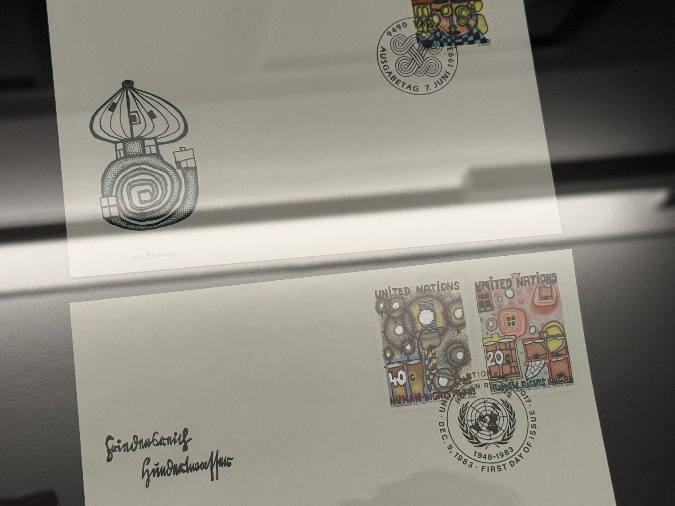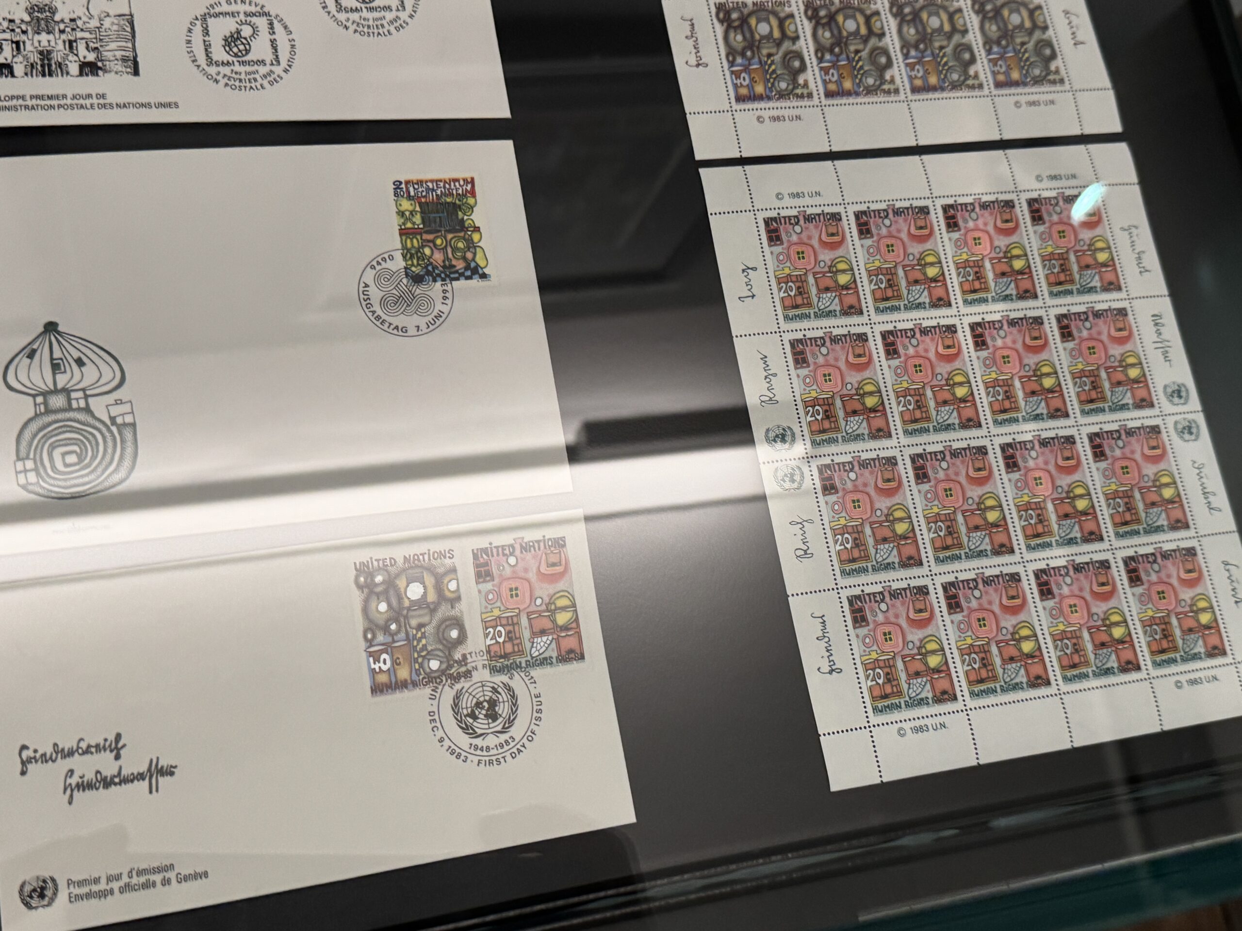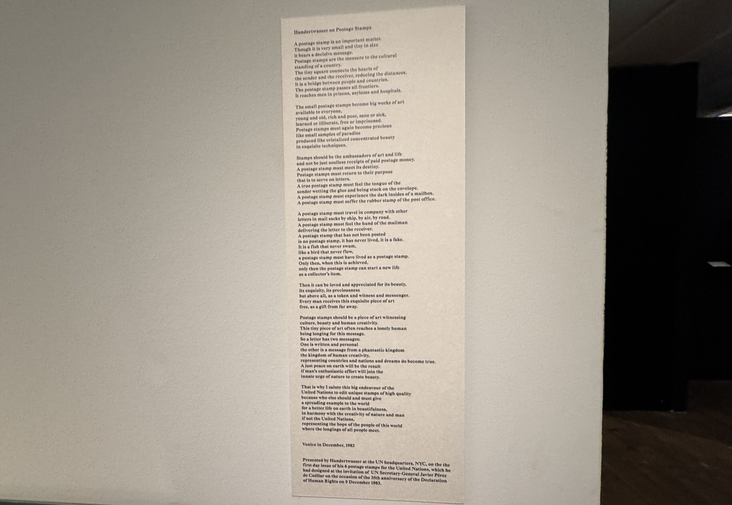 Эта почтовая марка была вручена Хундертвассером в штаб-квартире ООН в Нью-Йорке в первый день выпуска его шести почтовых марок, посвященных Организации Объединенных Наций, которые он разработал по приглашению Генерального секретаря ООН Хавьера Переса де Куэльяра по случаю 35-й годовщины Декларации прав человека 9 декабря 1983 года.»