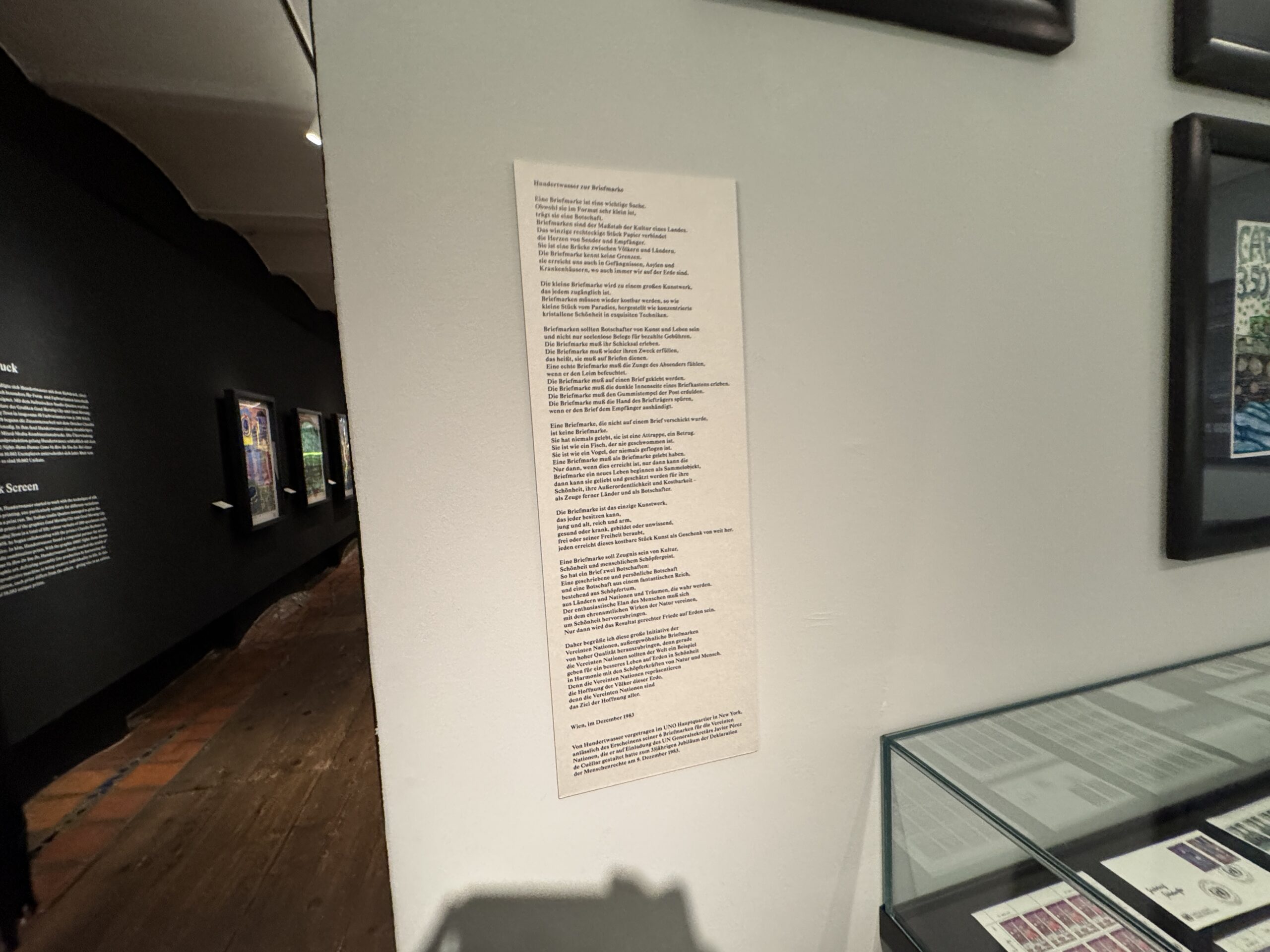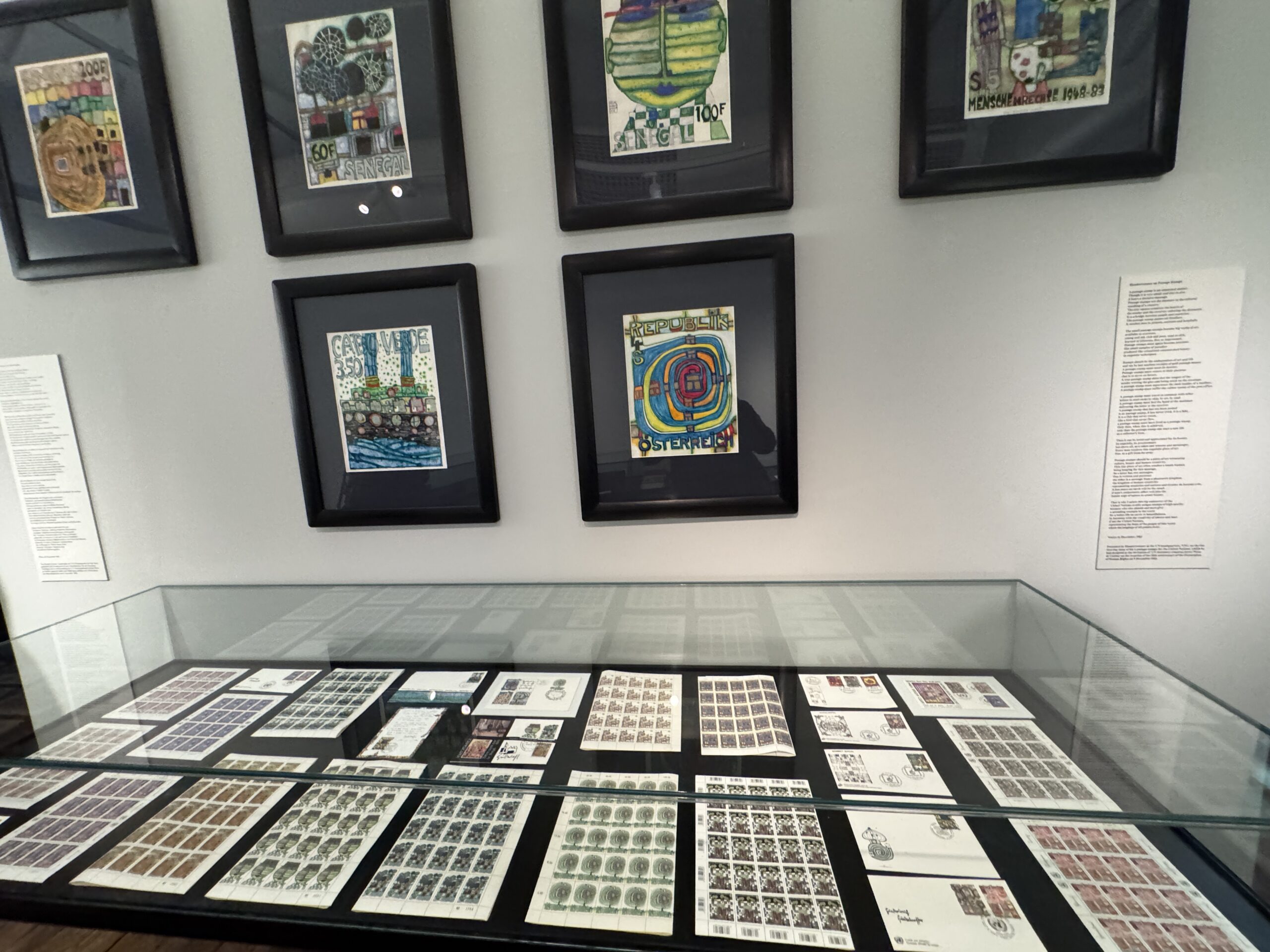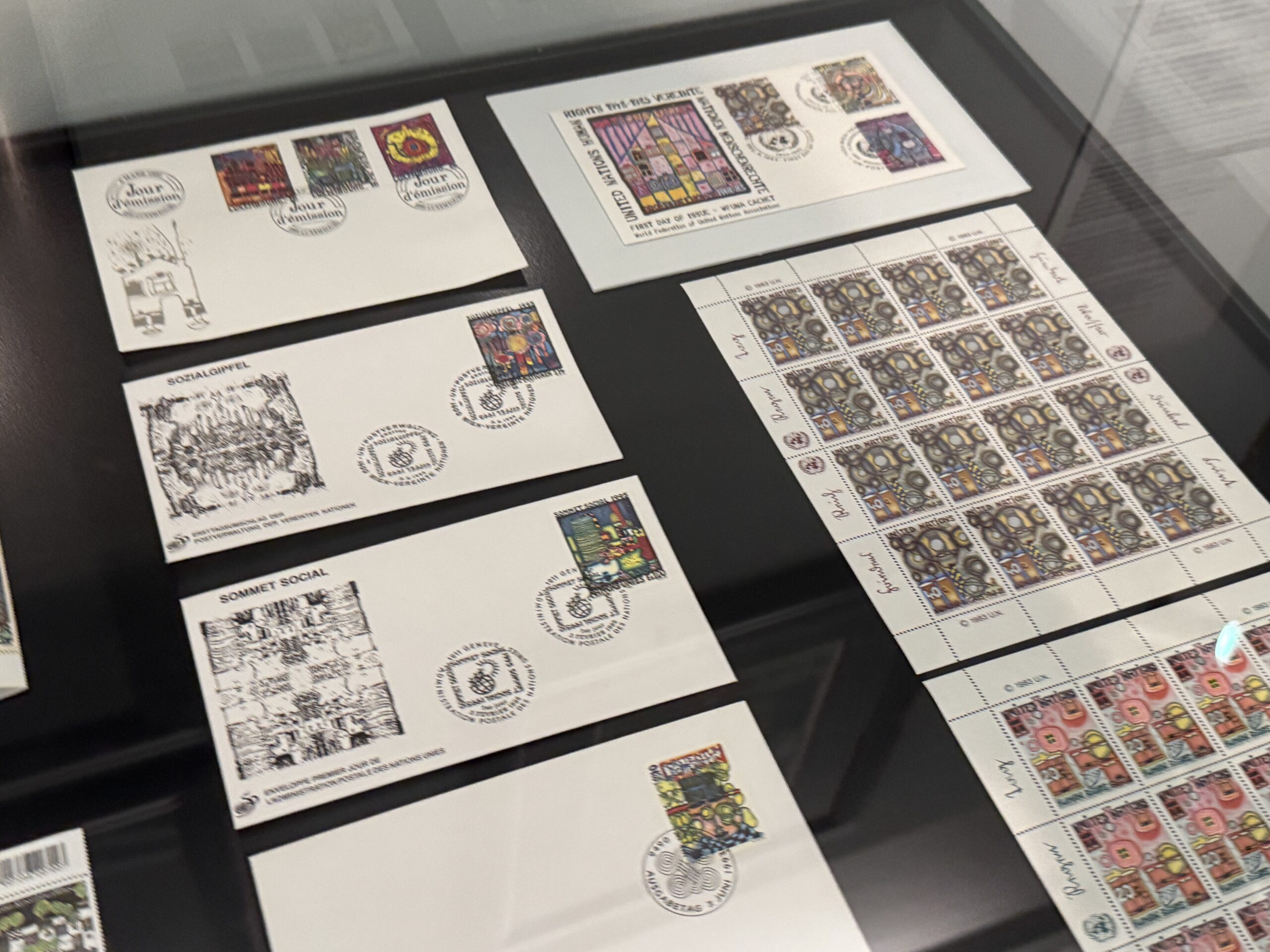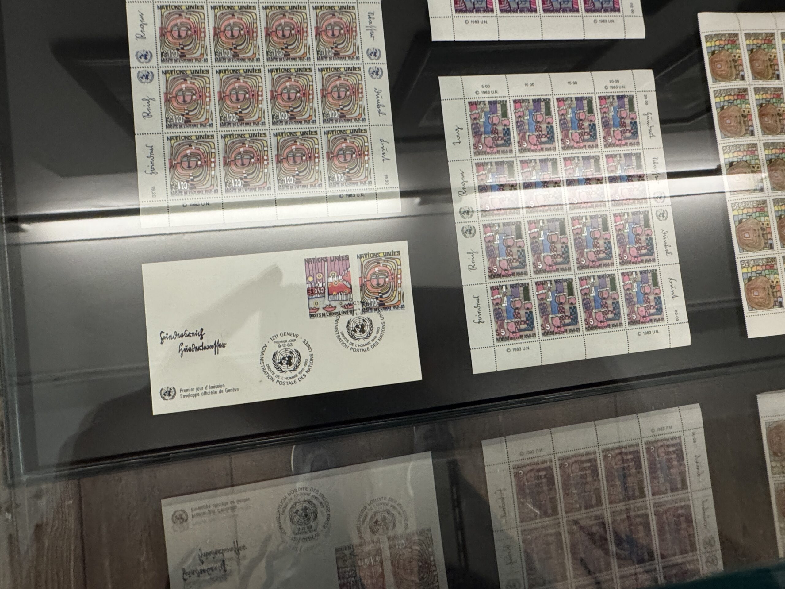 Эта почтовая марка была вручена Хундертвассером в штаб-квартире ООН в Нью-Йорке в первый день выпуска его шести почтовых марок, посвященных Организации Объединенных Наций, которые он разработал по приглашению Генерального секретаря ООН Хавьера Переса де Куэльяра по случаю 35-й годовщины Декларации прав человека 9 декабря 1983 года.»