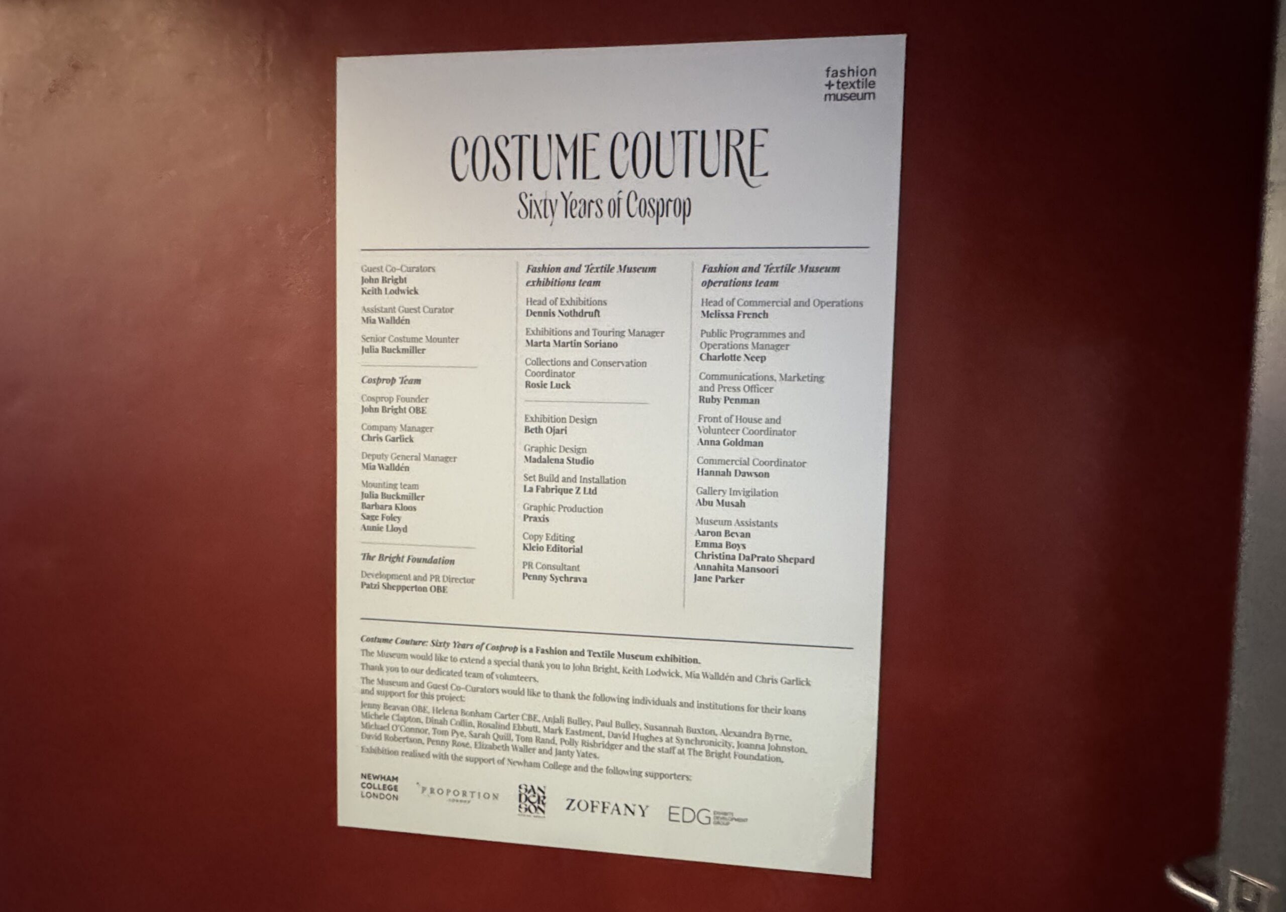 С 26 сентября 2025 по 8 марта 2026 года в небольшом лондонском Fasion+textil museum проходила выставка «Costume Couture: Sixty Years of Cosprop», ретроспектива 60-летней работы Cosprop, ведущей лондонской компании, изготавливающей костюмы. Для обладателей карточки Art Fund билет на выставку продавался за полцены.