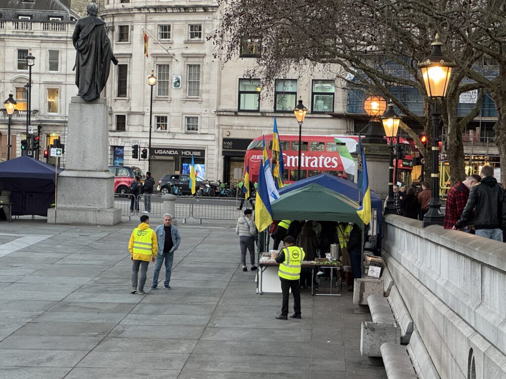 На Трафальгарській площі було встановлено сцену та огородження, і можна було побачити дуже багато – десятки, якщо не сотні – українських прапорів. Також український прапор був поряд на посольстві Канади праворуч від площі (від Національного музею).