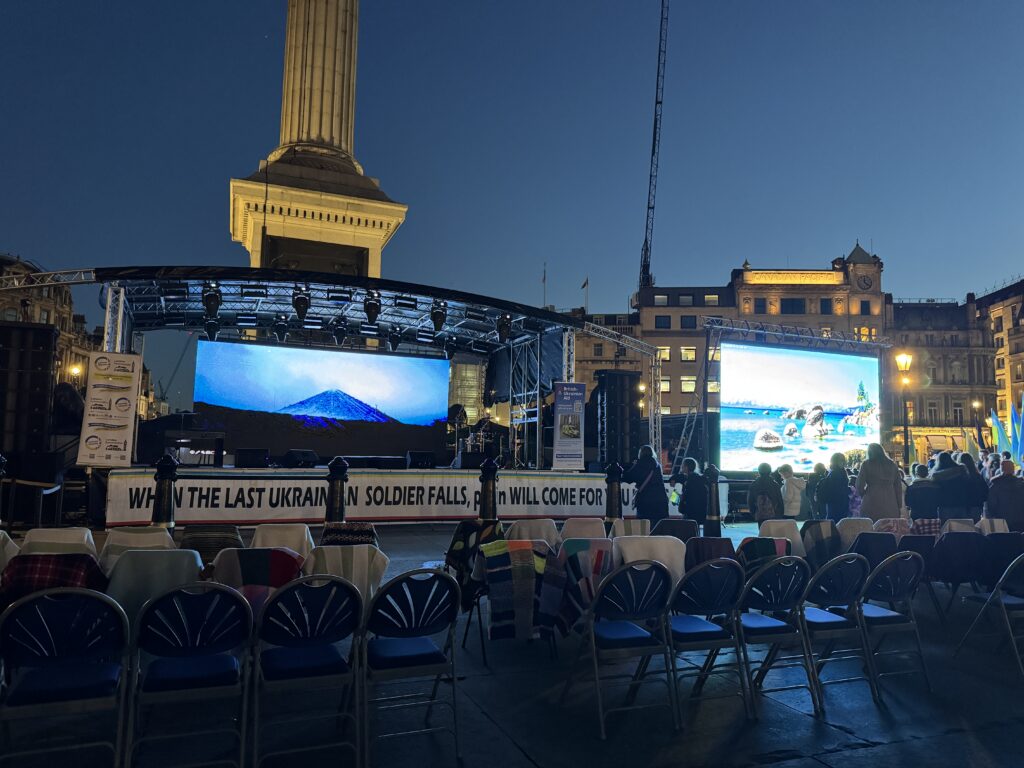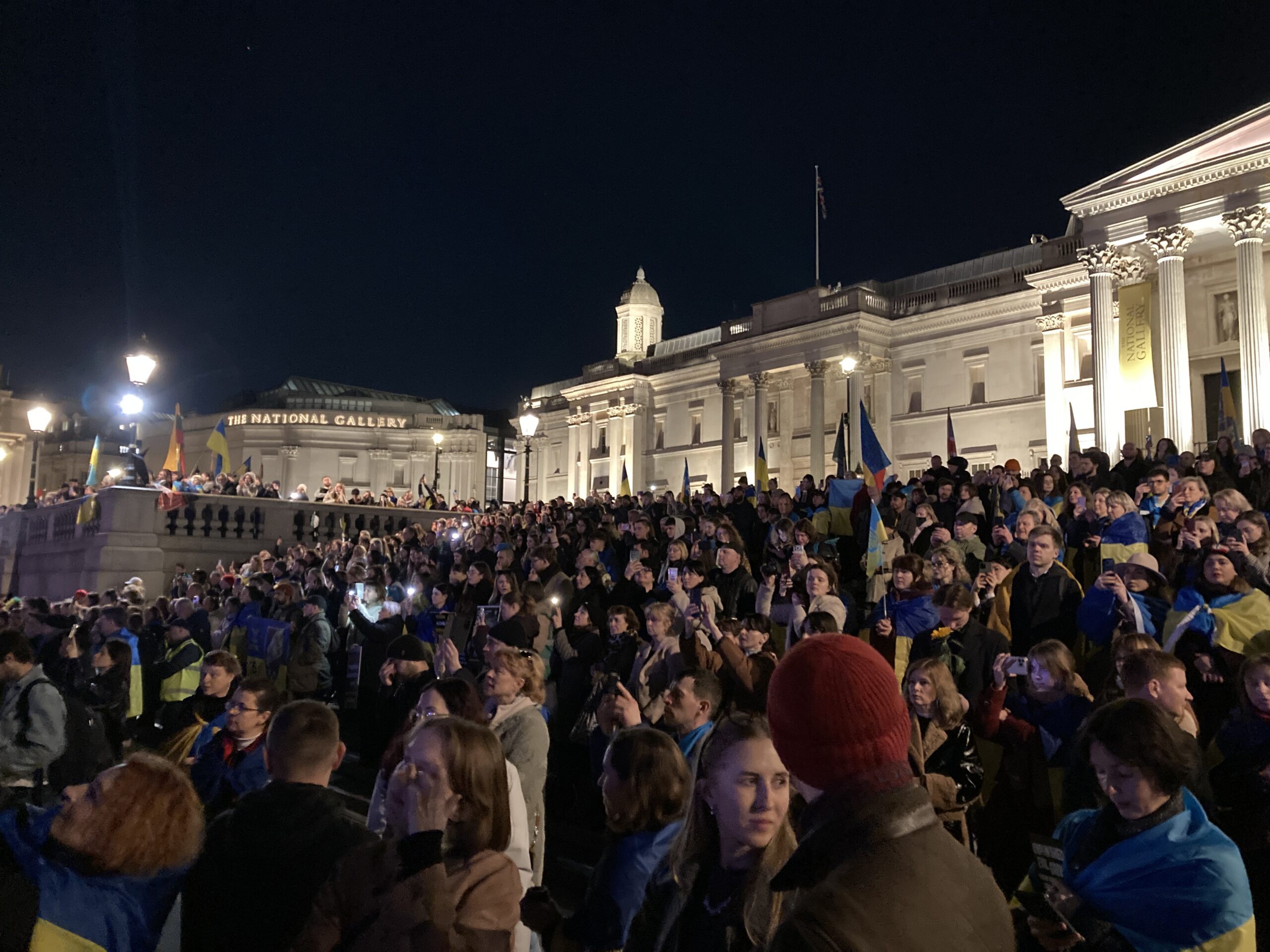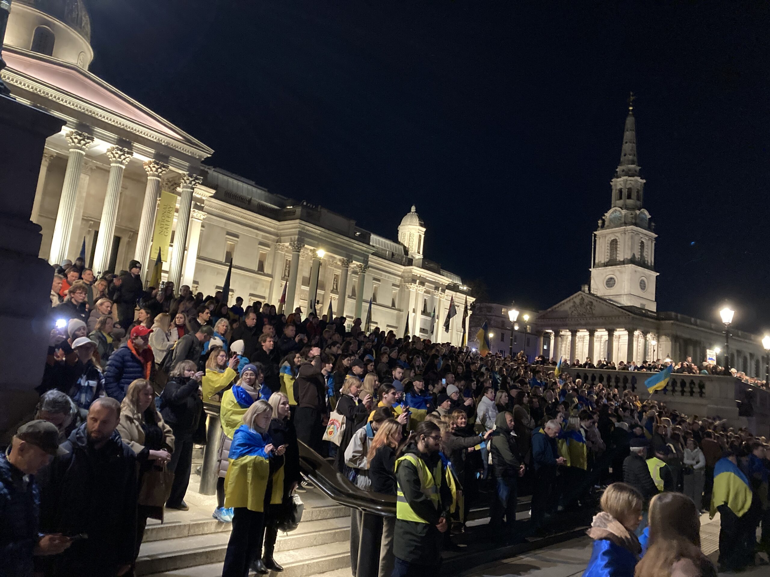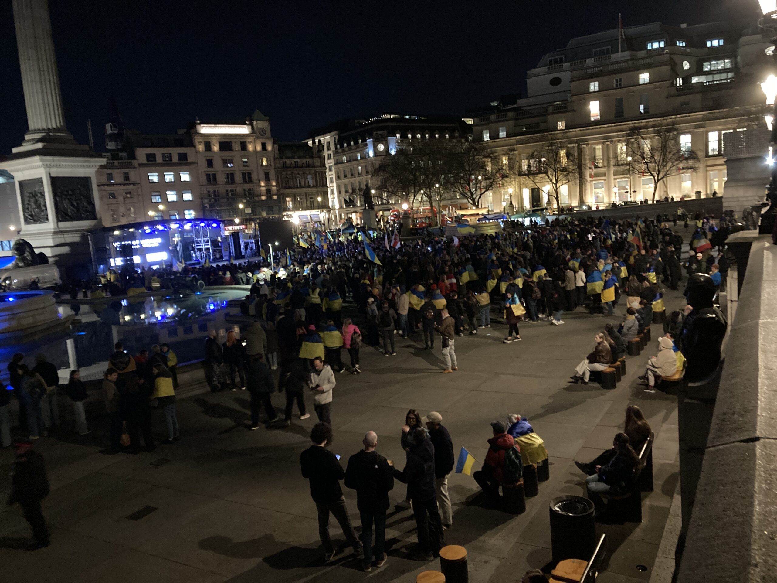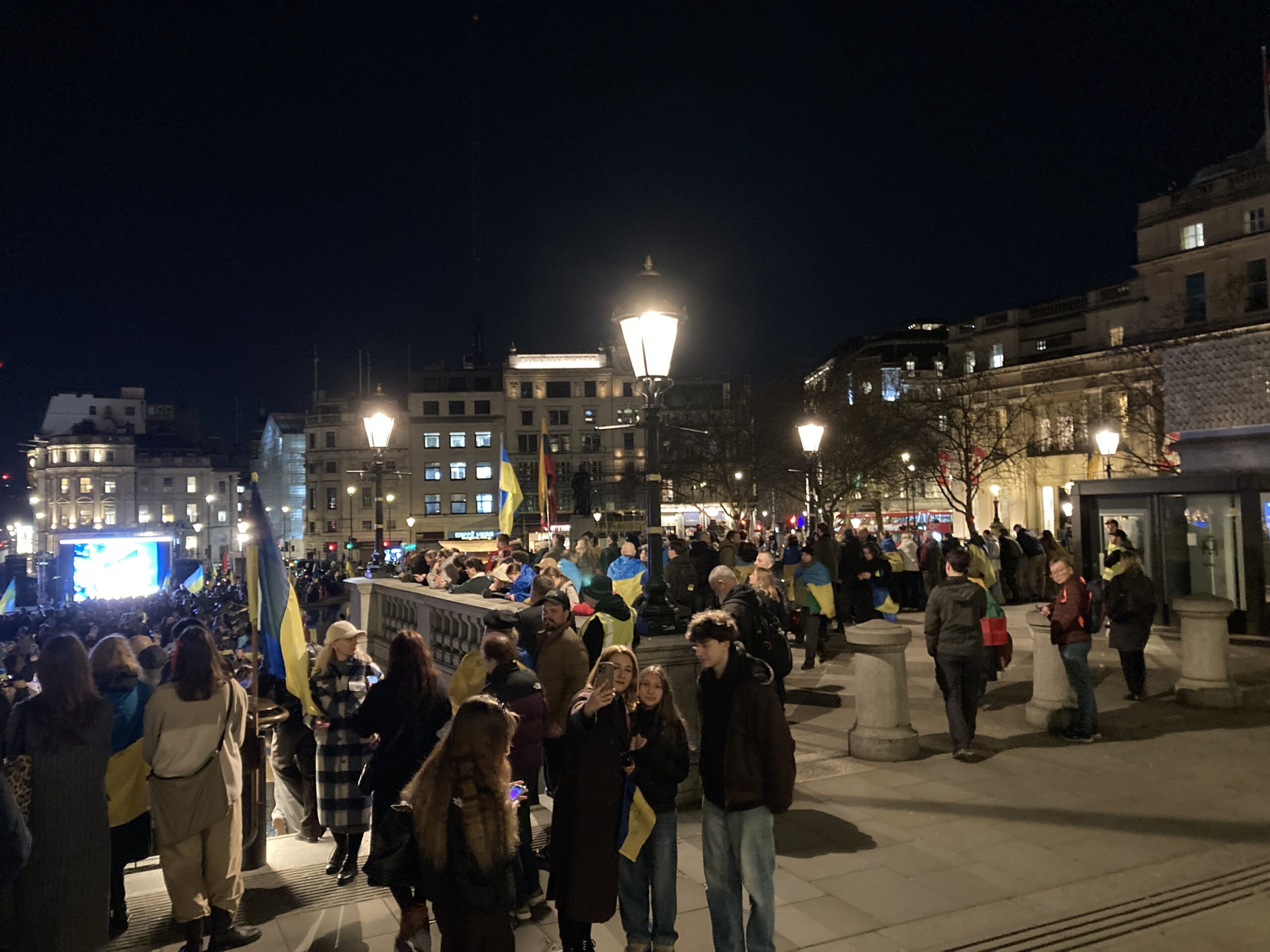 На Трафальгарській площі було встановлено сцену та огородження, і можна було побачити дуже багато – десятки, якщо не сотні – українських прапорів. Також український прапор був поряд на посольстві Канади праворуч від площі (від Національного музею). Люди, які прийшли на акцію, могли дивитися з сходів музею або зайти за огорожу з сек’юріті. Якщо чесно, я зовсім не зрозуміла цю огорожу – охорона нічого не перевіряла. Усіх, хто прийшов до 18 години, а я була серед таких, хто прийшов за годину до початку, пропустили без огляду. Праворуч від сцени були намети організаторів — я не змогла до них сходити, тому що в цьому випадку втратила б своє місце для зйомки біля сцени. Усередині огорожі були стільці для почесних гостей та учасників заходу. Там ходили журналісти та блогери, періодично вони зупинялися навпроти мого телефону та закривали зйомку.