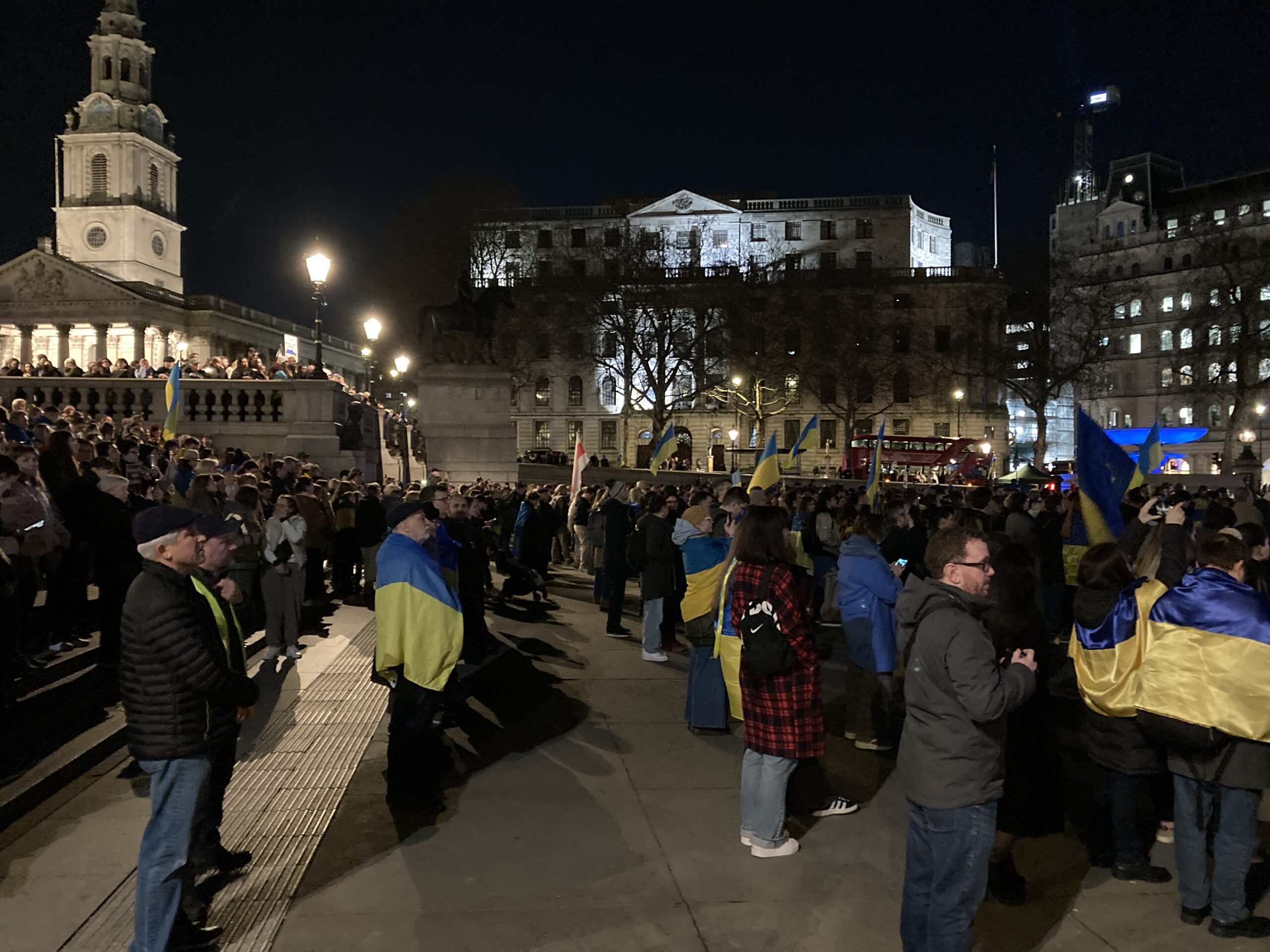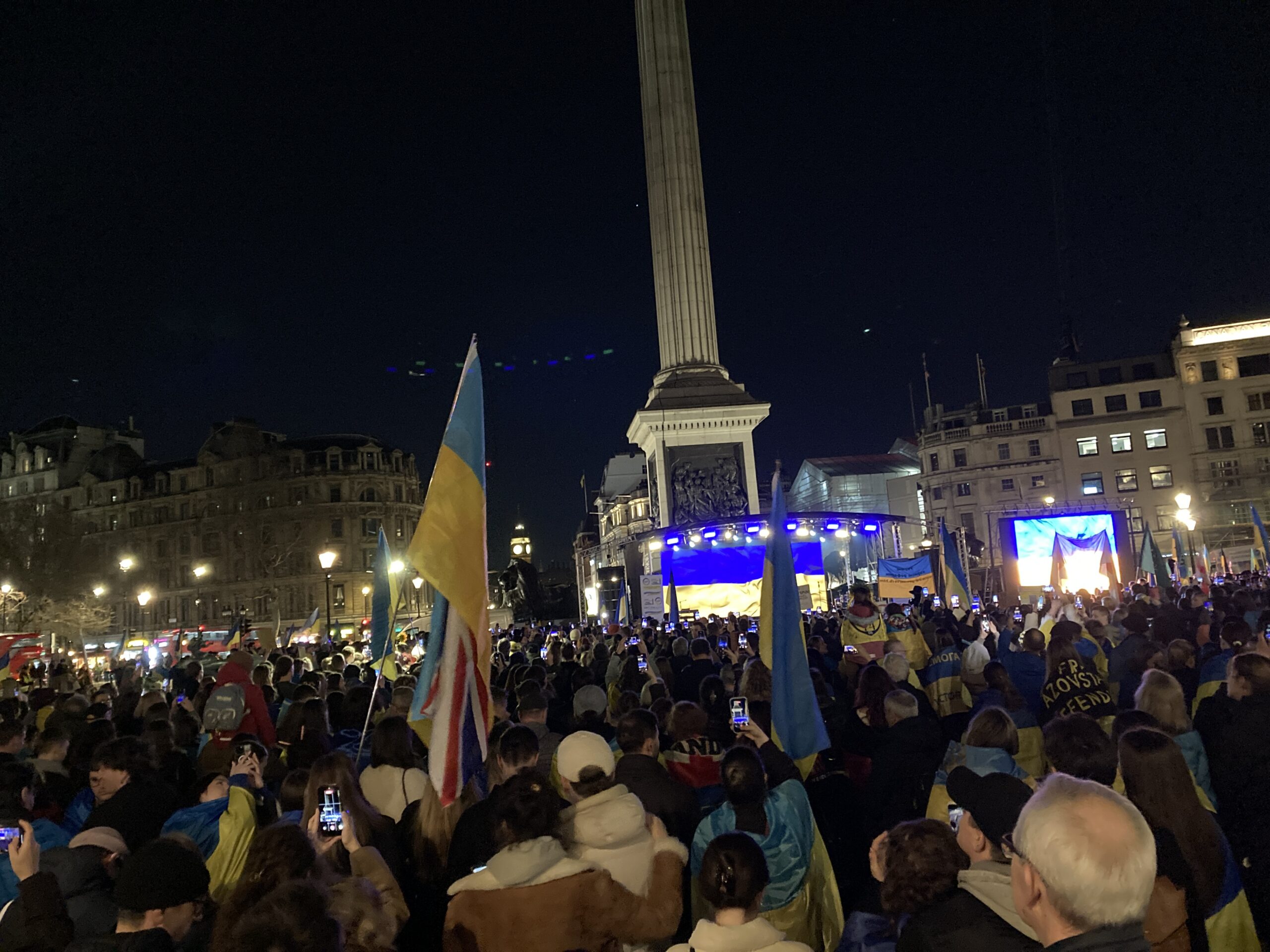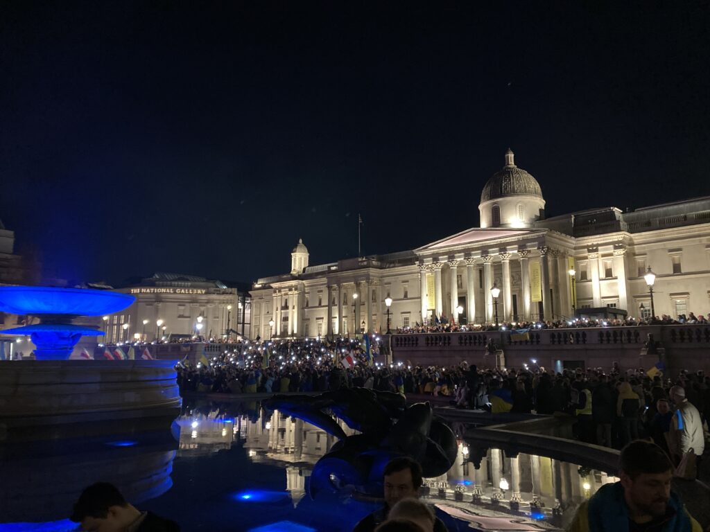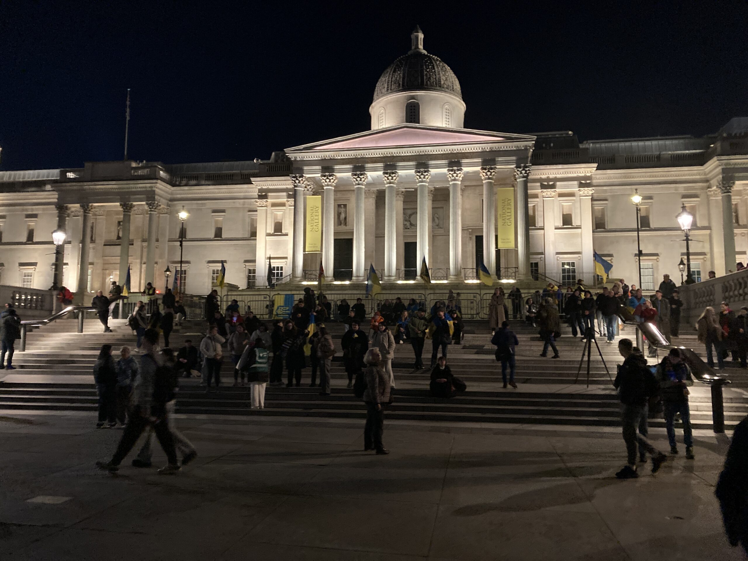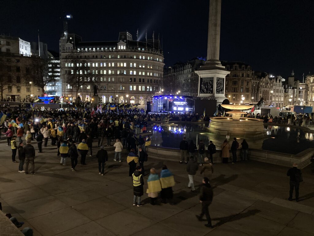 На Трафальгарській площі було встановлено сцену та огородження, і можна було побачити дуже багато – десятки, якщо не сотні – українських прапорів. Також український прапор був поряд на посольстві Канади праворуч від площі (від Національного музею). Люди, які прийшли на акцію, могли дивитися з сходів музею або зайти за огорожу з сек’юріті. Якщо чесно, я зовсім не зрозуміла цю огорожу – охорона нічого не перевіряла. Усіх, хто прийшов до 18 години, а я була серед таких, хто прийшов за годину до початку, пропустили без огляду. Праворуч від сцени були намети організаторів — я не змогла до них сходити, тому що в цьому випадку втратила б своє місце для зйомки біля сцени. Усередині огорожі були стільці для почесних гостей та учасників заходу. Там ходили журналісти та блогери, періодично вони зупинялися навпроти мого телефону та закривали зйомку.