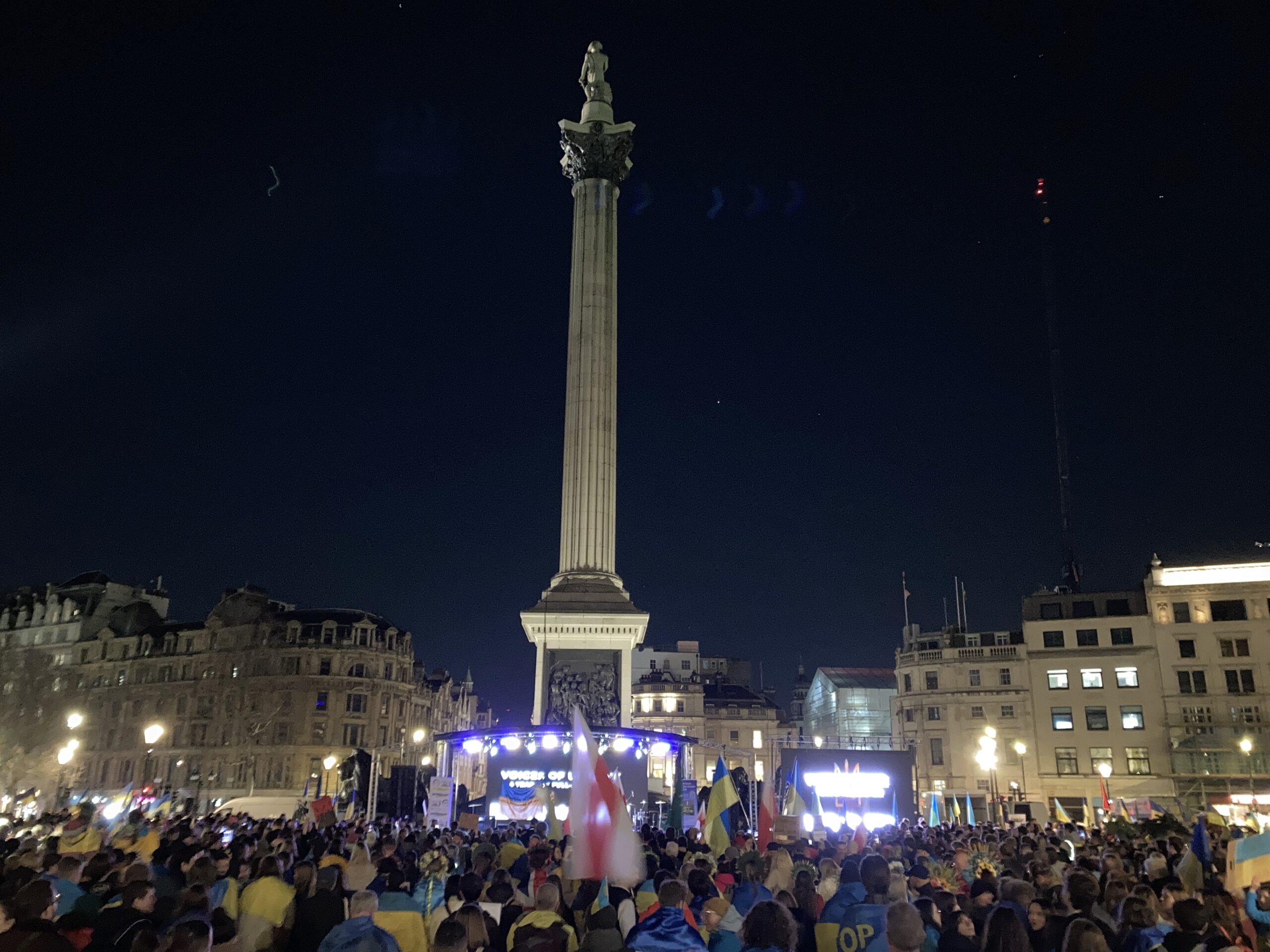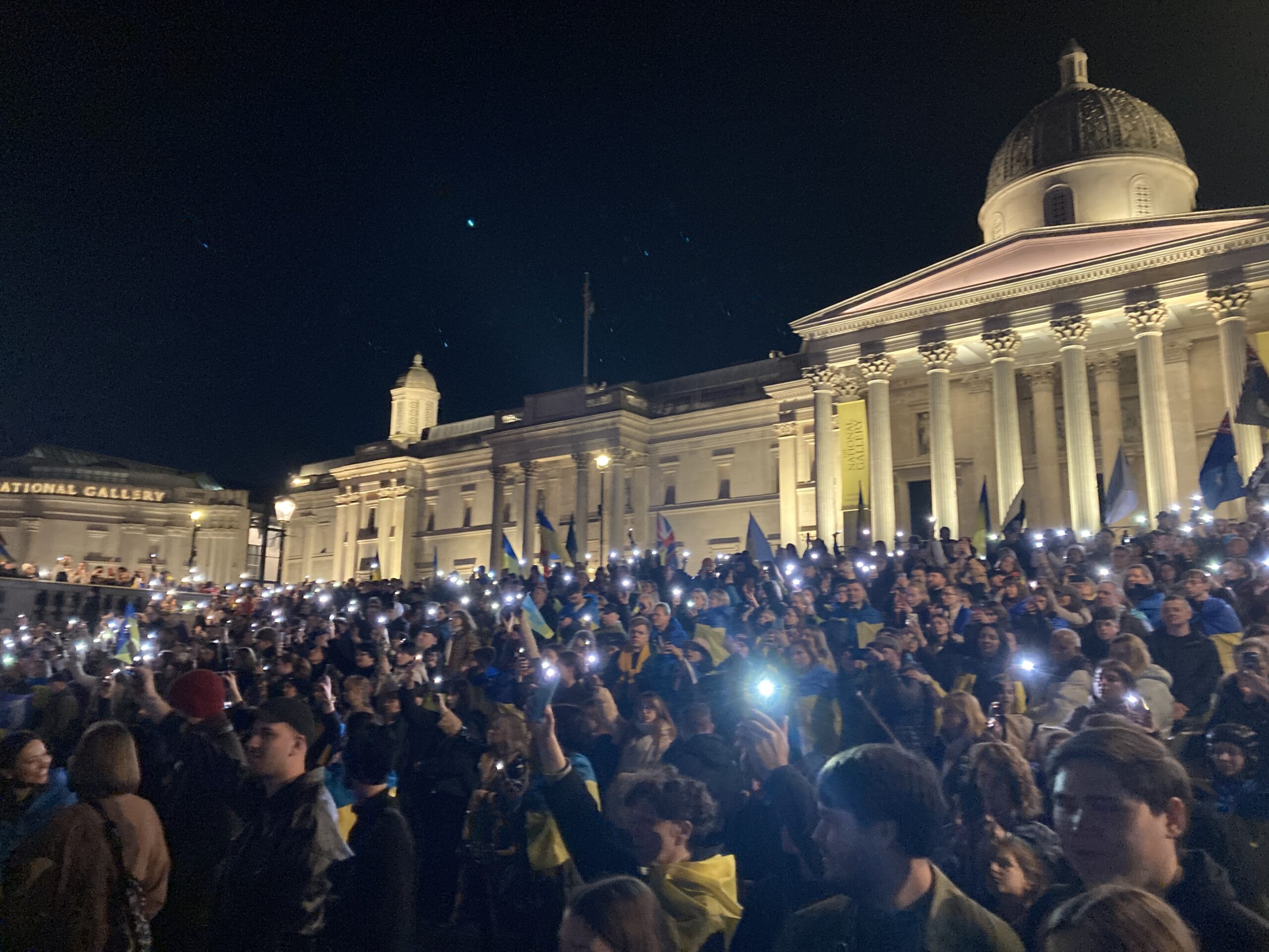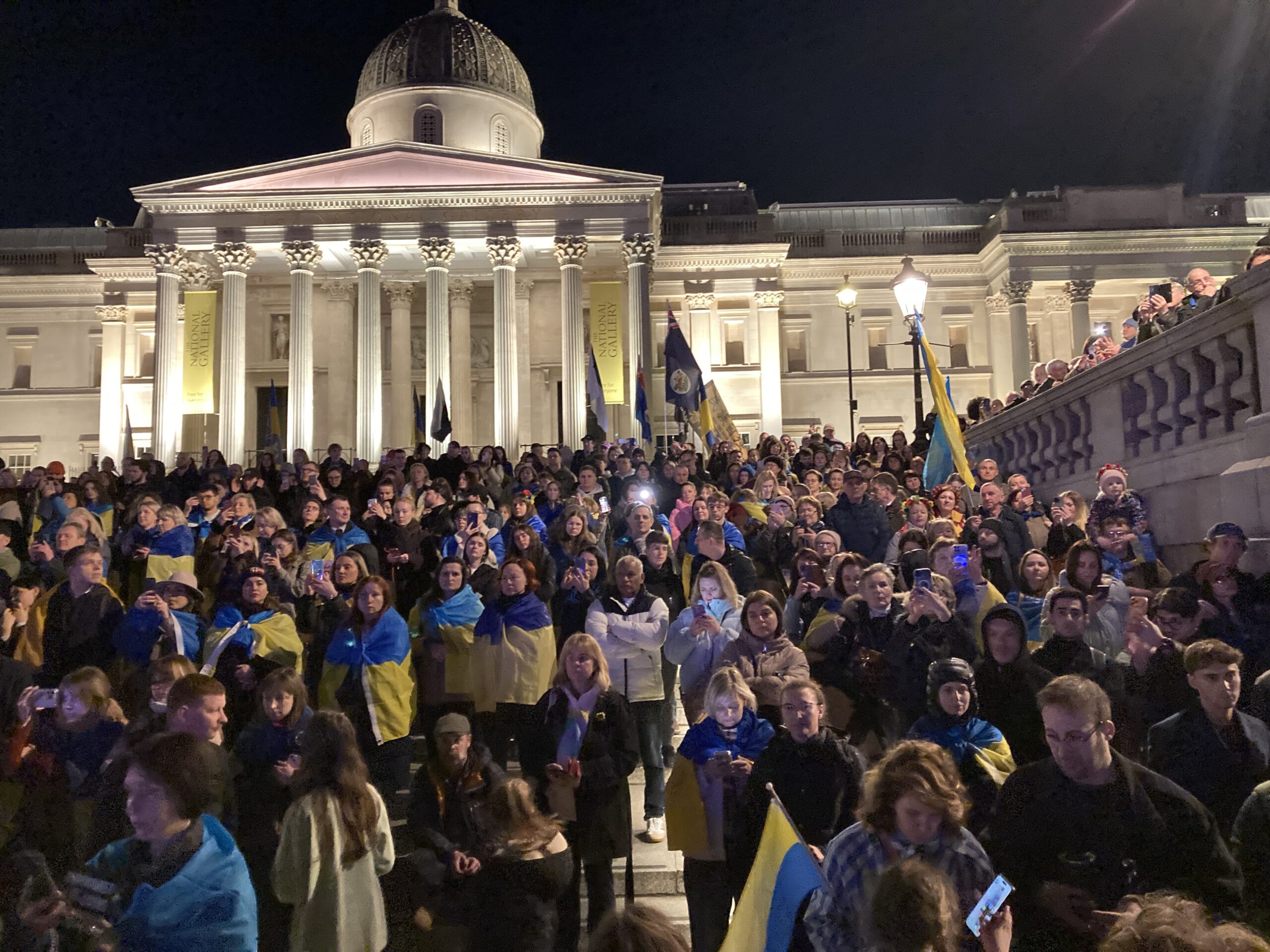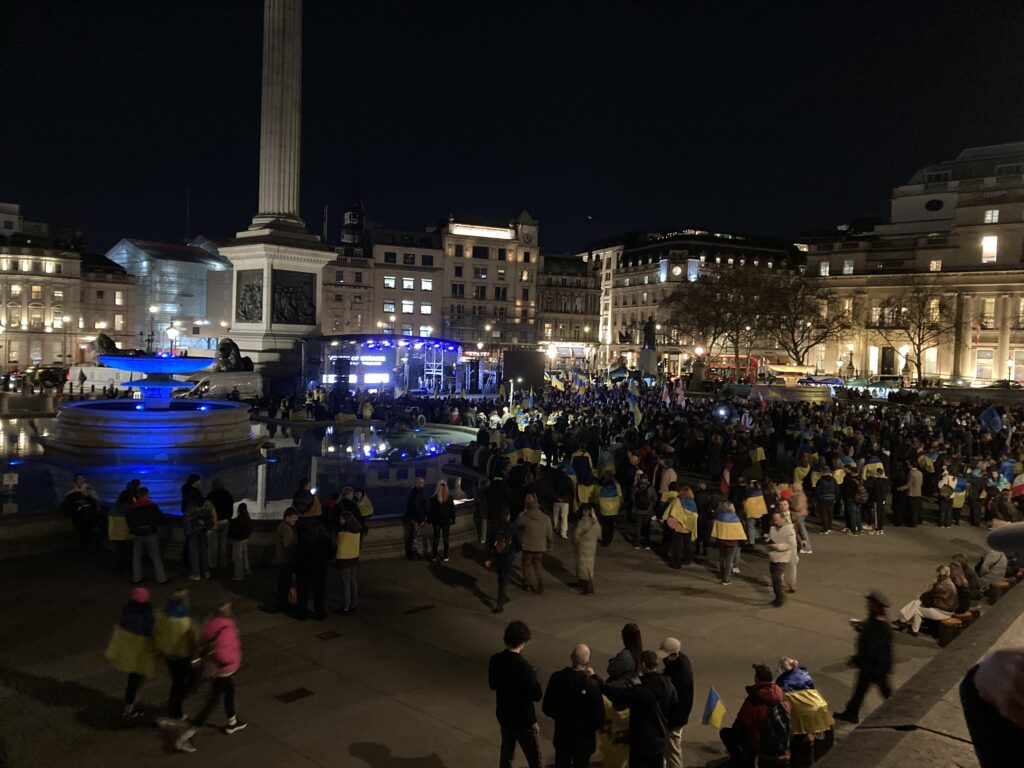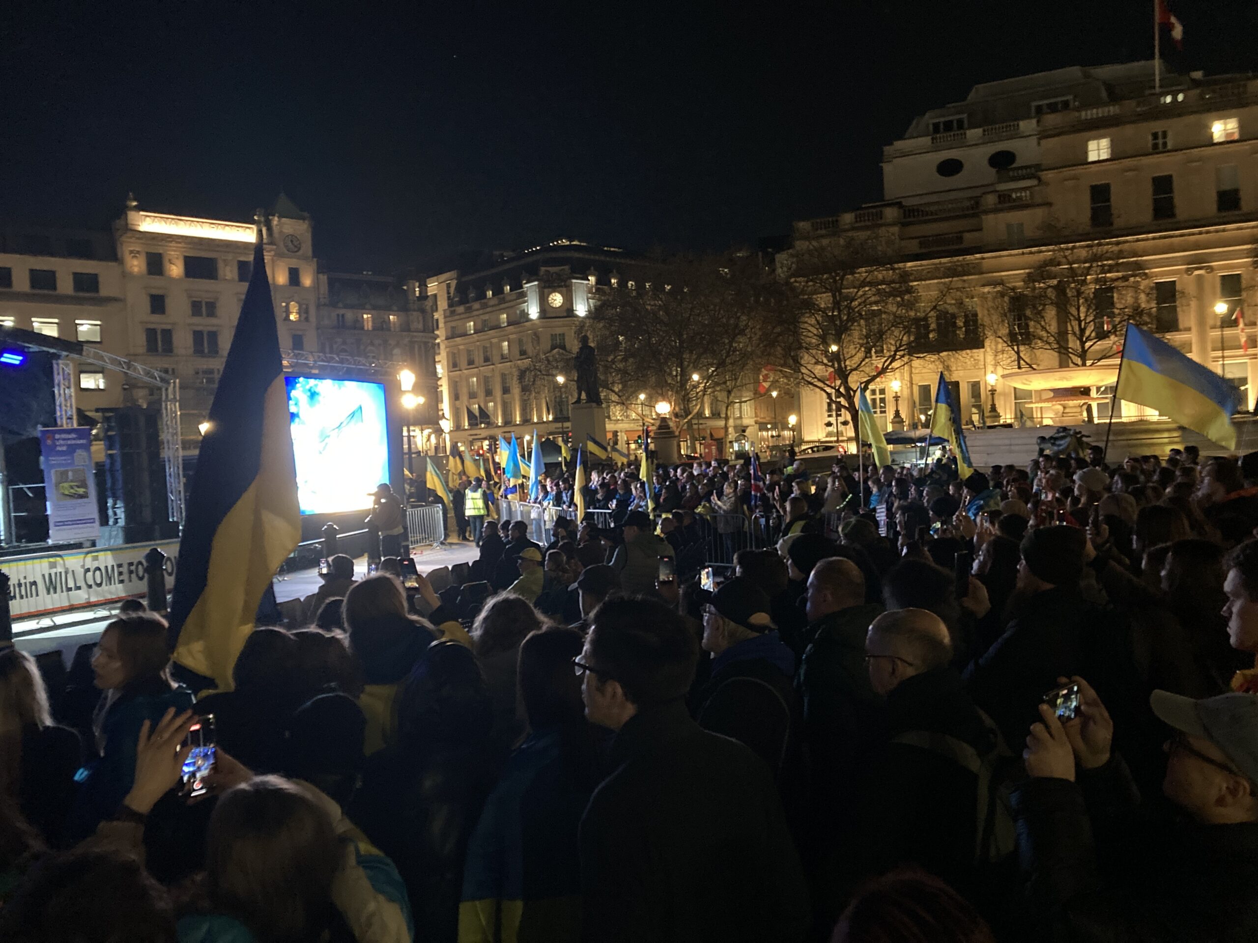 На Трафальгарській площі було встановлено сцену та огородження, і можна було побачити дуже багато – десятки, якщо не сотні – українських прапорів. Також український прапор був поряд на посольстві Канади праворуч від площі (від Національного музею). Люди, які прийшли на акцію, могли дивитися з сходів музею або зайти за огорожу з сек’юріті. Якщо чесно, я зовсім не зрозуміла цю огорожу – охорона нічого не перевіряла. Усіх, хто прийшов до 18 години, а я була серед таких, хто прийшов за годину до початку, пропустили без огляду. Праворуч від сцени були намети організаторів — я не змогла до них сходити, тому що в цьому випадку втратила б своє місце для зйомки біля сцени. Усередині огорожі були стільці для почесних гостей та учасників заходу. Там ходили журналісти та блогери, періодично вони зупинялися навпроти мого телефону та закривали зйомку.