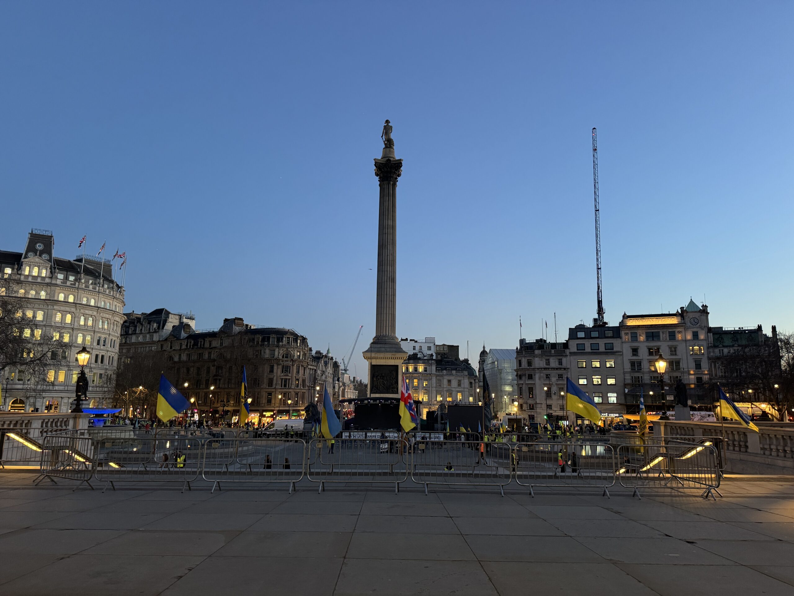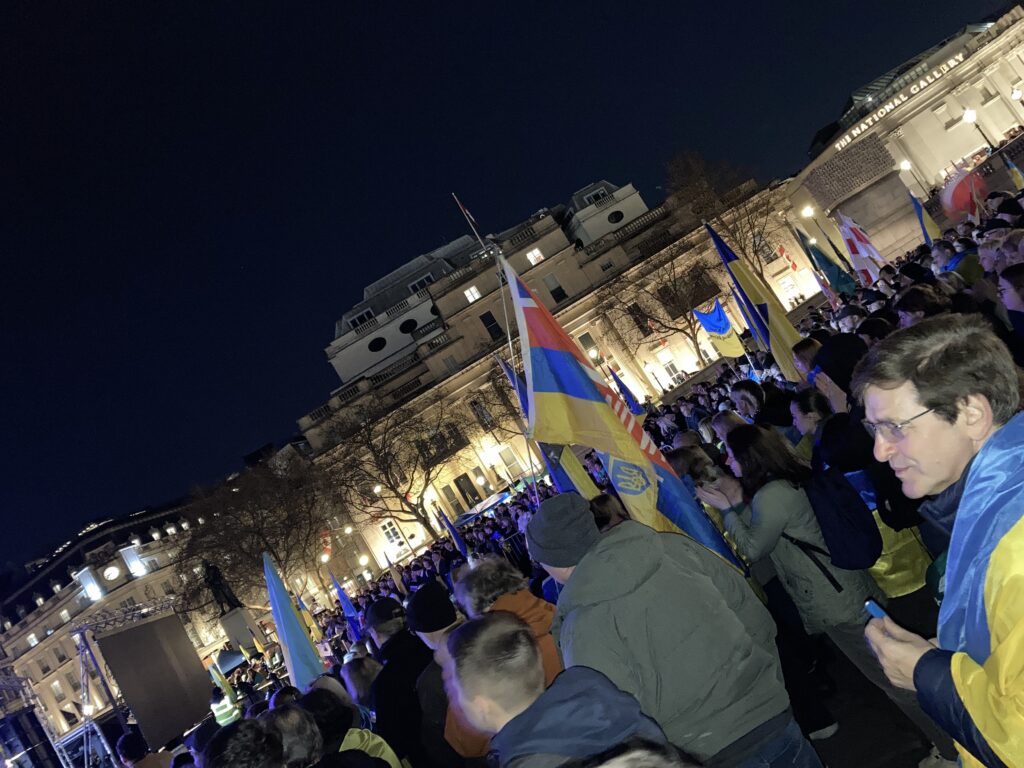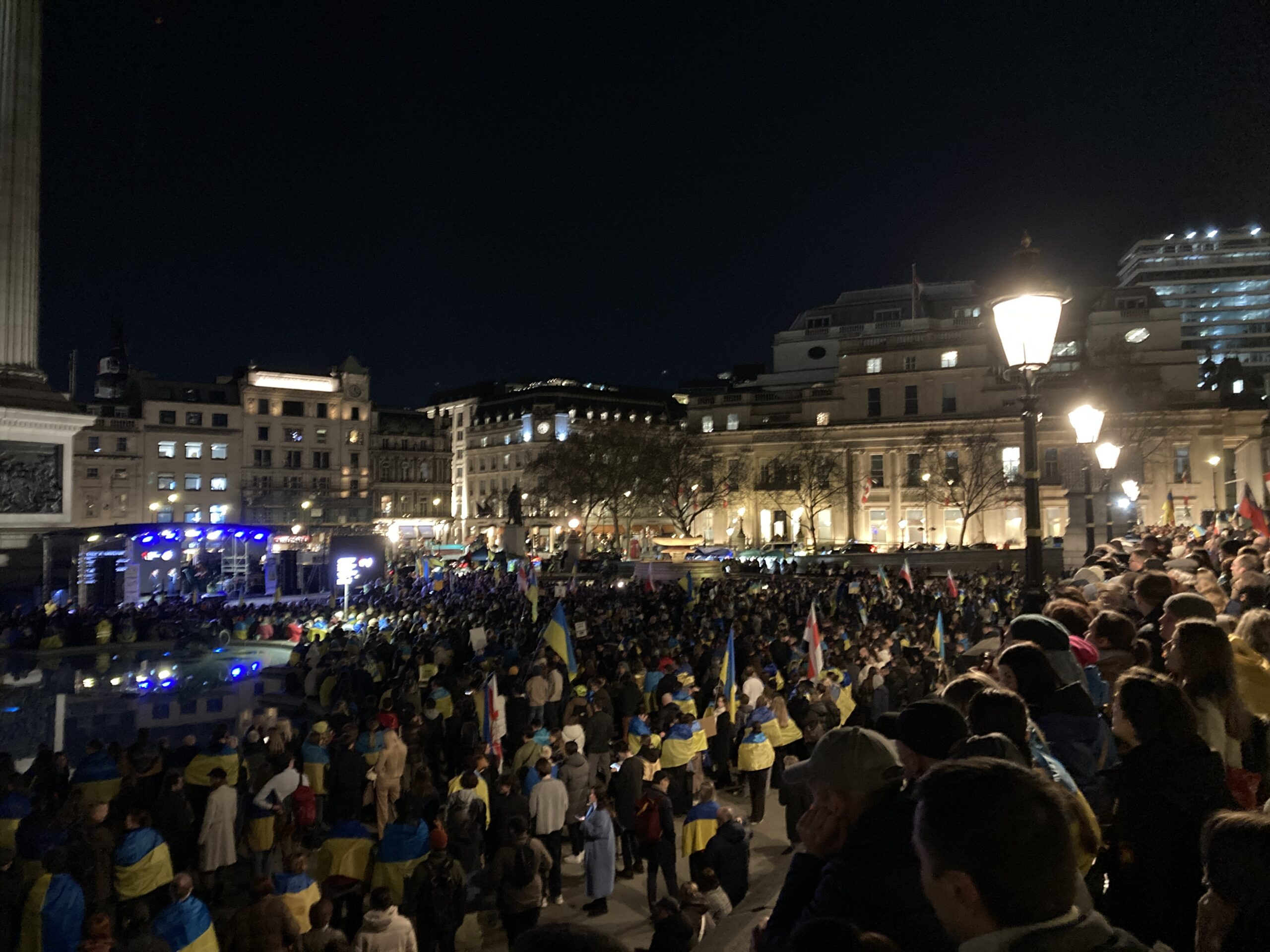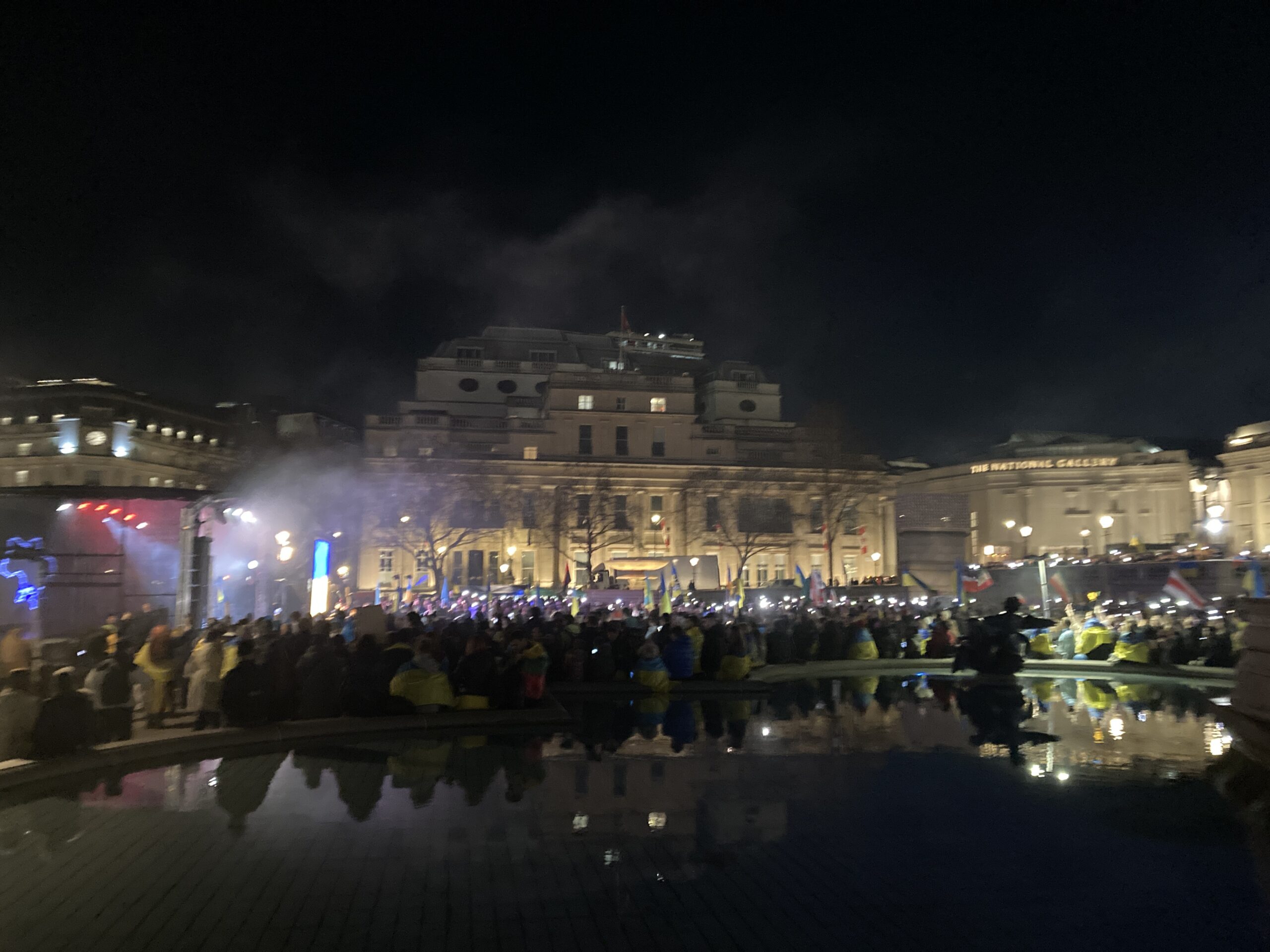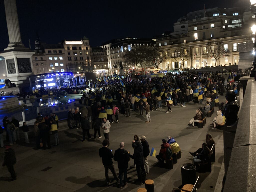 На Трафальгарській площі було встановлено сцену та огородження, і можна було побачити дуже багато – десятки, якщо не сотні – українських прапорів. Також український прапор був поряд на посольстві Канади праворуч від площі (від Національного музею). Люди, які прийшли на акцію, могли дивитися з сходів музею або зайти за огорожу з сек’юріті. Якщо чесно, я зовсім не зрозуміла цю огорожу – охорона нічого не перевіряла. Усіх, хто прийшов до 18 години, а я була серед таких, хто прийшов за годину до початку, пропустили без огляду. Праворуч від сцени були намети організаторів — я не змогла до них сходити, тому що в цьому випадку втратила б своє місце для зйомки біля сцени. Усередині огорожі були стільці для почесних гостей та учасників заходу. Там ходили журналісти та блогери, періодично вони зупинялися навпроти мого телефону та закривали зйомку.