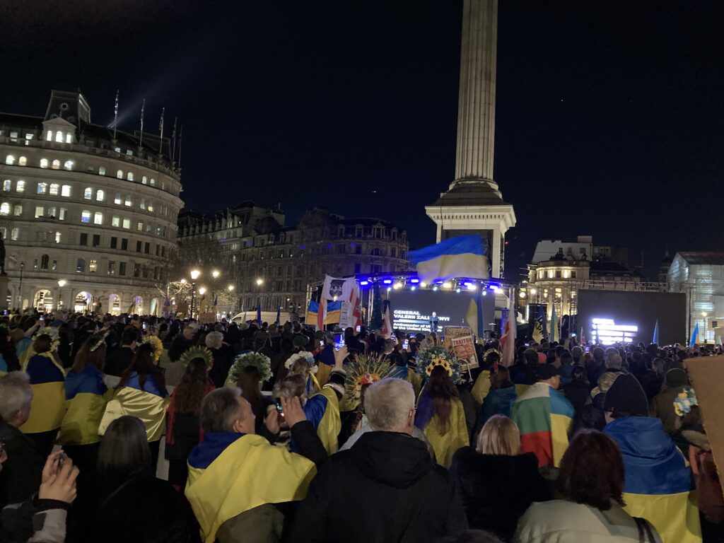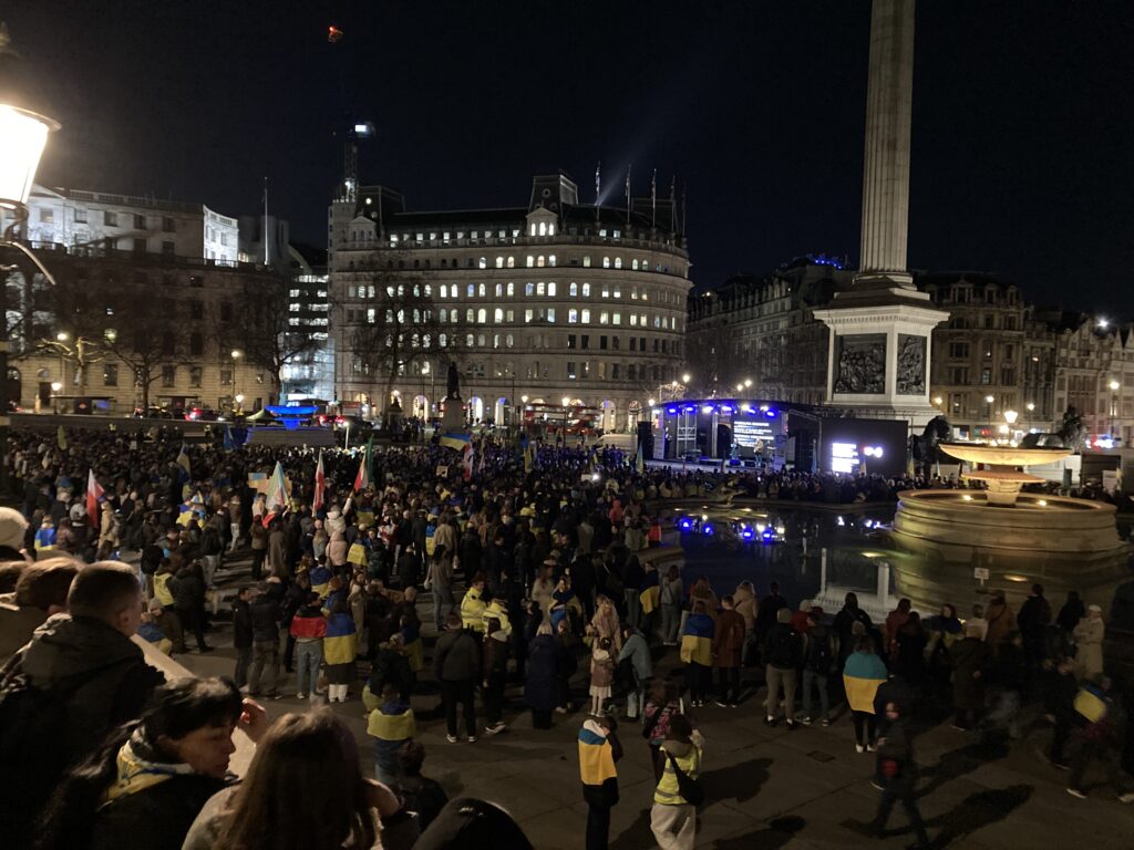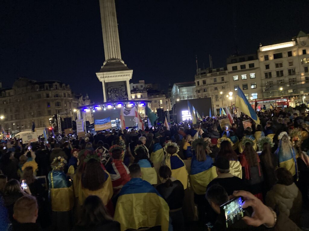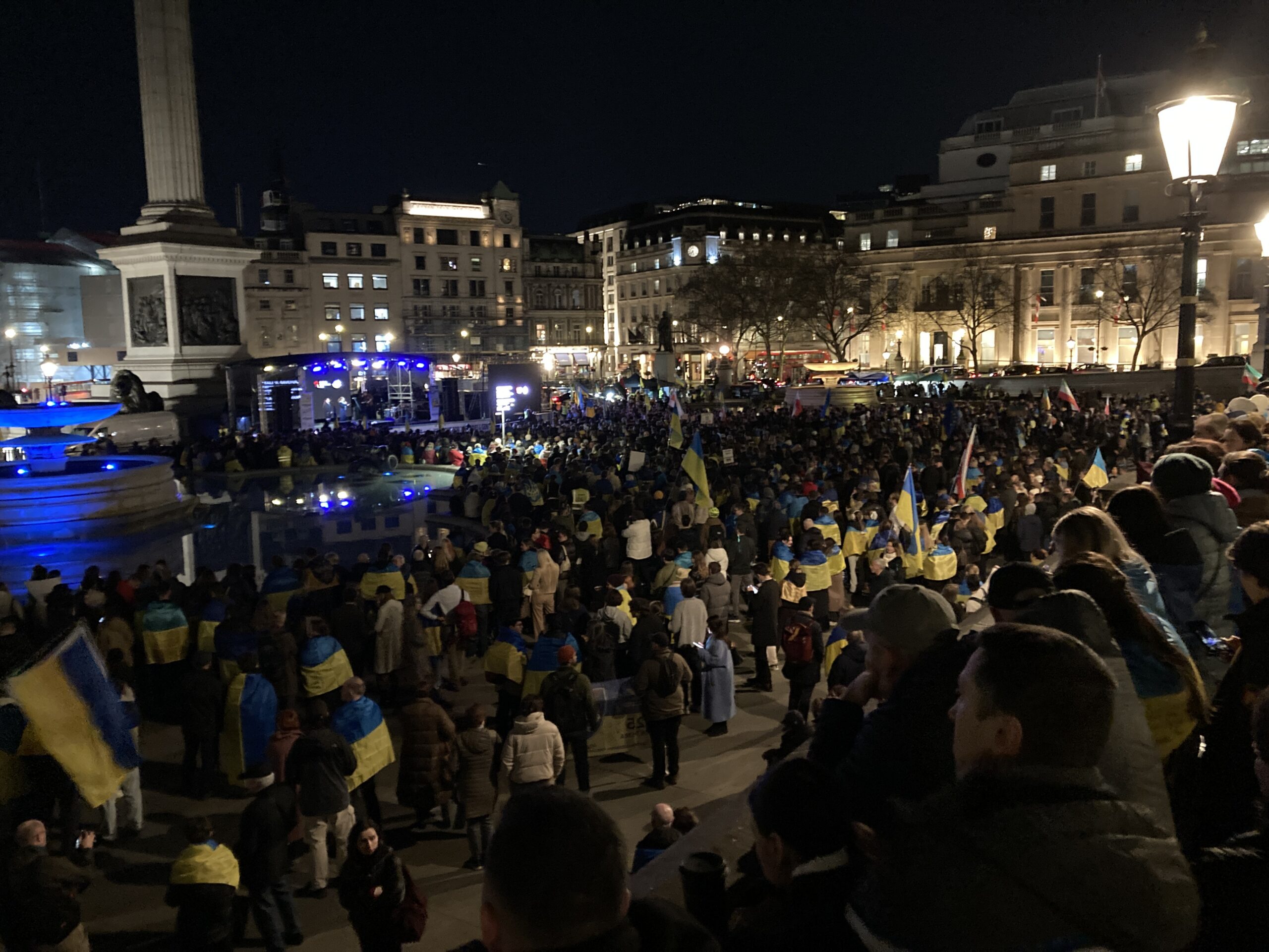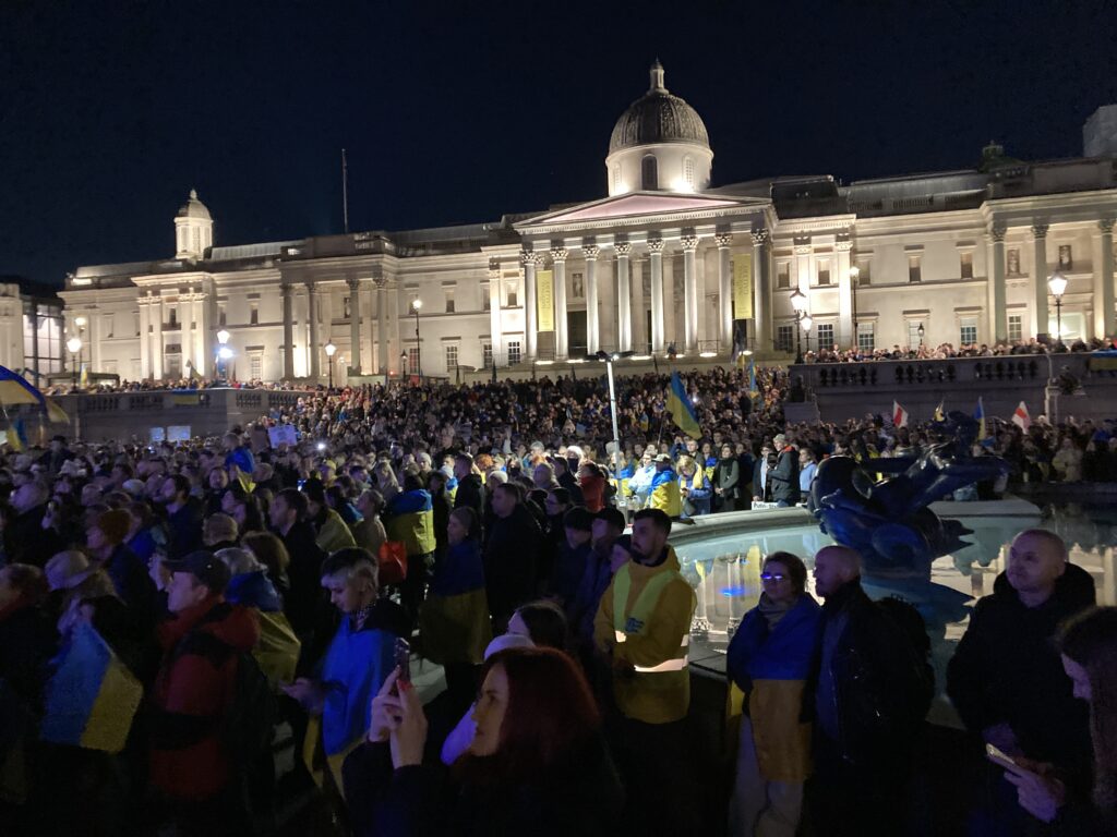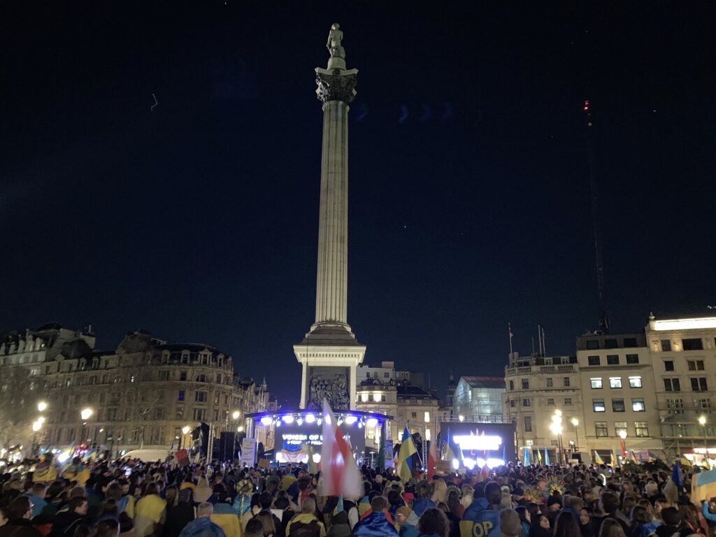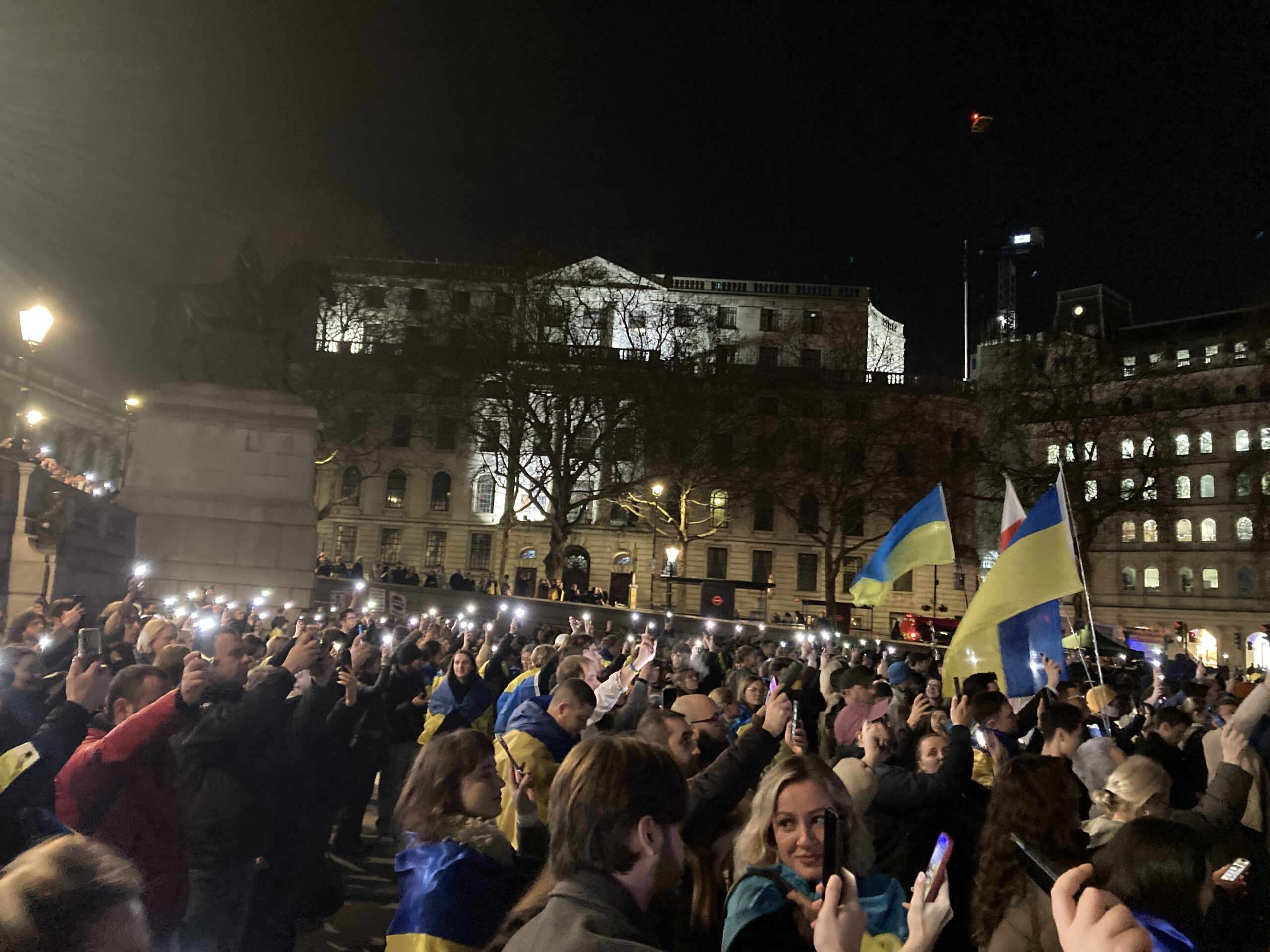 На Трафальгарській площі було встановлено сцену та огородження, і можна було побачити дуже багато – десятки, якщо не сотні – українських прапорів. Також український прапор був поряд на посольстві Канади праворуч від площі (від Національного музею). Люди, які прийшли на акцію, могли дивитися з сходів музею або зайти за огорожу з сек’юріті. Якщо чесно, я зовсім не зрозуміла цю огорожу – охорона нічого не перевіряла. Усіх, хто прийшов до 18 години, а я була серед таких, хто прийшов за годину до початку, пропустили без огляду. Праворуч від сцени були намети організаторів — я не змогла до них сходити, тому що в цьому випадку втратила б своє місце для зйомки біля сцени. Усередині огорожі були стільці для почесних гостей та учасників заходу. Там ходили журналісти та блогери, періодично вони зупинялися навпроти мого телефону та закривали зйомку.