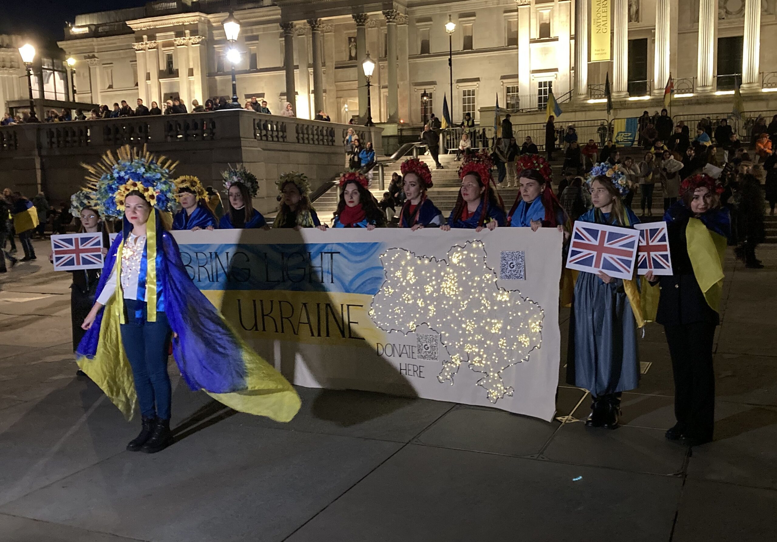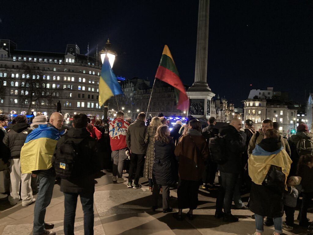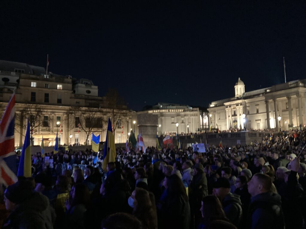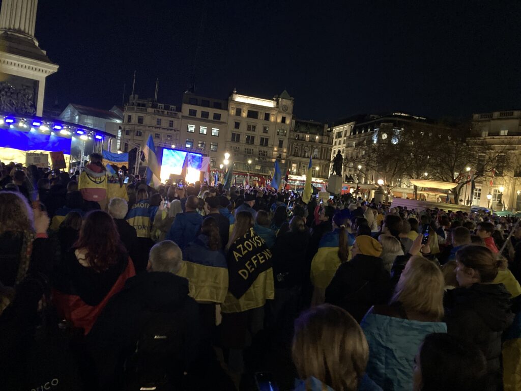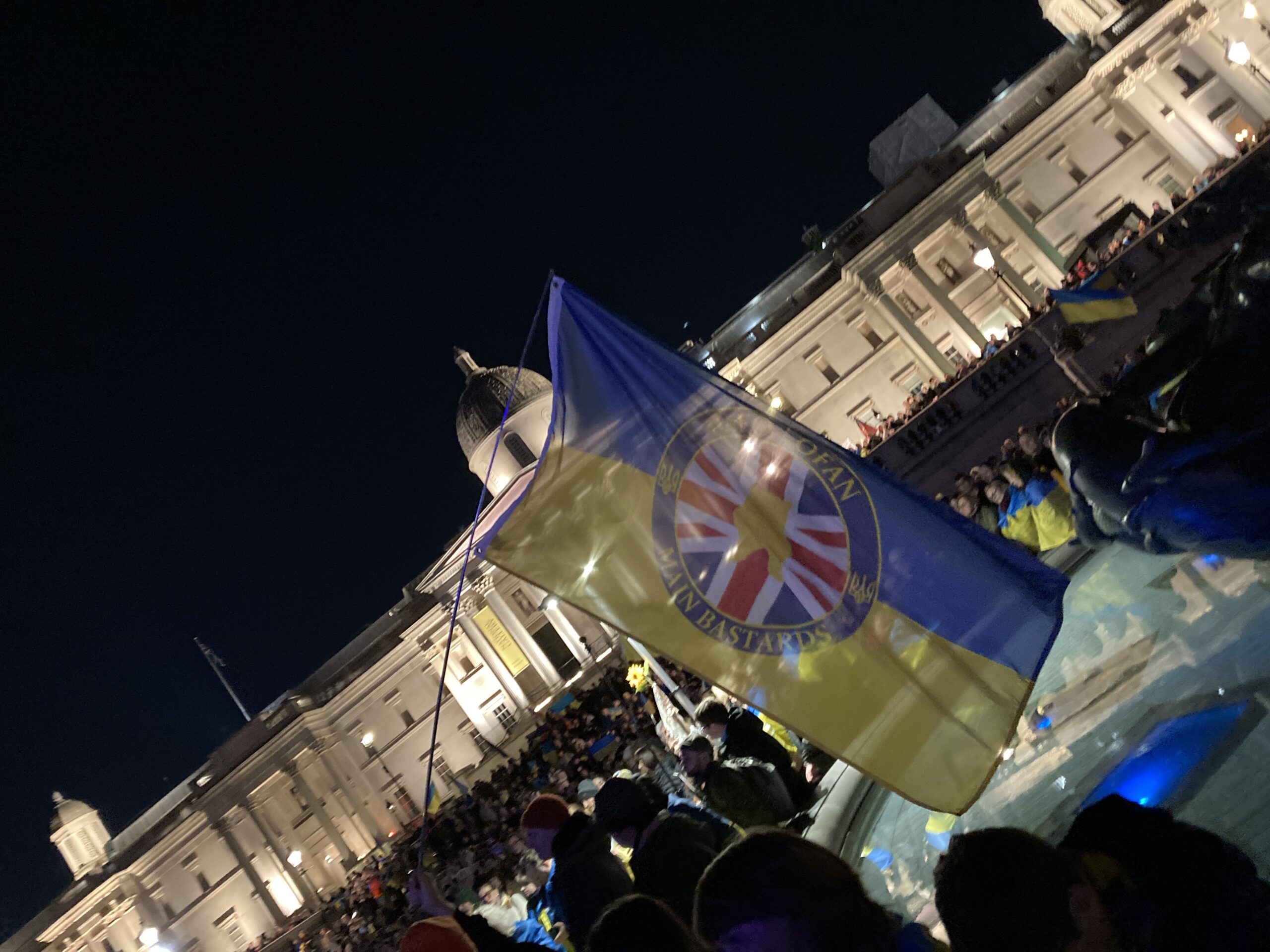 На Трафальгарській площі було встановлено сцену та огородження, і можна було побачити дуже багато – десятки, якщо не сотні – українських прапорів. Також український прапор був поряд на посольстві Канади праворуч від площі (від Національного музею). Люди, які прийшли на акцію, могли дивитися з сходів музею або зайти за огорожу з сек’юріті. Якщо чесно, я зовсім не зрозуміла цю огорожу – охорона нічого не перевіряла. Усіх, хто прийшов до 18 години, а я була серед таких, хто прийшов за годину до початку, пропустили без огляду. Праворуч від сцени були намети організаторів — я не змогла до них сходити, тому що в цьому випадку втратила б своє місце для зйомки біля сцени. Усередині огорожі були стільці для почесних гостей та учасників заходу. Там ходили журналісти та блогери, періодично вони зупинялися навпроти мого телефону та закривали зйомку.