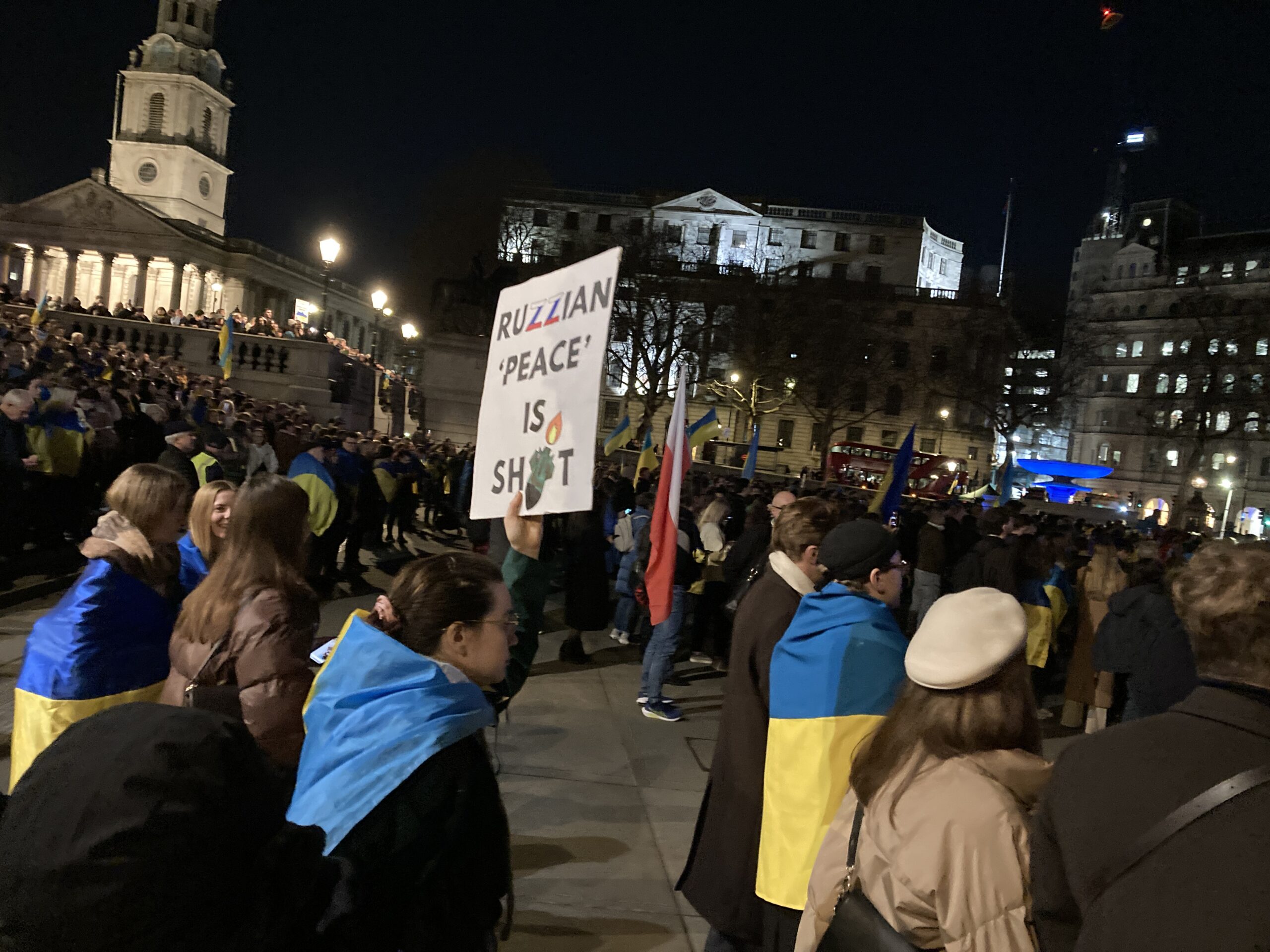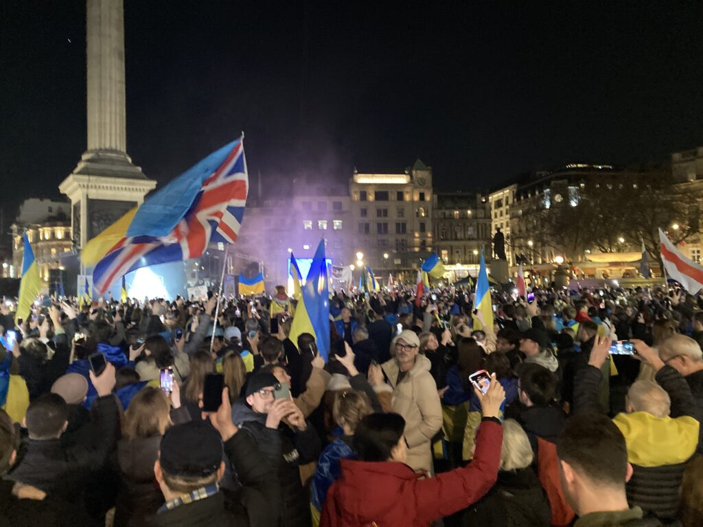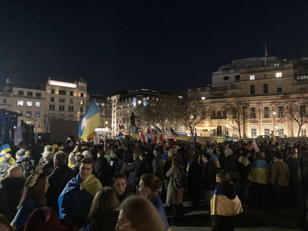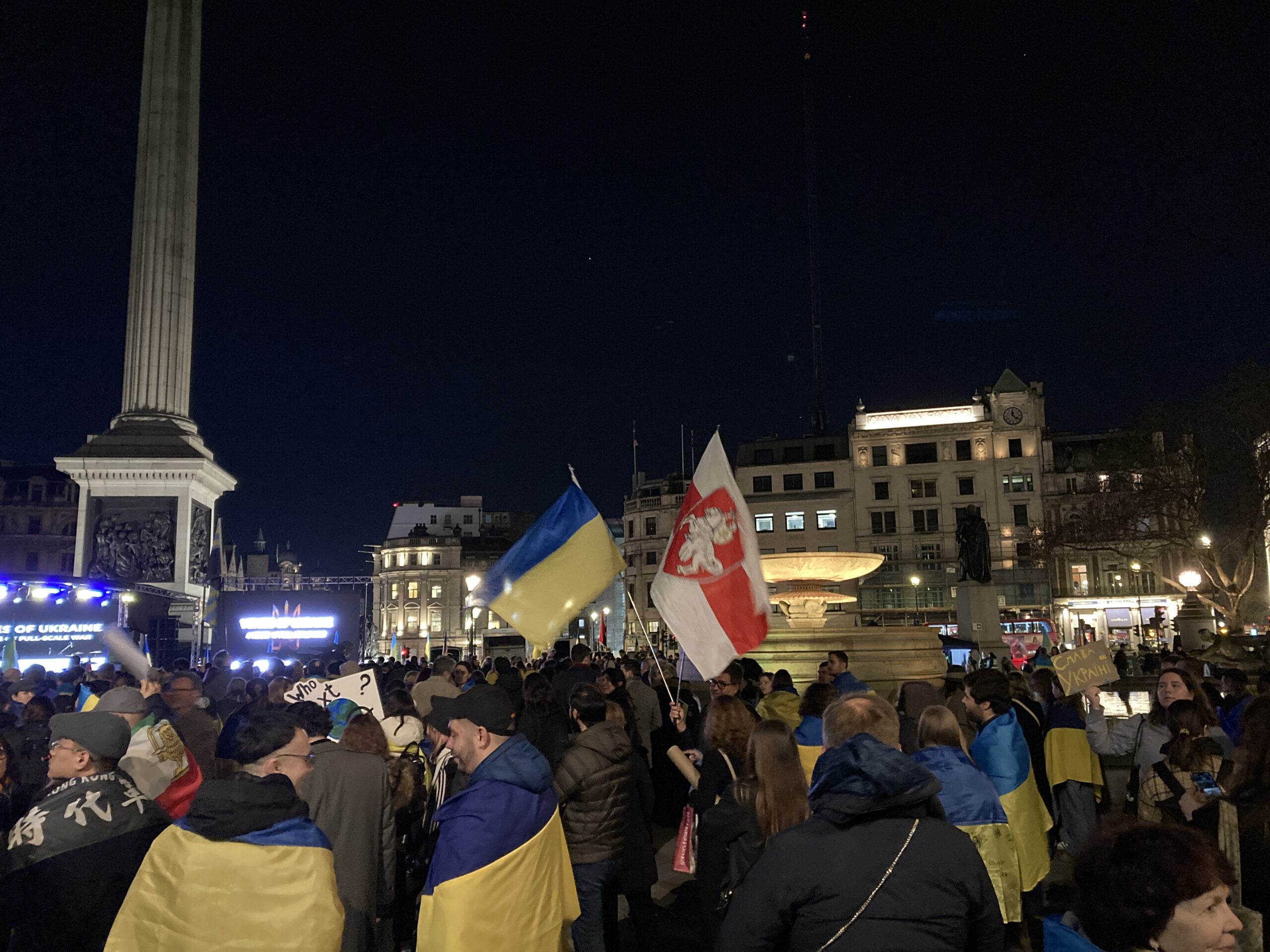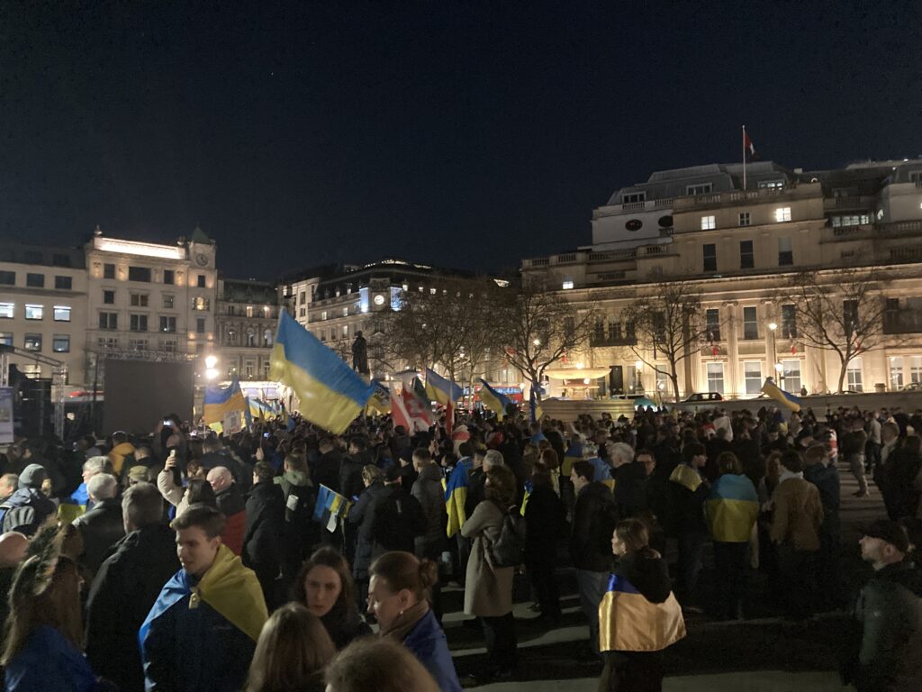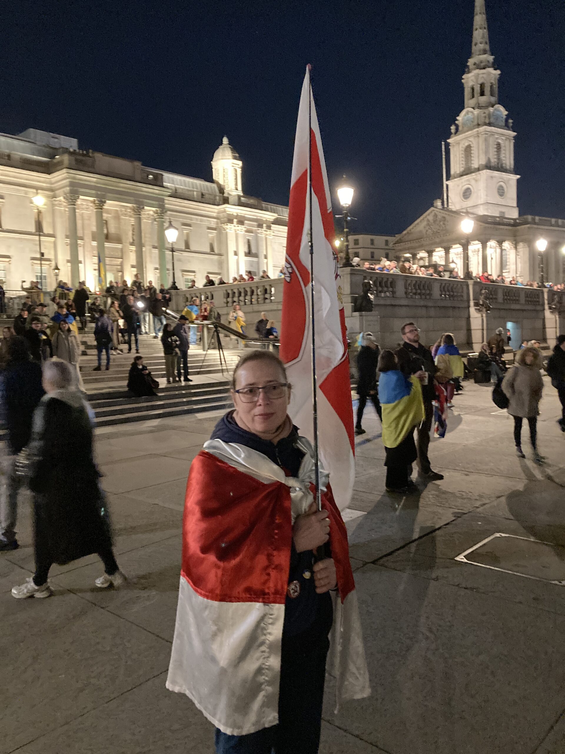 На Трафальгарській площі було встановлено сцену та огородження, і можна було побачити дуже багато – десятки, якщо не сотні – українських прапорів. Також український прапор був поряд на посольстві Канади праворуч від площі (від Національного музею). Люди, які прийшли на акцію, могли дивитися з сходів музею або зайти за огорожу з сек’юріті. Якщо чесно, я зовсім не зрозуміла цю огорожу – охорона нічого не перевіряла. Усіх, хто прийшов до 18 години, а я була серед таких, хто прийшов за годину до початку, пропустили без огляду. Праворуч від сцени були намети організаторів — я не змогла до них сходити, тому що в цьому випадку втратила б своє місце для зйомки біля сцени. Усередині огорожі були стільці для почесних гостей та учасників заходу. Там ходили журналісти та блогери, періодично вони зупинялися навпроти мого телефону та закривали зйомку.