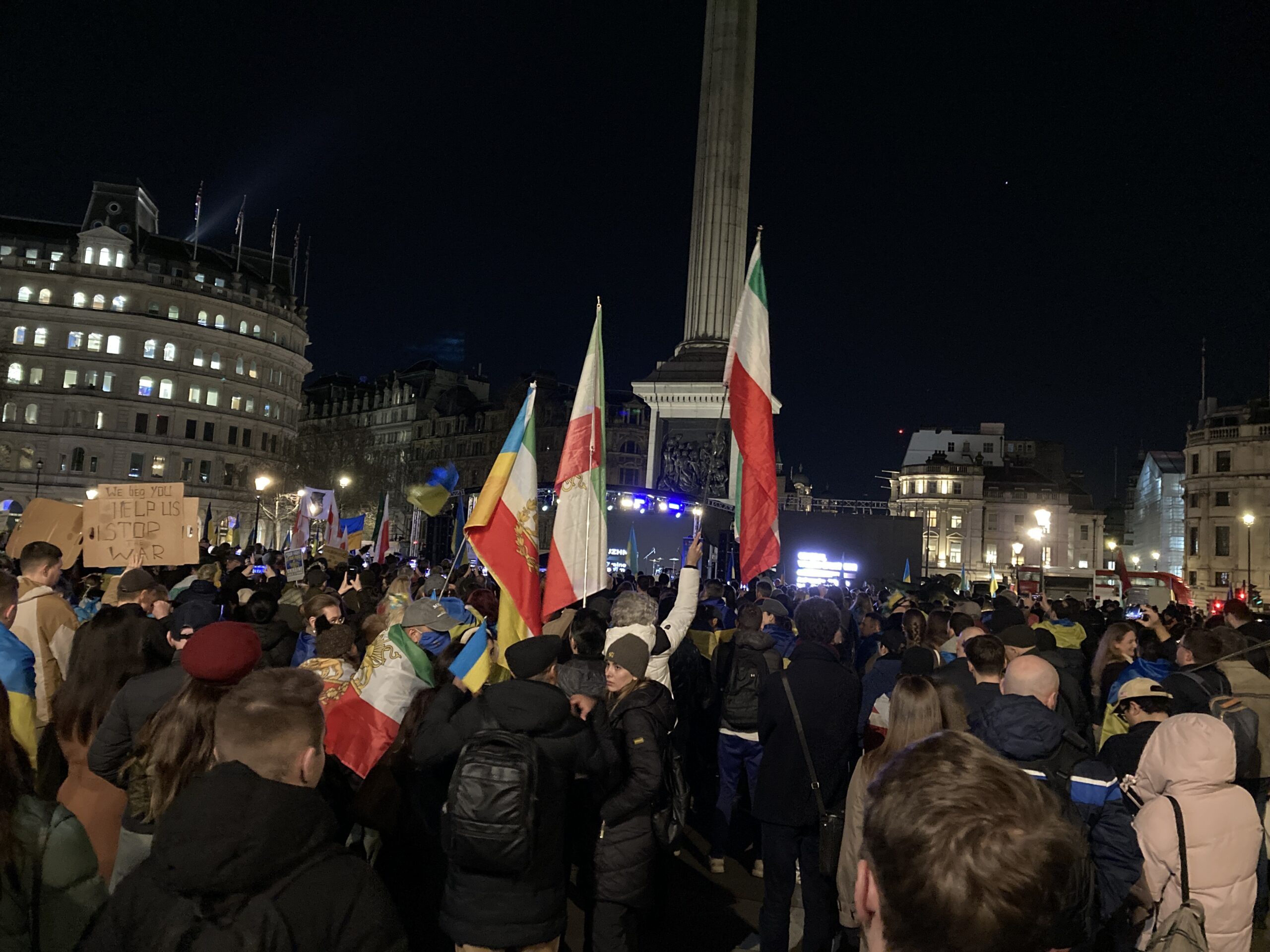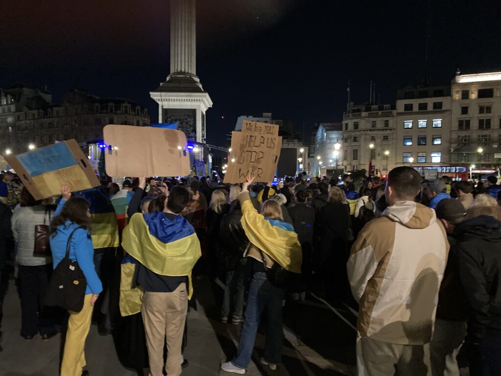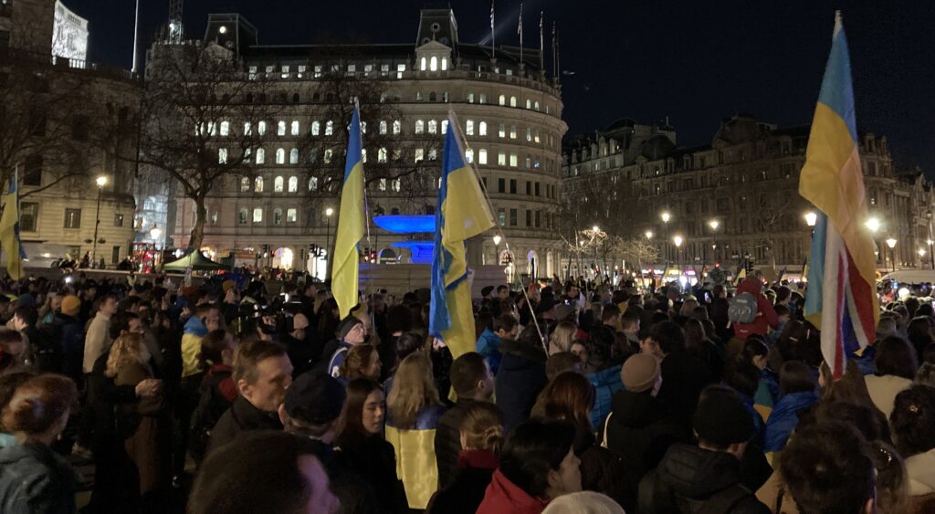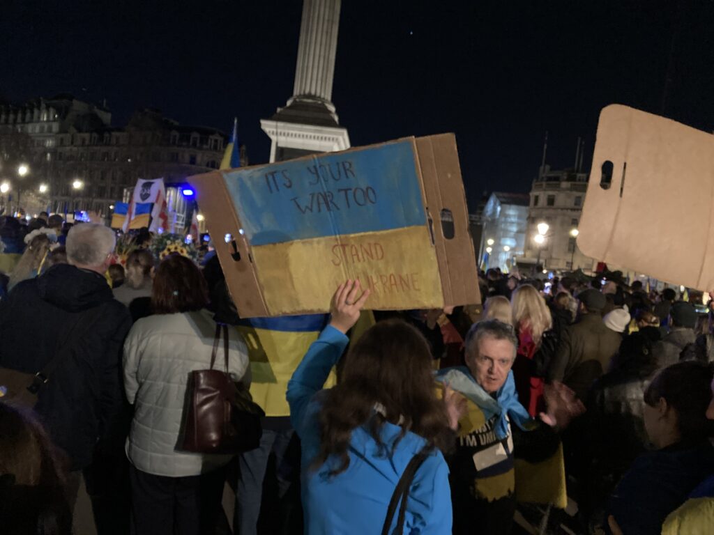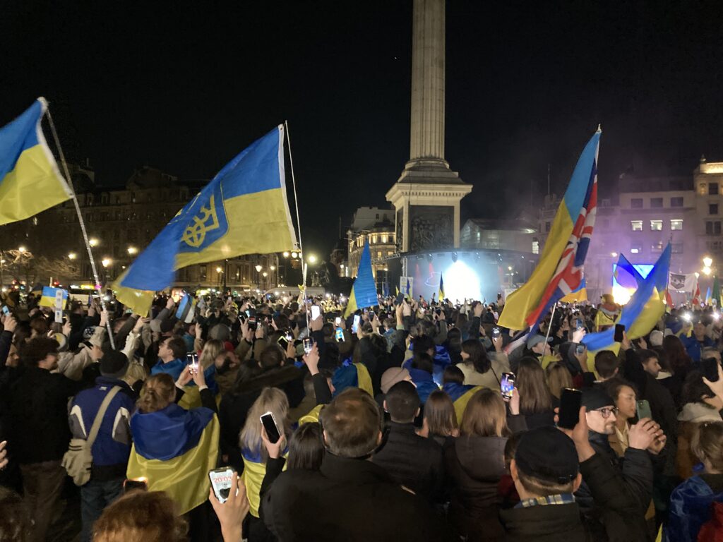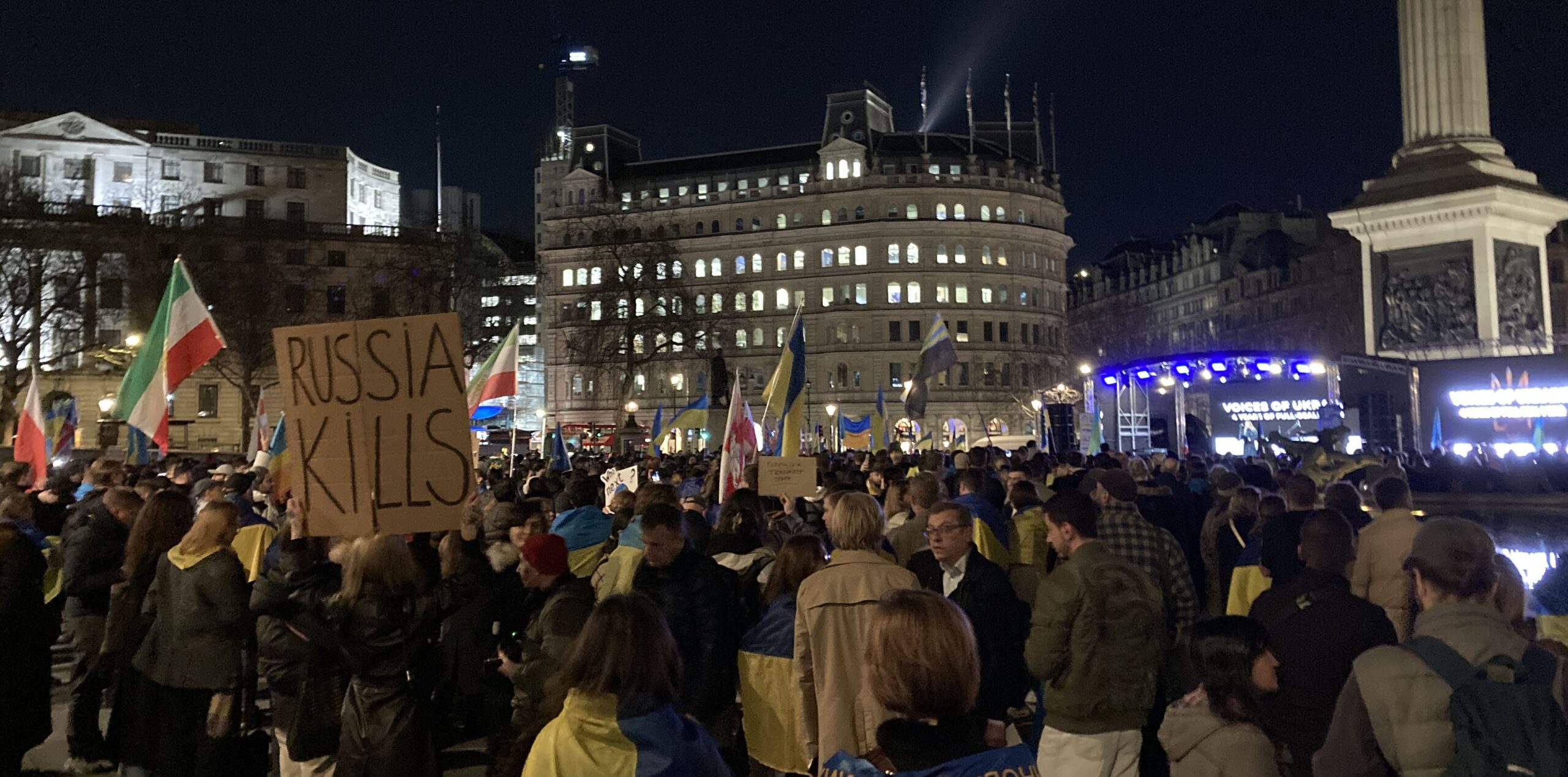 На Трафальгарській площі було встановлено сцену та огородження, і можна було побачити дуже багато – десятки, якщо не сотні – українських прапорів. Також український прапор був поряд на посольстві Канади праворуч від площі (від Національного музею). Люди, які прийшли на акцію, могли дивитися з сходів музею або зайти за огорожу з сек’юріті. Якщо чесно, я зовсім не зрозуміла цю огорожу – охорона нічого не перевіряла. Усіх, хто прийшов до 18 години, а я була серед таких, хто прийшов за годину до початку, пропустили без огляду. Праворуч від сцени були намети організаторів — я не змогла до них сходити, тому що в цьому випадку втратила б своє місце для зйомки біля сцени. Усередині огорожі були стільці для почесних гостей та учасників заходу. Там ходили журналісти та блогери, періодично вони зупинялися навпроти мого телефону та закривали зйомку.